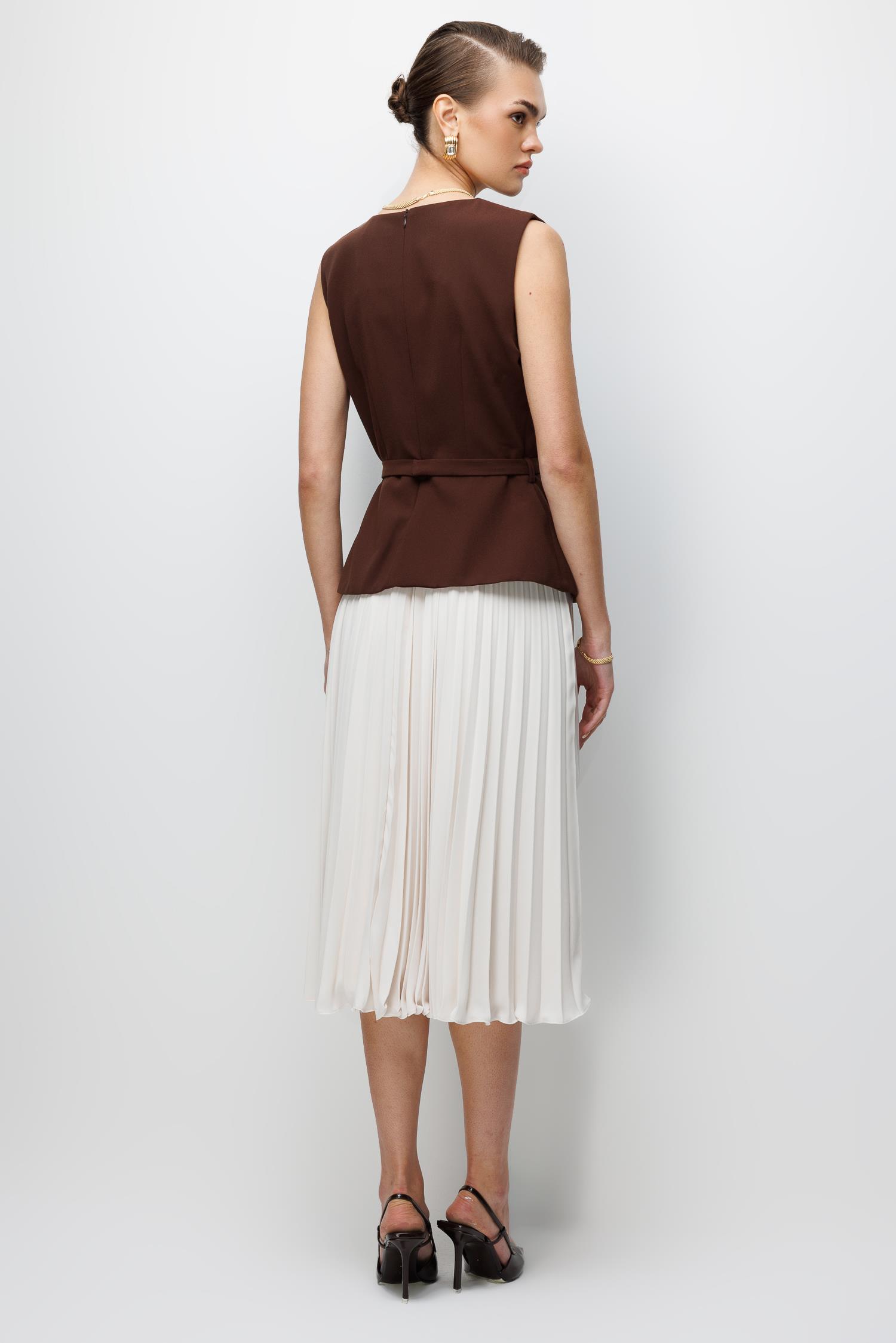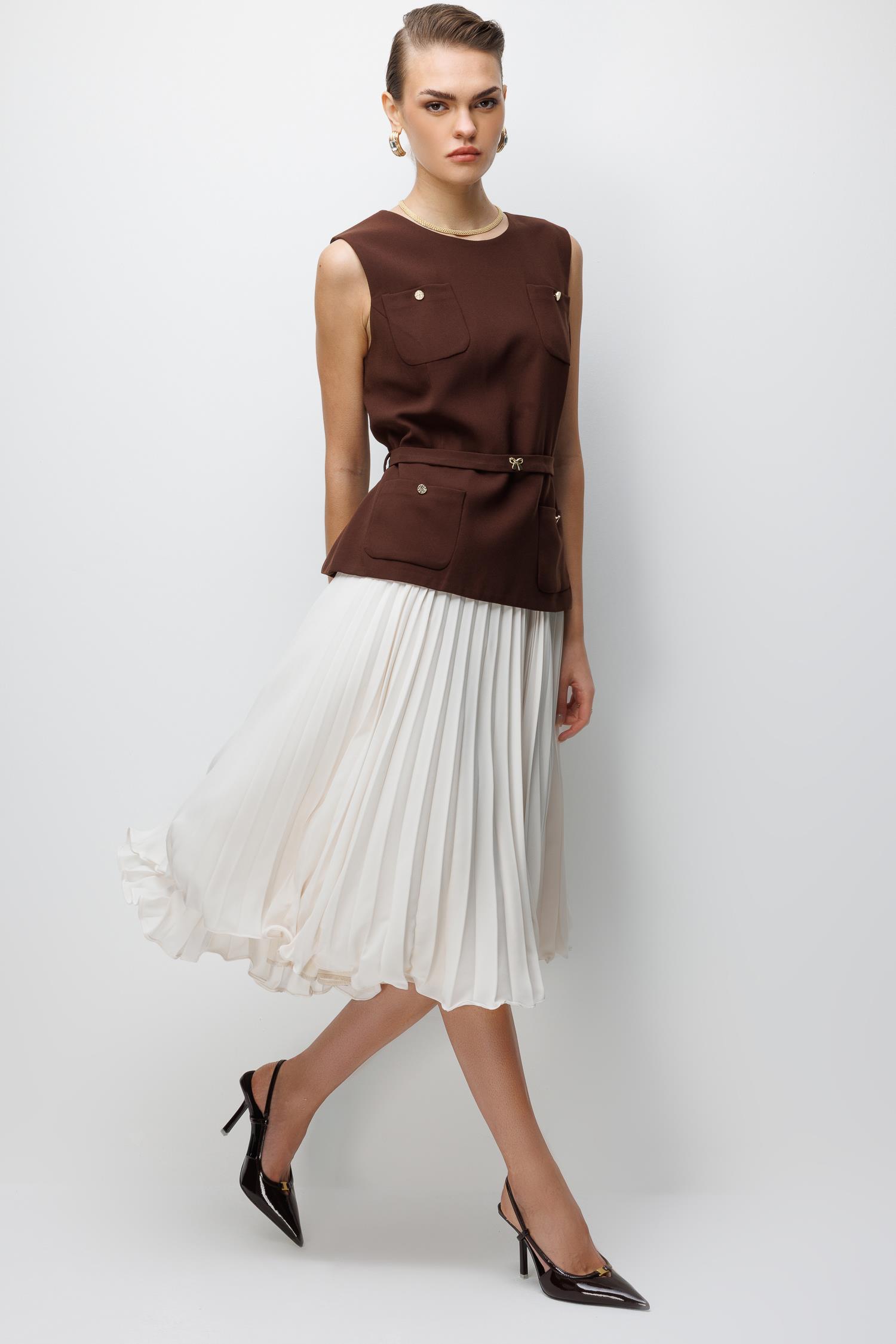 Toprak tonlarının sıcaklığını modern bir tasarımla birleştiren bu takım, kahverengi yelek bluzun çarpıcı detaylarını, bembeyaz pileli eteğin dinamik yapısıyla buluşturuyor. Özel günlerinizde veya şık davetlerde fark yaratmak isteyenler için vazgeçilmez bir parça.