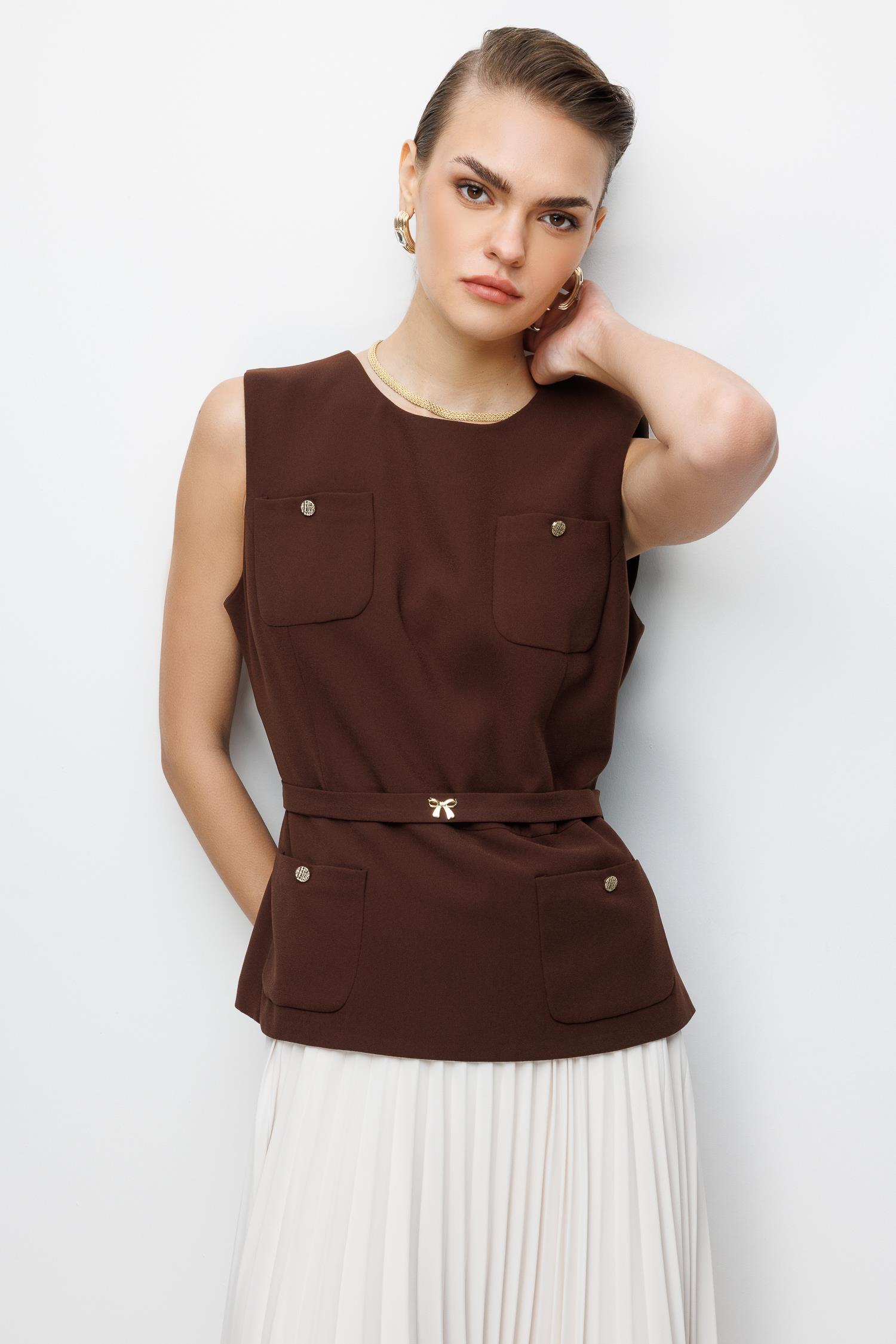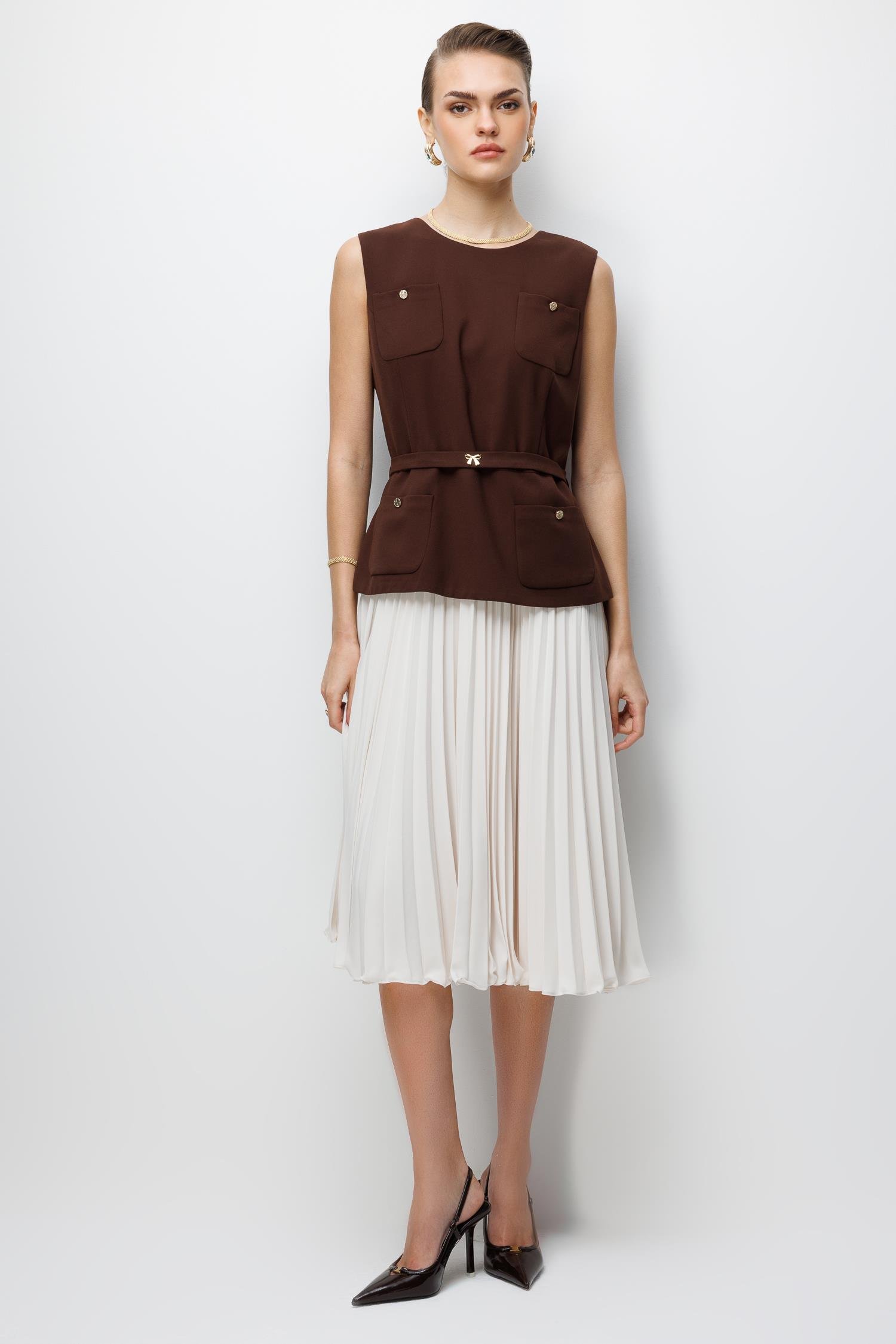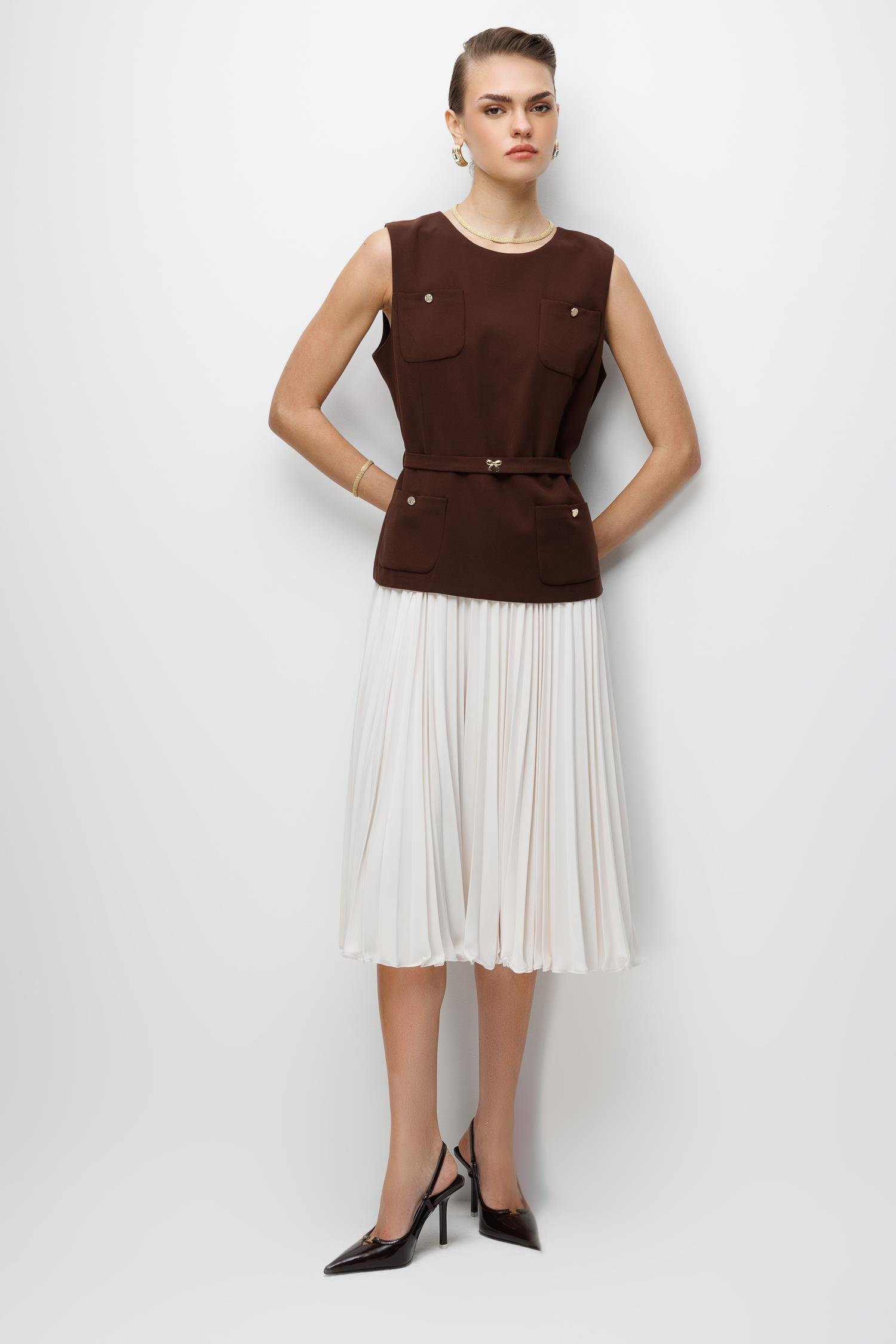 Tasarım: Aksesuar detaylı yelek bluz ve pileli etek