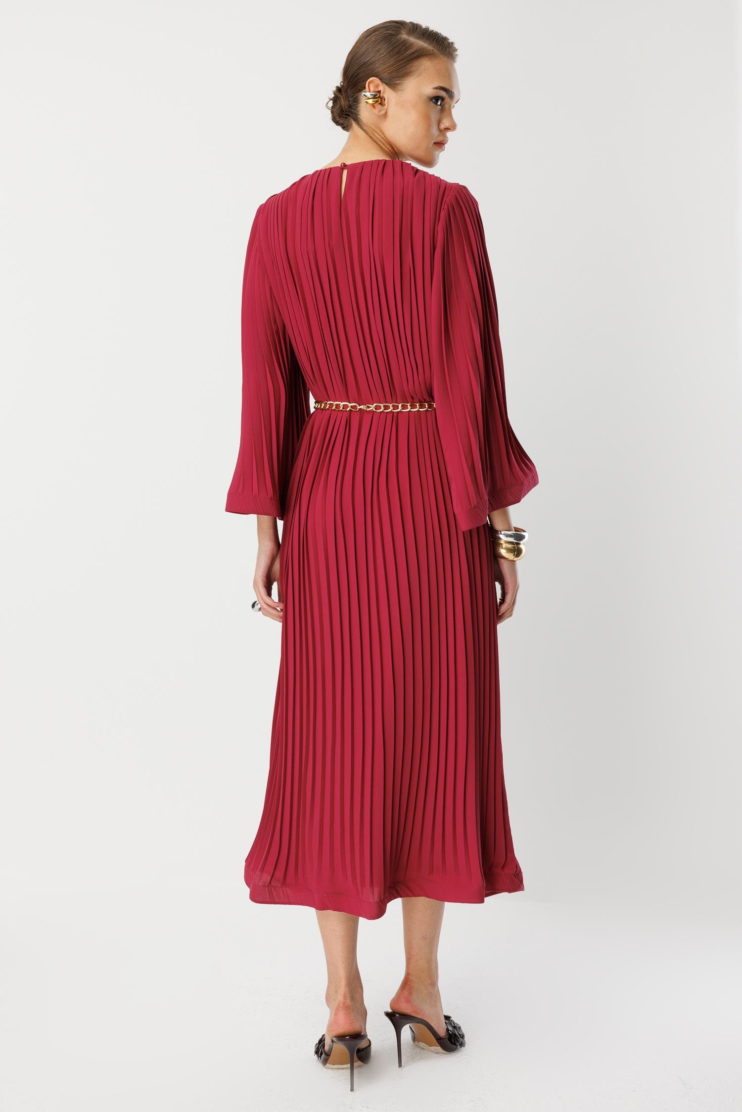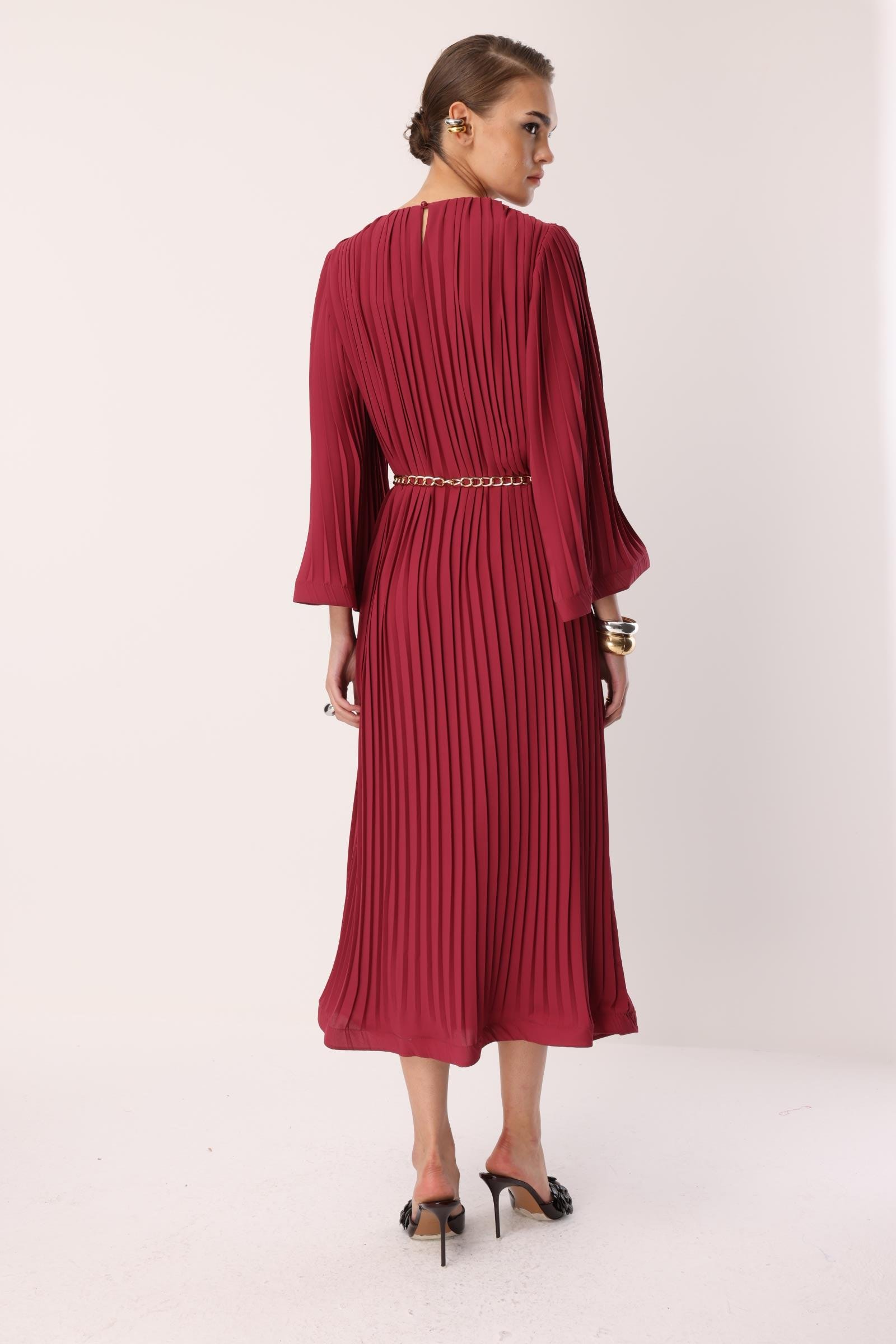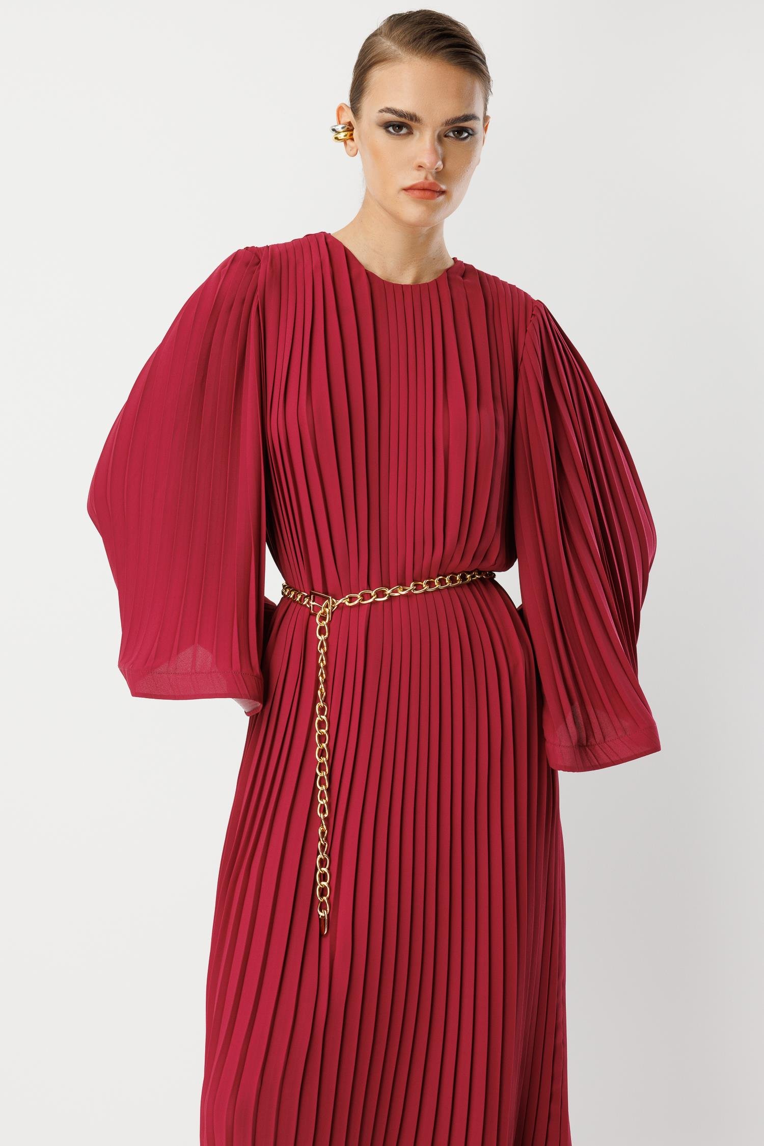 Akışkan Pilili Kumaş: Ürünün tamamında kullanılan ince plise (pile) detayı, elbiseye derinlik ve dinamik bir hareket katar.