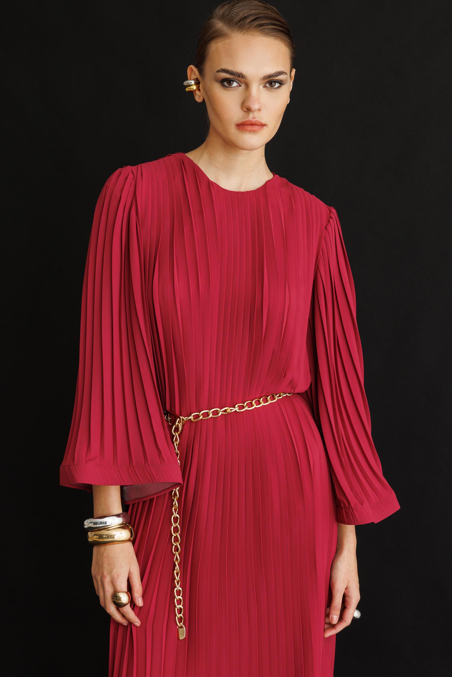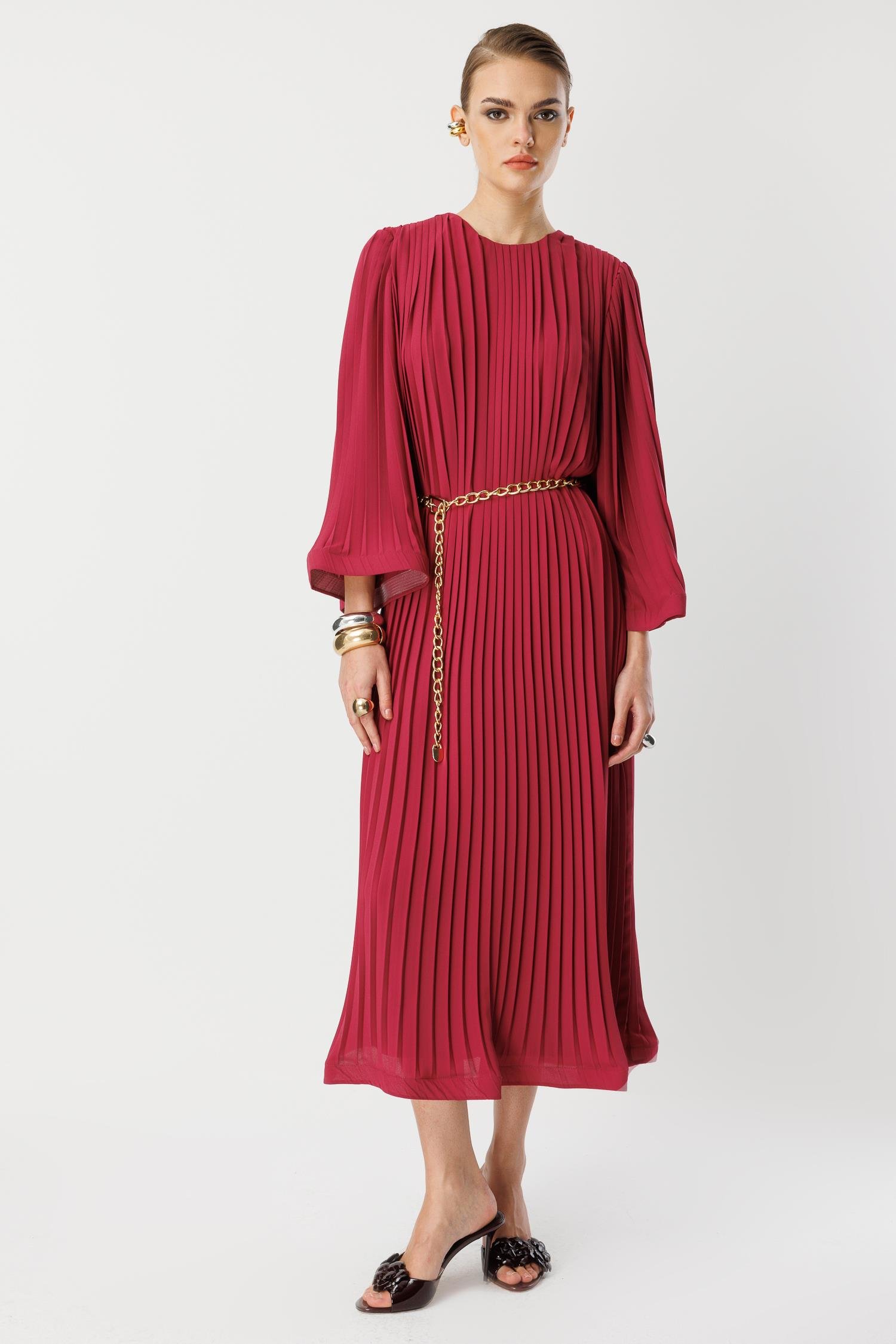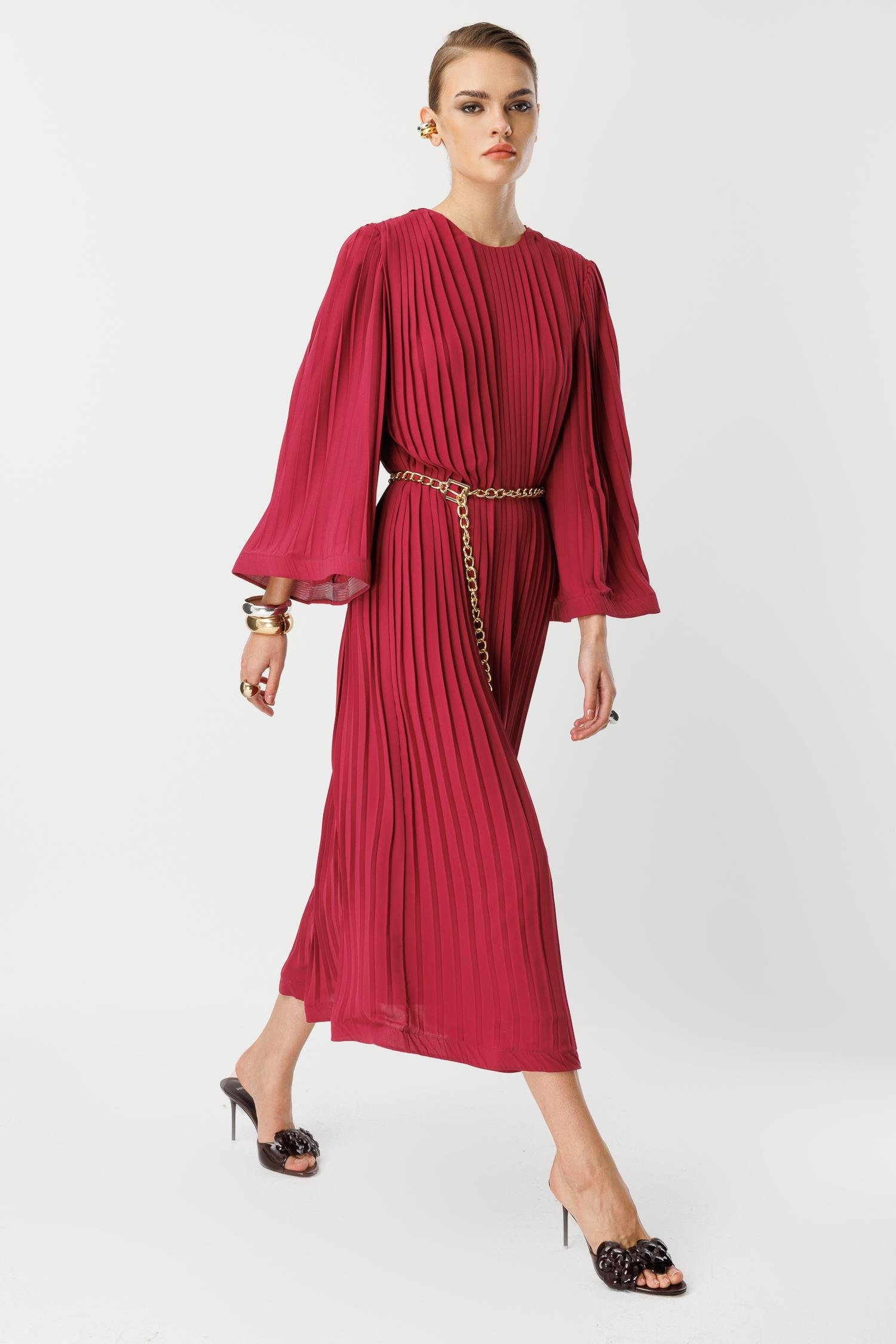 Hareketli dokusu ve romantik rengiyle tüm bakışları üzerinize çekecek bir tasarım. Mürdüm ve gül kurusu arası zengin tondaki bu midi elbise, baştan aşağı ince pilili (plise) kumaşı sayesinde her adımınızda akışkan ve dinamik bir silüet yaratır. Yüksek yaka ve dökümlü kol detayları ile retro şıklığı modern bir yorumla buluşturuyor.