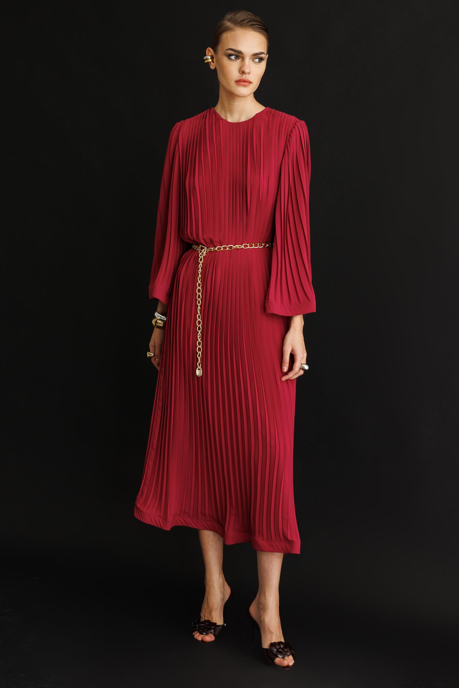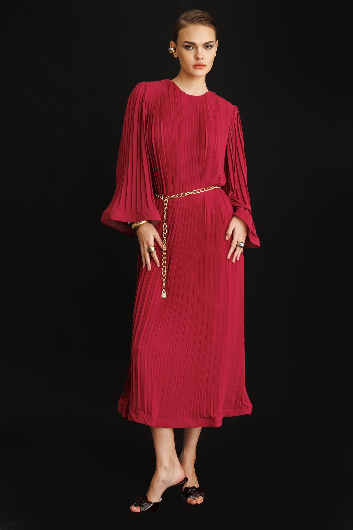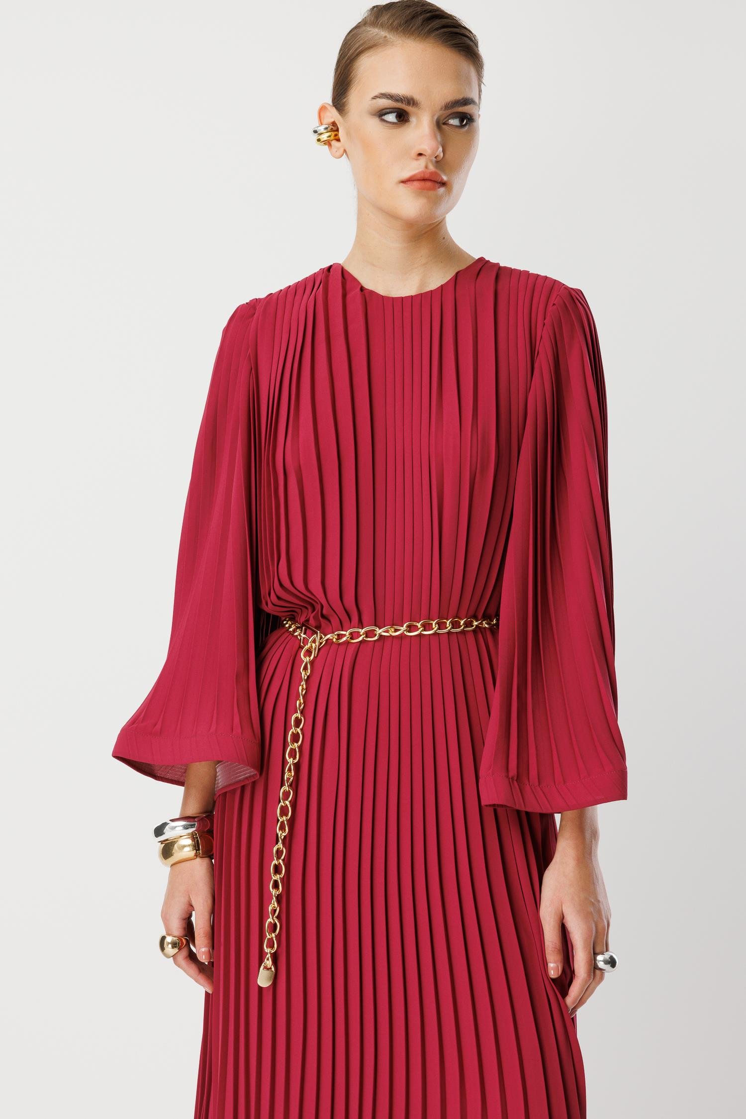Hareketli dokusu ve romantik rengiyle tüm bakışları üzerinize çekecek bir tasarım. Mürdüm ve gül kurusu arası zengin tondaki bu midi elbise, baştan aşağı ince pilili (plise) kumaşı sayesinde her adımınızda akışkan ve dinamik bir silüet yaratır. Yüksek yaka ve dökümlü kol detayları ile retro şıklığı modern bir yorumla buluşturuyor.