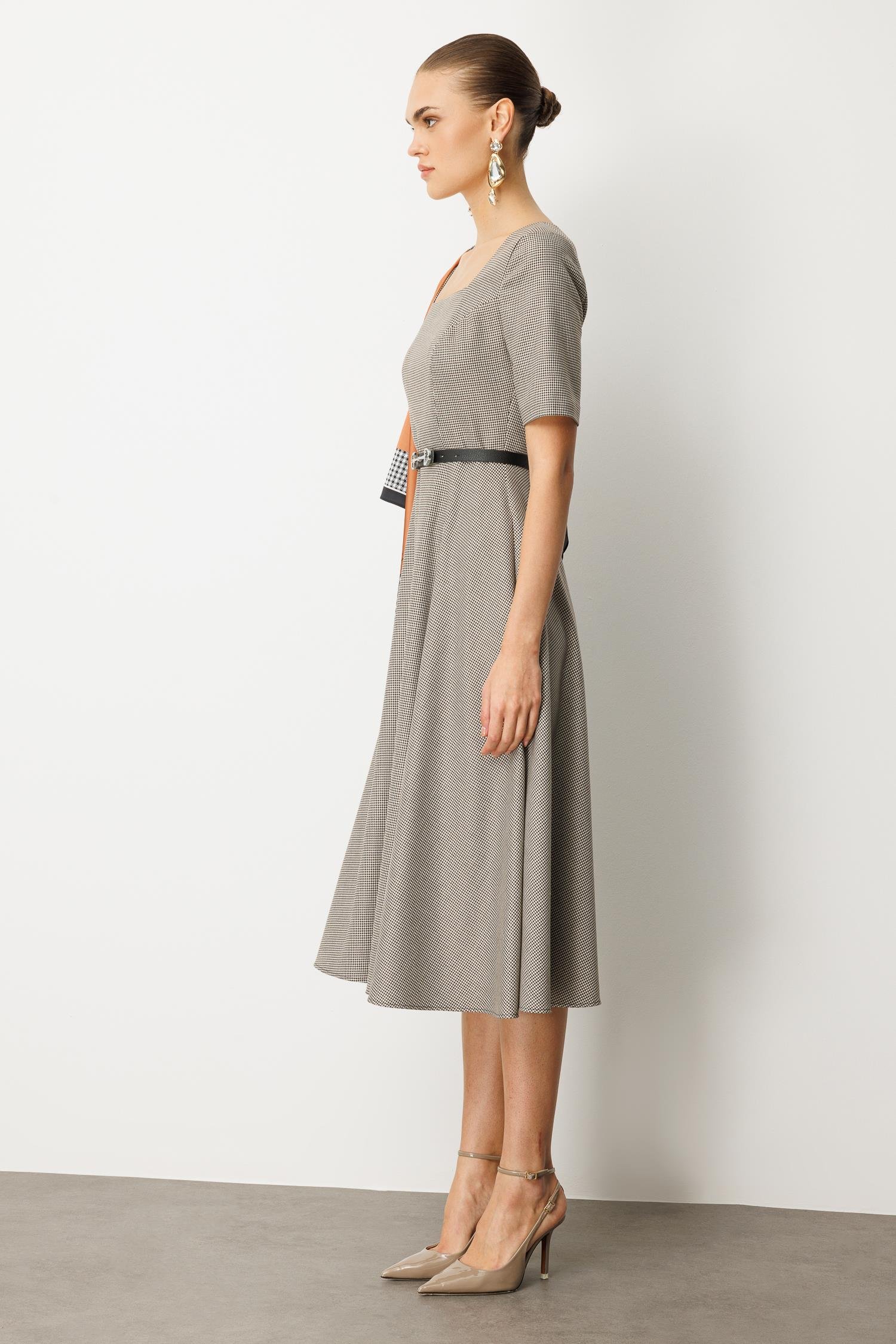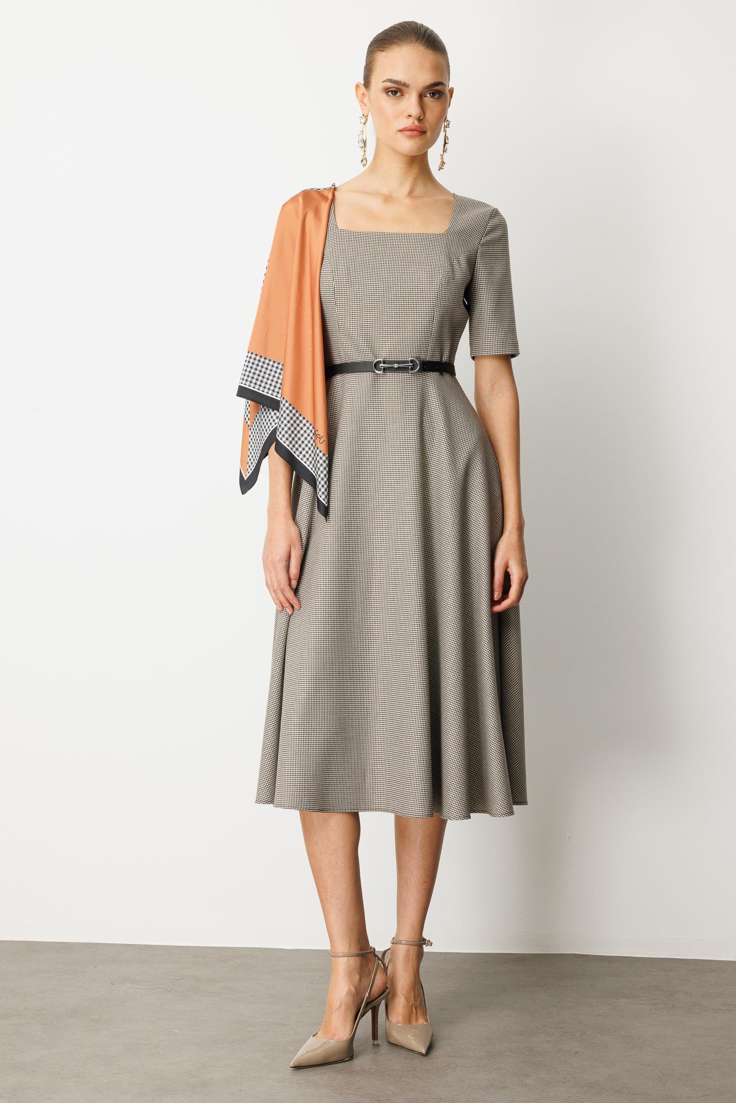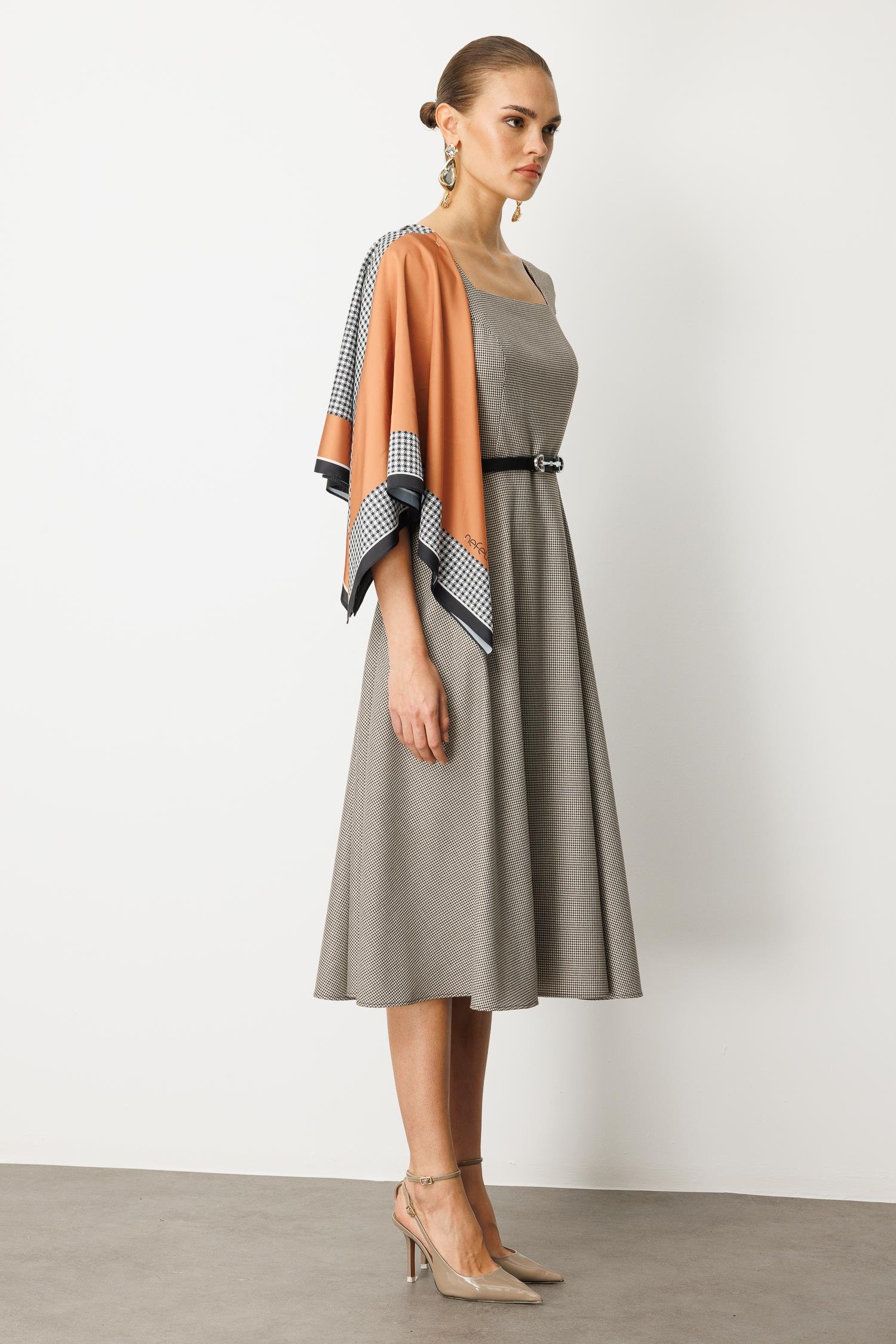 Zamansız şıklığın anahtarı bu sette! Klasik kazayağı (pepita) desenli bu midi elbise, uyumlu kemer ve kontrast eşarp detayıyla stilinizi zahmetsizce üst seviyeye taşıyor. Bu set, tek parça şıklık arayan modern Nefeli kadını için tasarlandı.