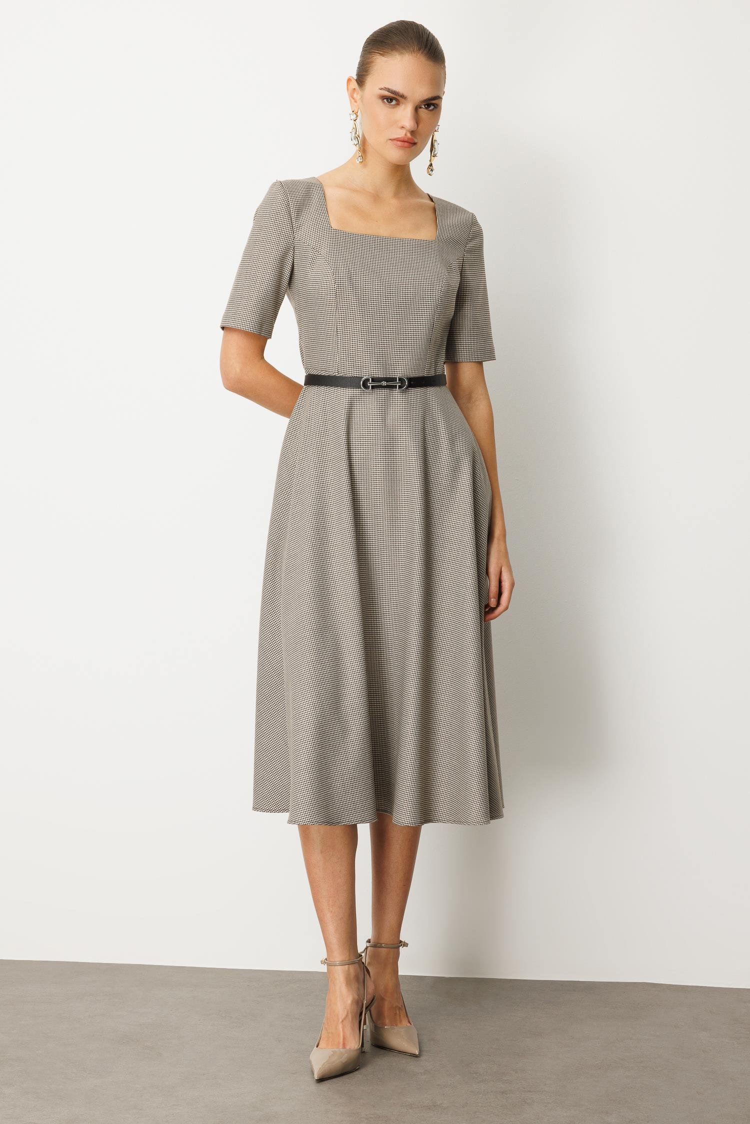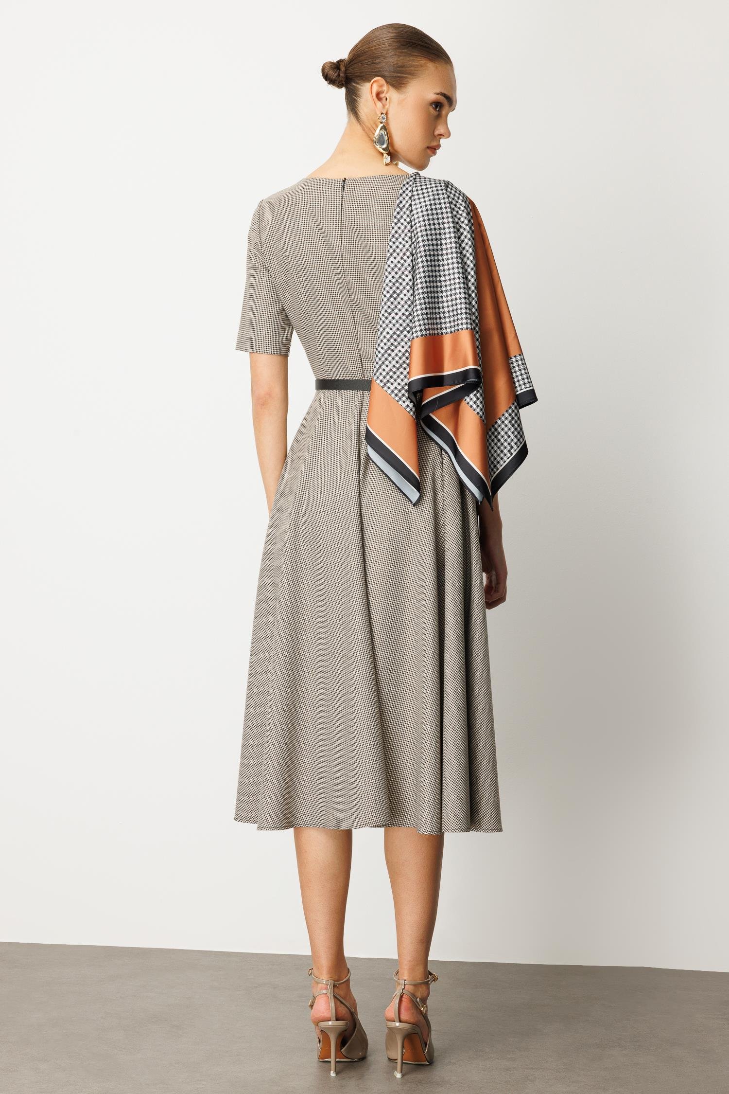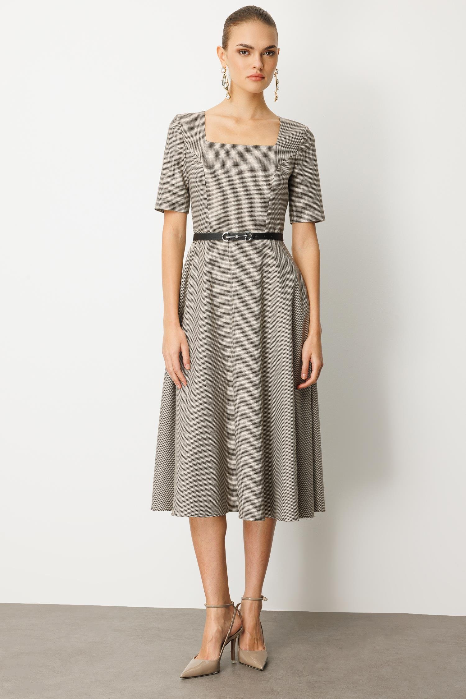 Zamansız şıklığın anahtarı bu sette! Klasik kazayağı (pepita) desenli bu midi elbise, uyumlu kemer ve kontrast eşarp detayıyla stilinizi zahmetsizce üst seviyeye taşıyor. Bu set, tek parça şıklık arayan modern Nefeli kadını için tasarlandı.