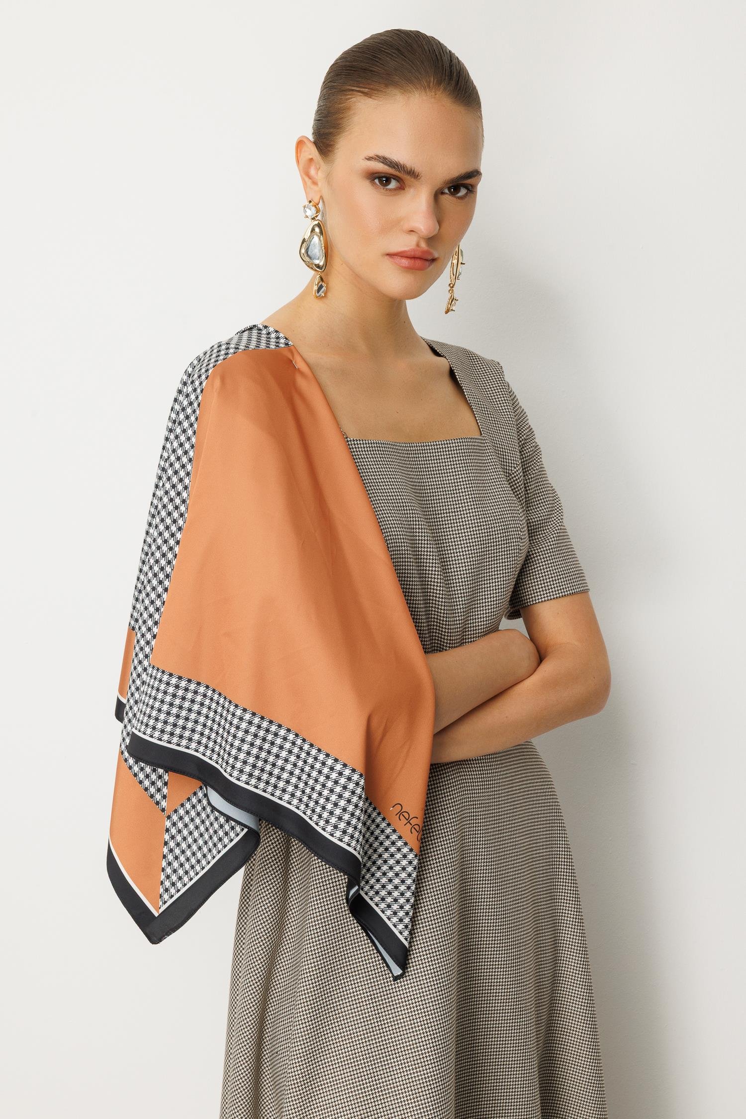 Canlı turuncu ve siyah-beyaz kareli desene sahip büyük eşarp/şal, omuzdan dökümlü kullanılarak kombine dinamik ve sofistike bir renk patlaması katar. (Fiyata dahildir.)