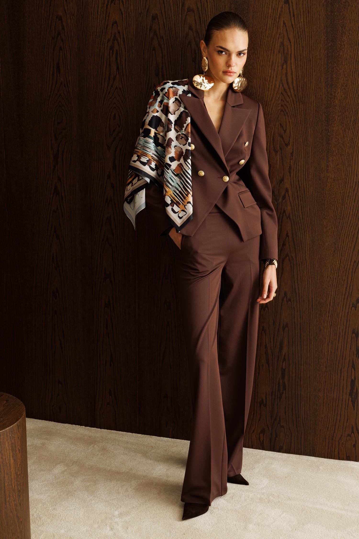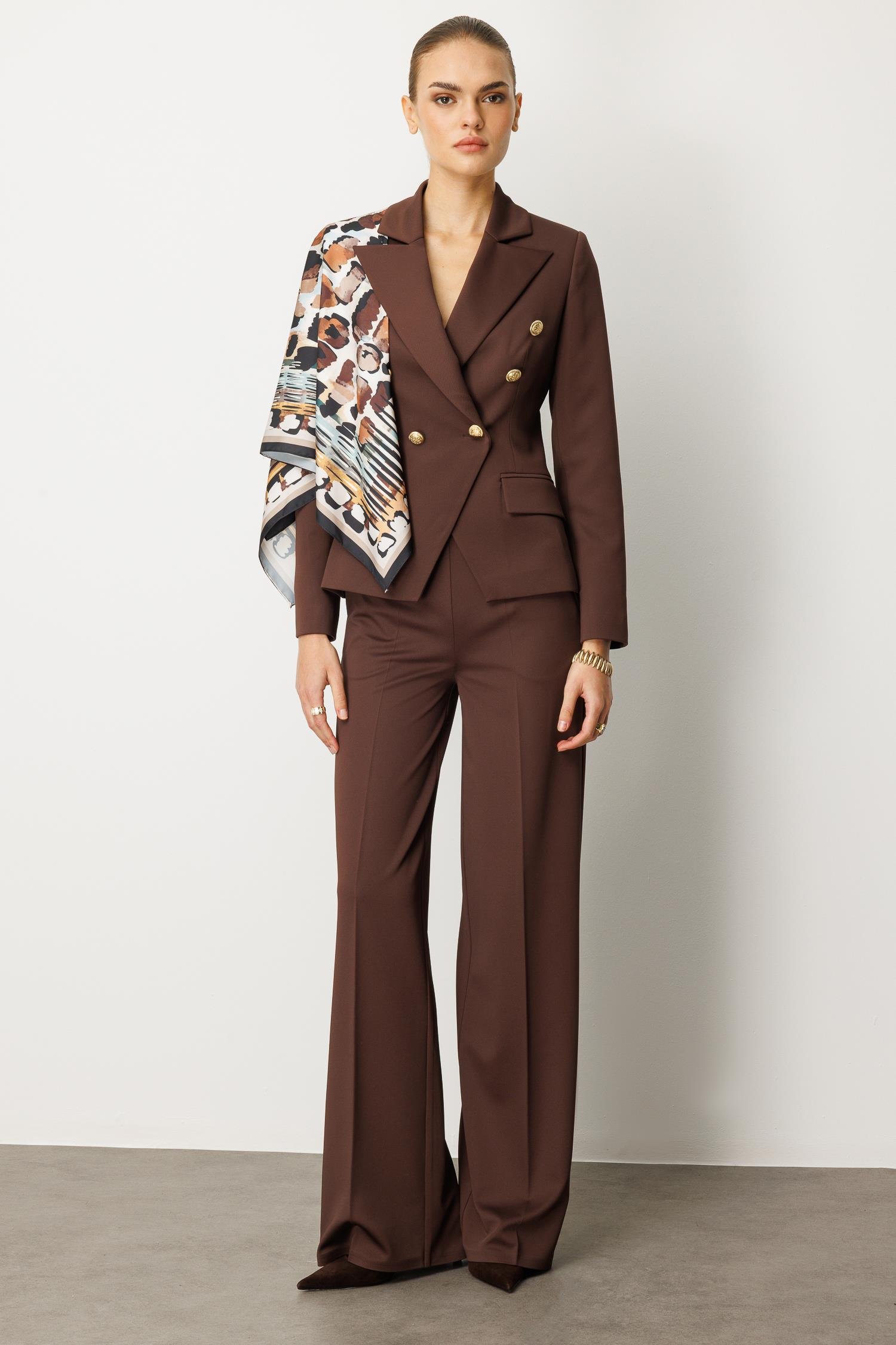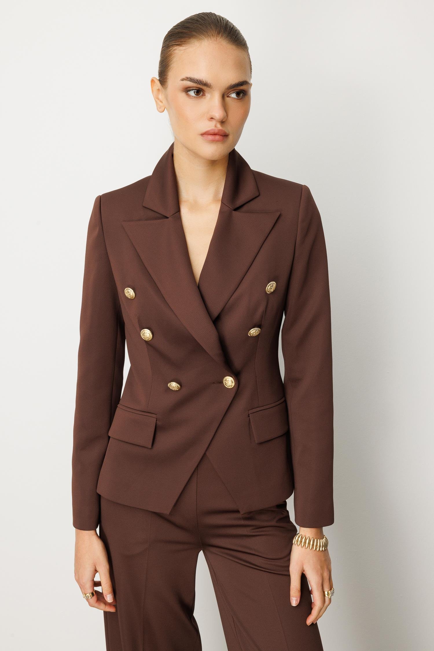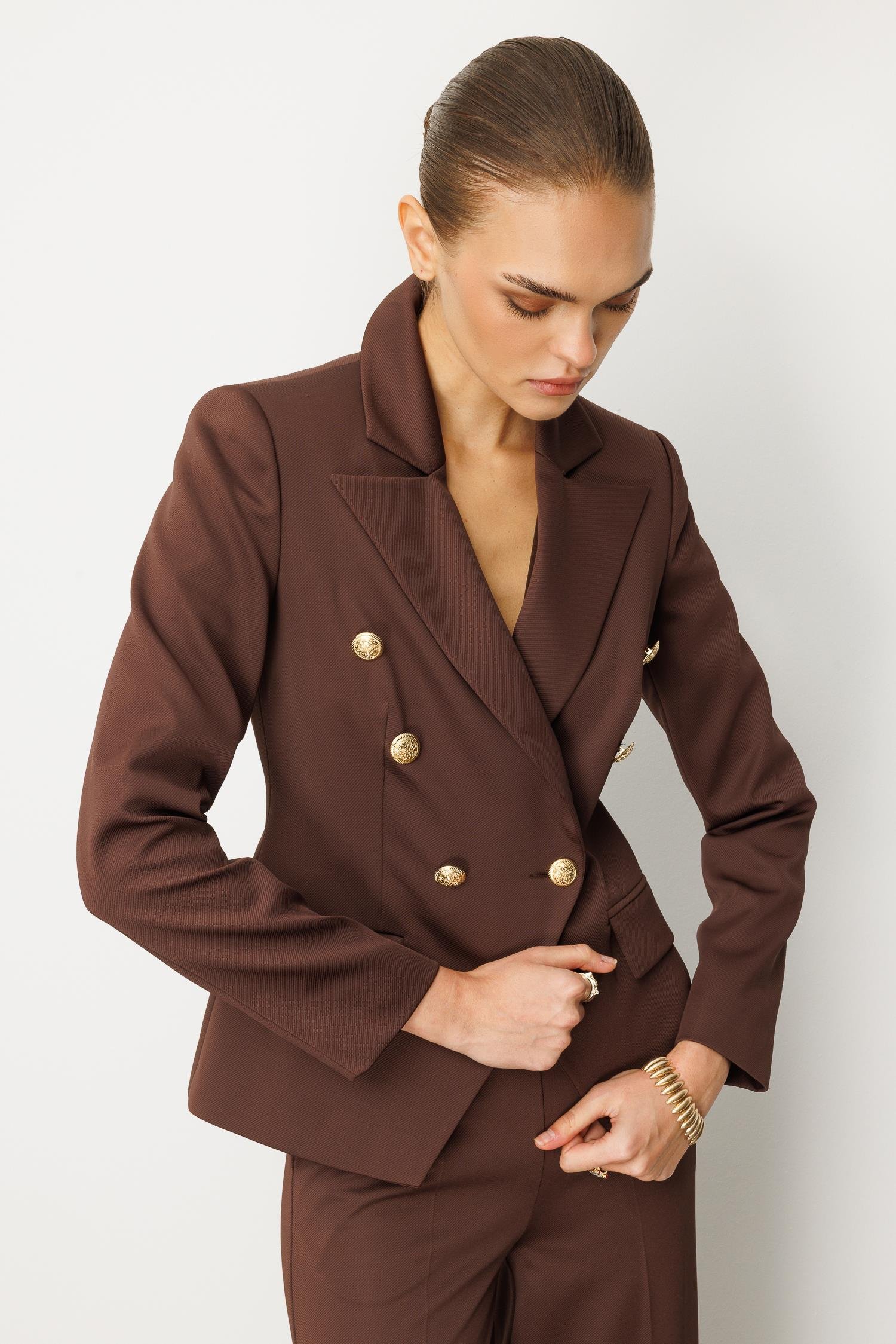 Kahverengi Kruvaze Ceket: Kaliteli kumaşı, mükemmel kalıbı ve altın detaylı düğmeleriyle lüks ve sıcak bir görünüm sunar.