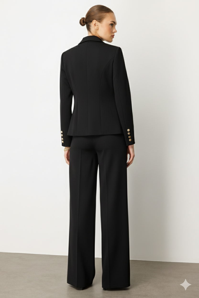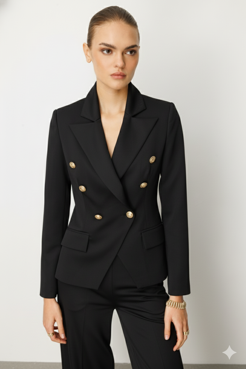 Siyah Kruvaze Ceket: Kaliteli kumaşı, kusursuz kalıbı ve altın detaylı düğmeleriyle lüks bir görünüm sunar.
