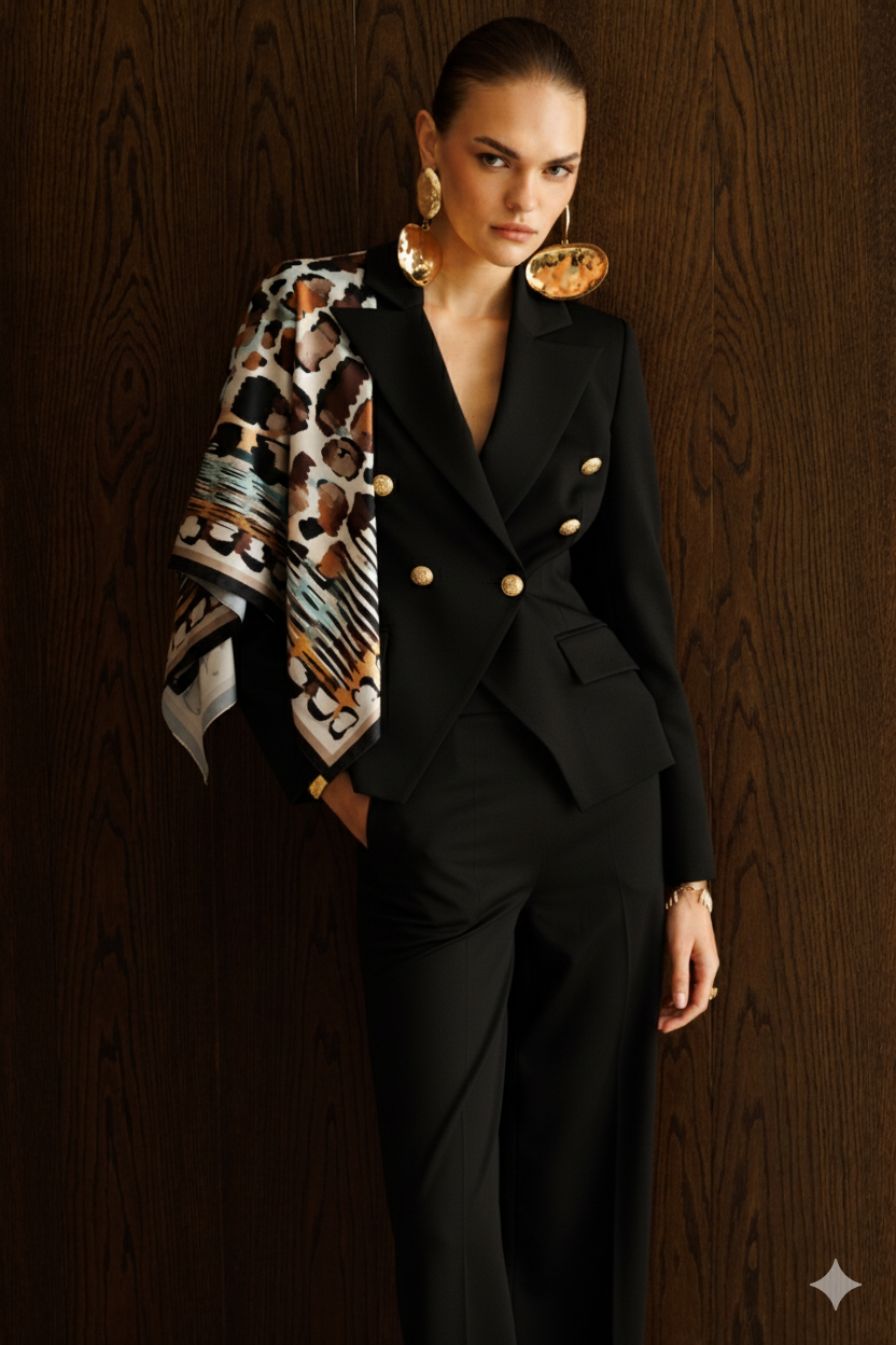 Asil Şıklığın Modern Yorumu: Siyah Kruvaze Ceket ve Leopar Desenli Eşarp Kombini