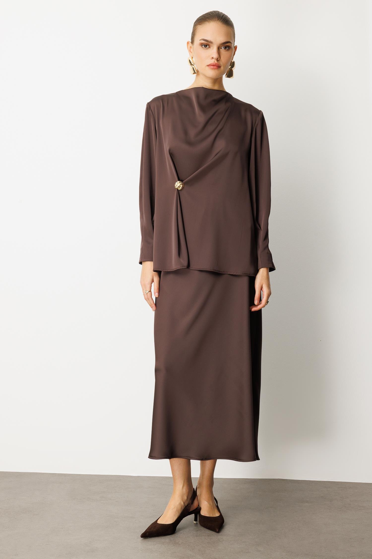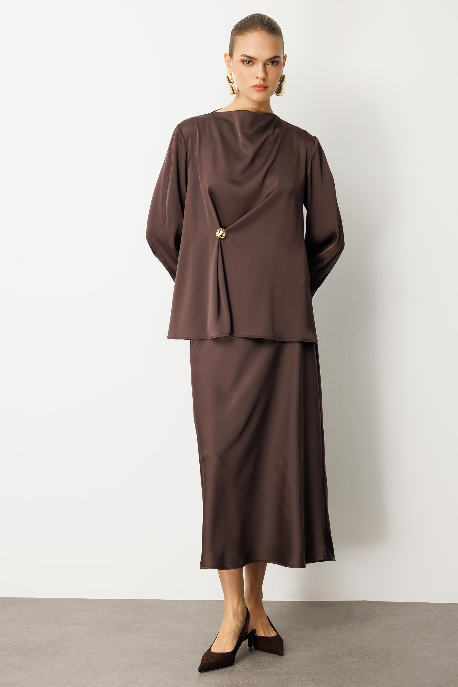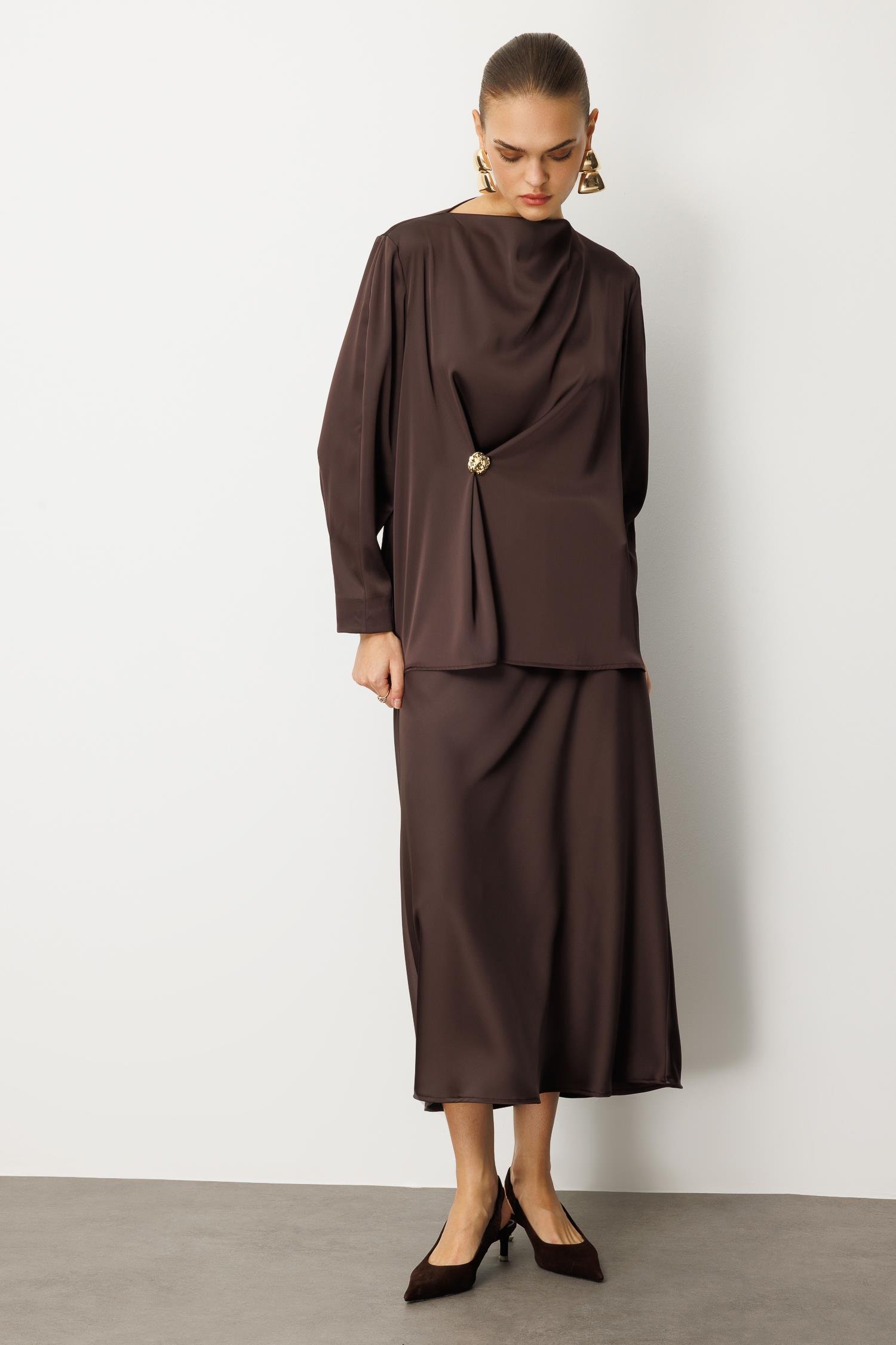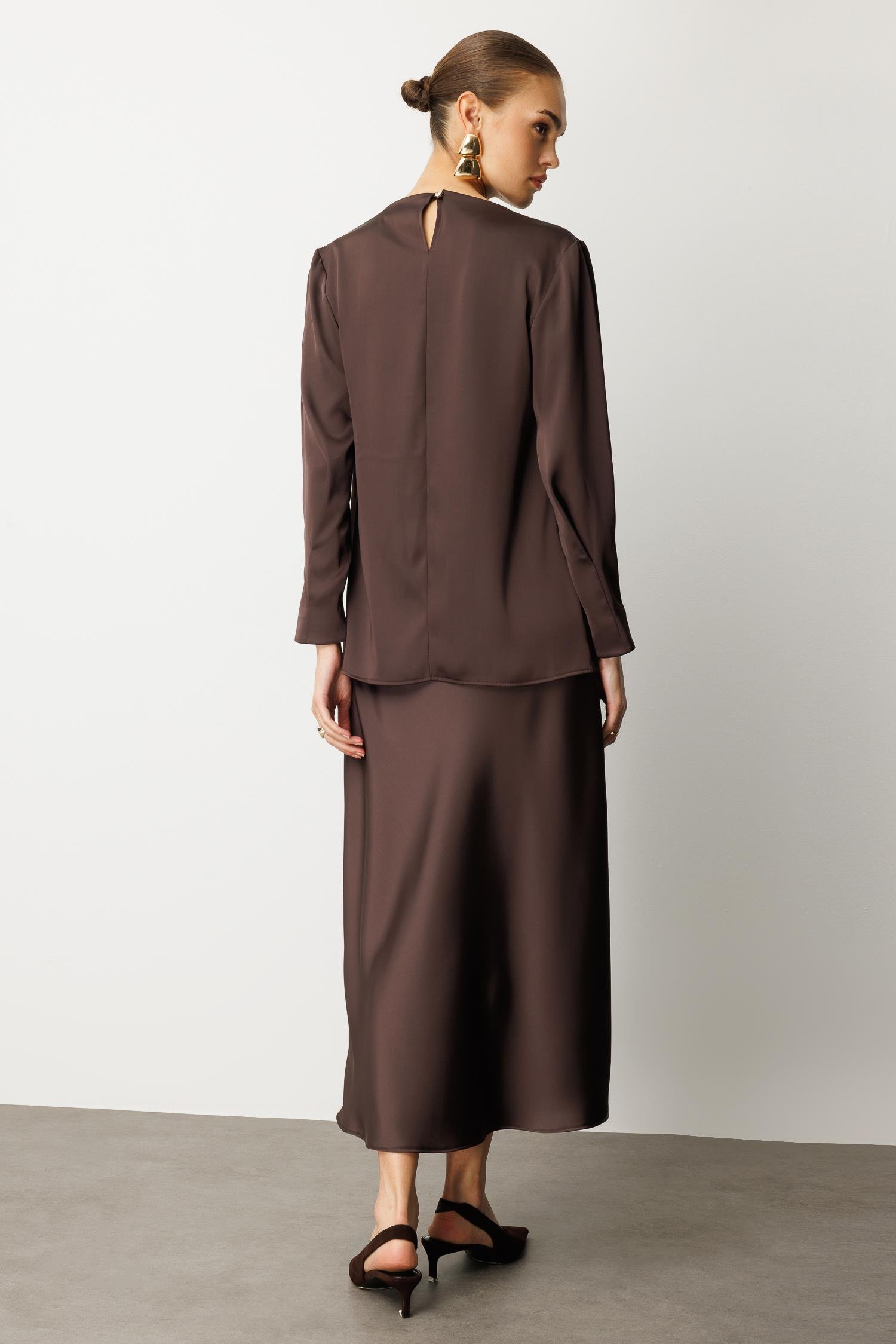 Parlak ve akıcı saten kumaştan tasarlanmış bu midi boy etek ile gardırobunuza zamansız bir zarafet katın. Canlı kahve rengi ve vücudu nazikçe saran A kesimi, size hem gündüz hem de gece şıklığı için kusursuz bir zemin sunar.