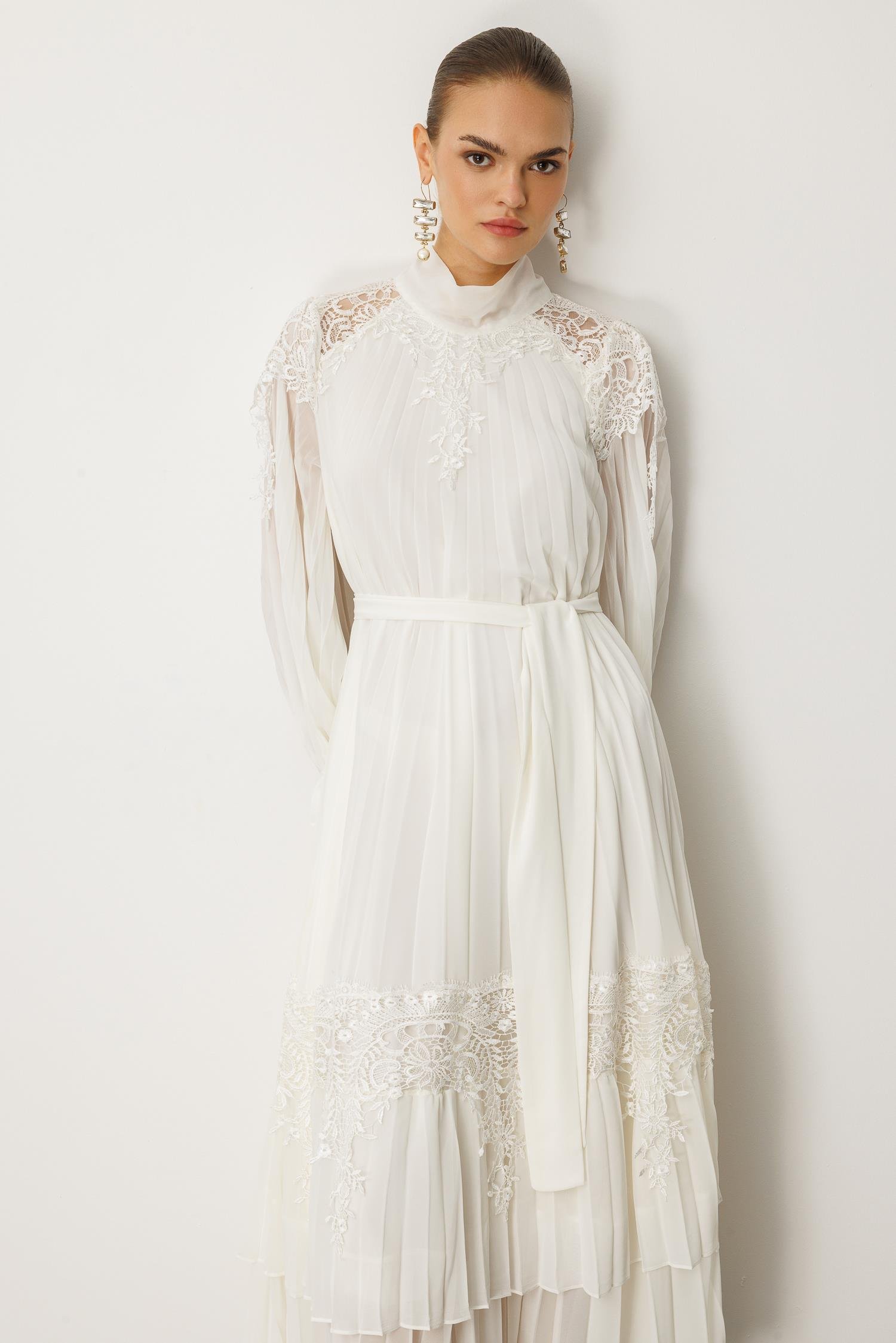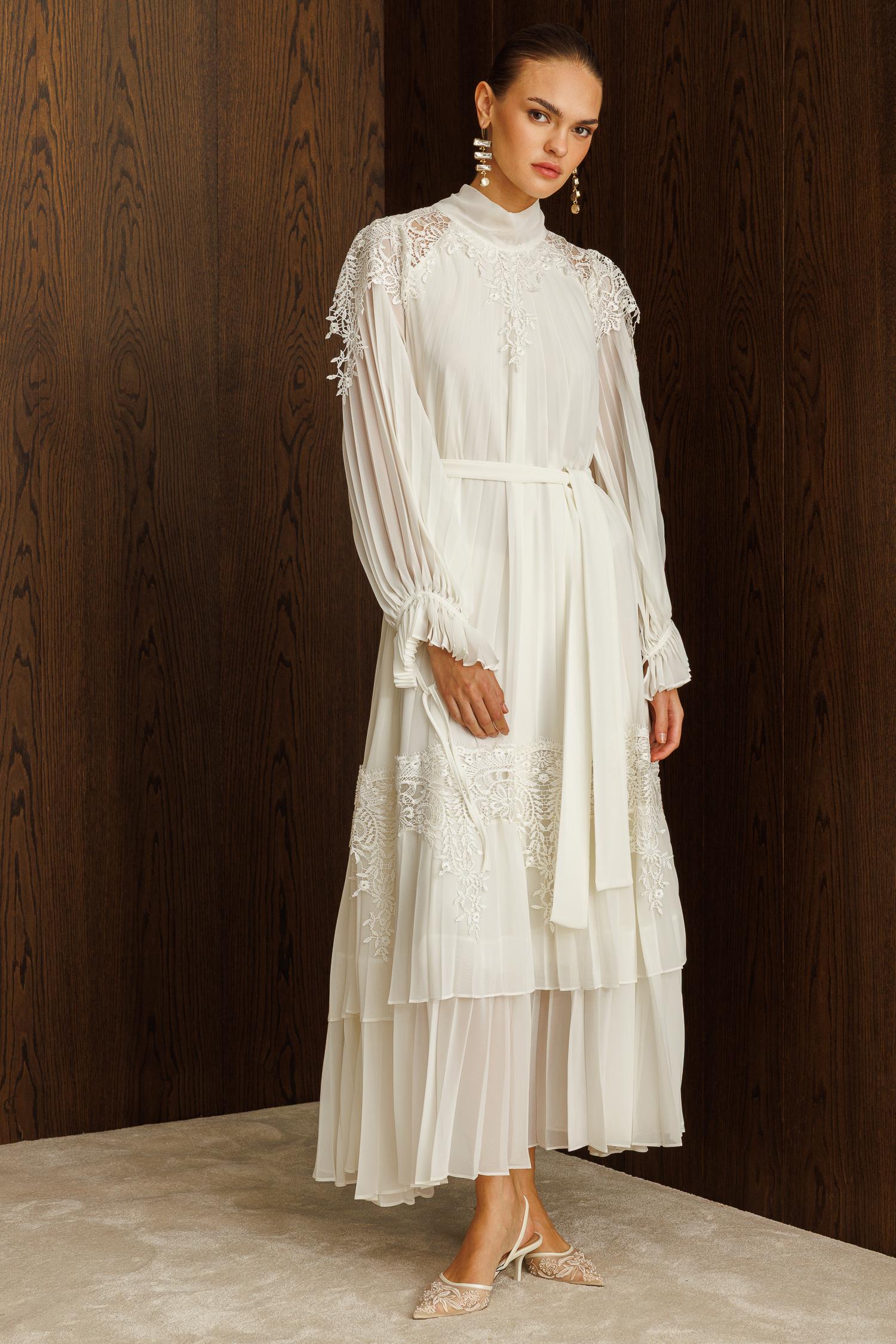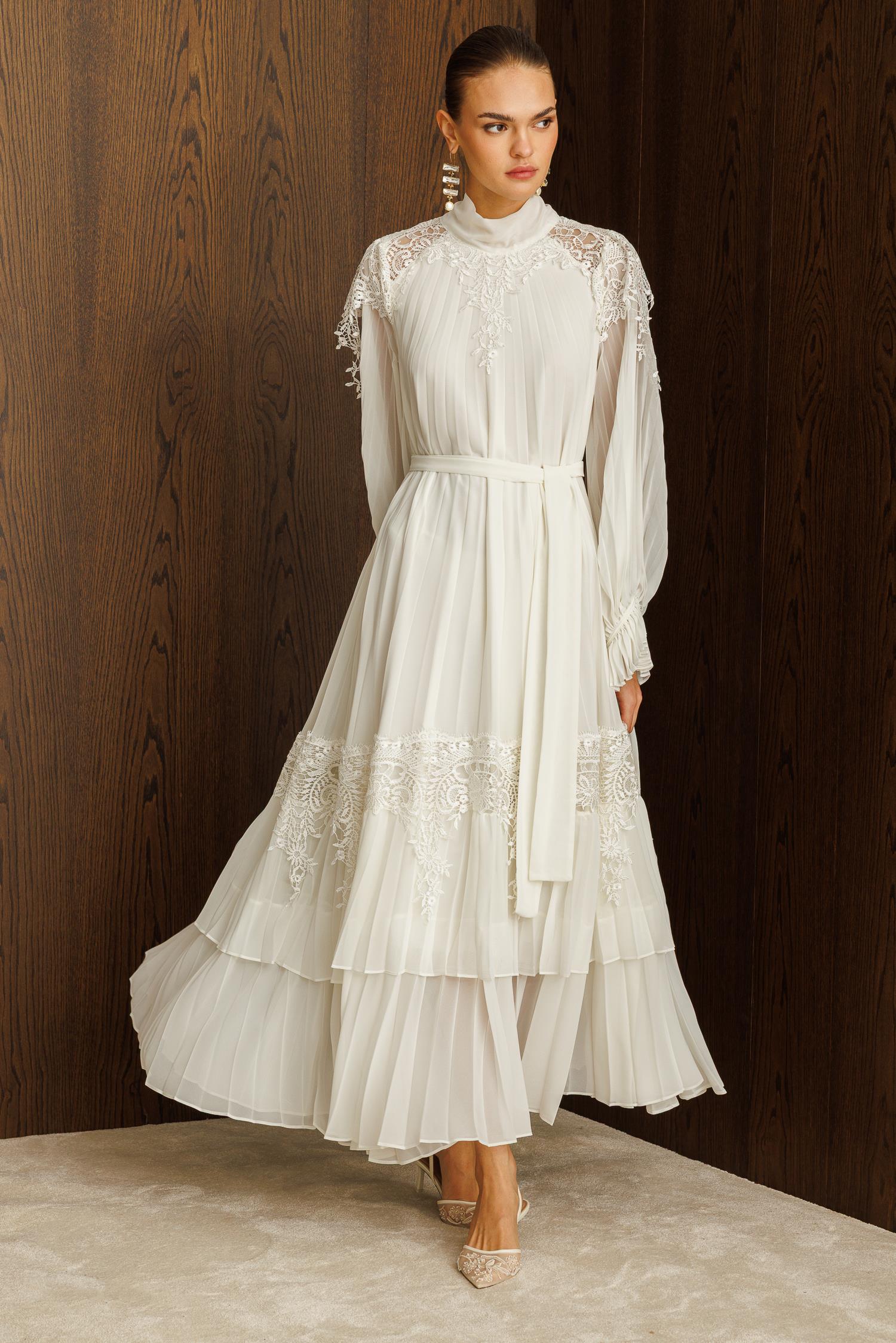 Elbisenin tamamını saran zarif dantel işlemeleri, feminen bir hava yaratırken, uzun kollu tasarımı şıklığı tamamlıyor. Maxi boyu, hem klasik hem de modern bir görünüm sunar. Yüksek kaliteli kumaşı sayesinde üzerinizde hoş bir duruş sergiler ve gün boyu konforlu bir kullanım sağlar. Arka kısmındaki detaylar, elbiseye özgün bir dokunuş katıyor.