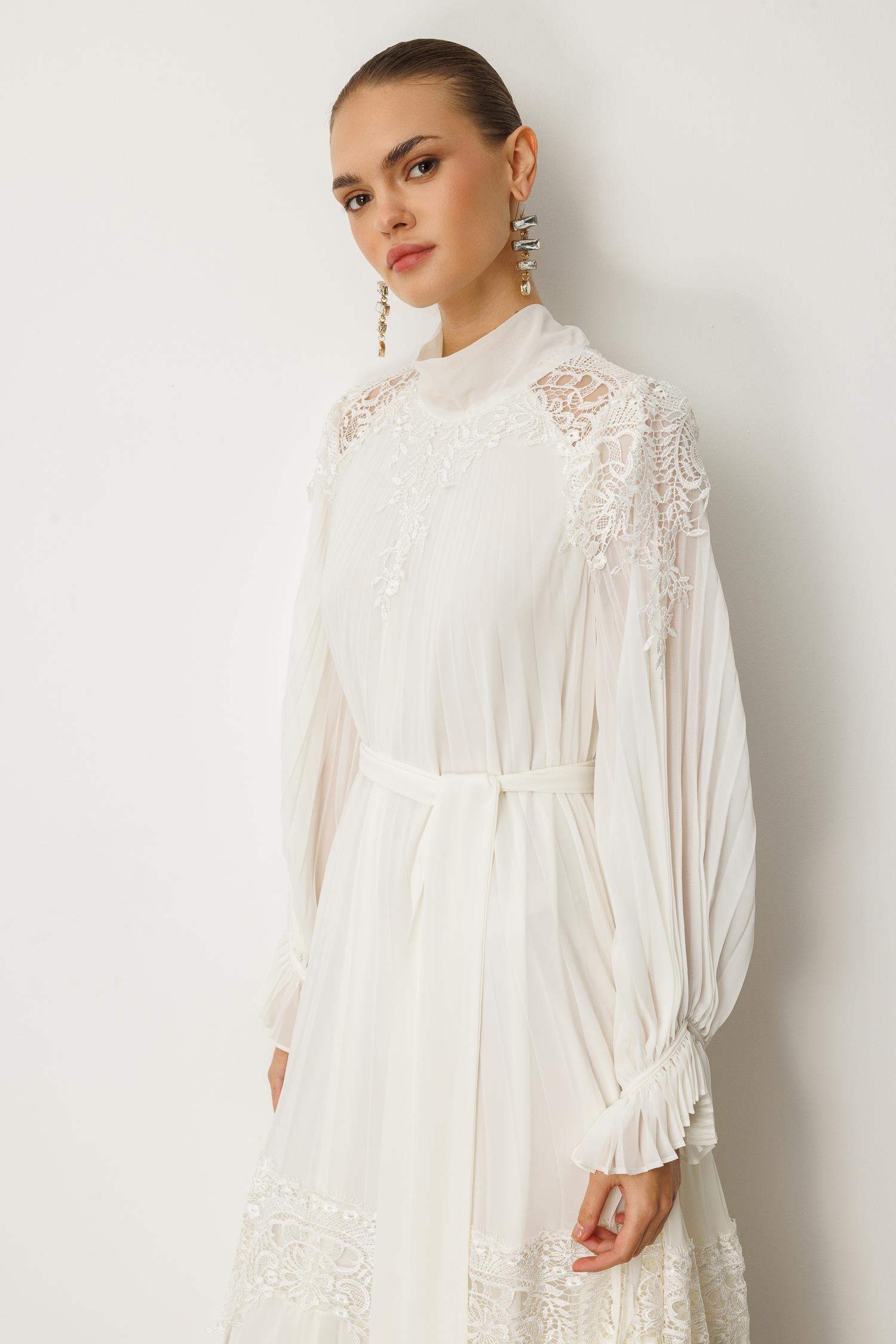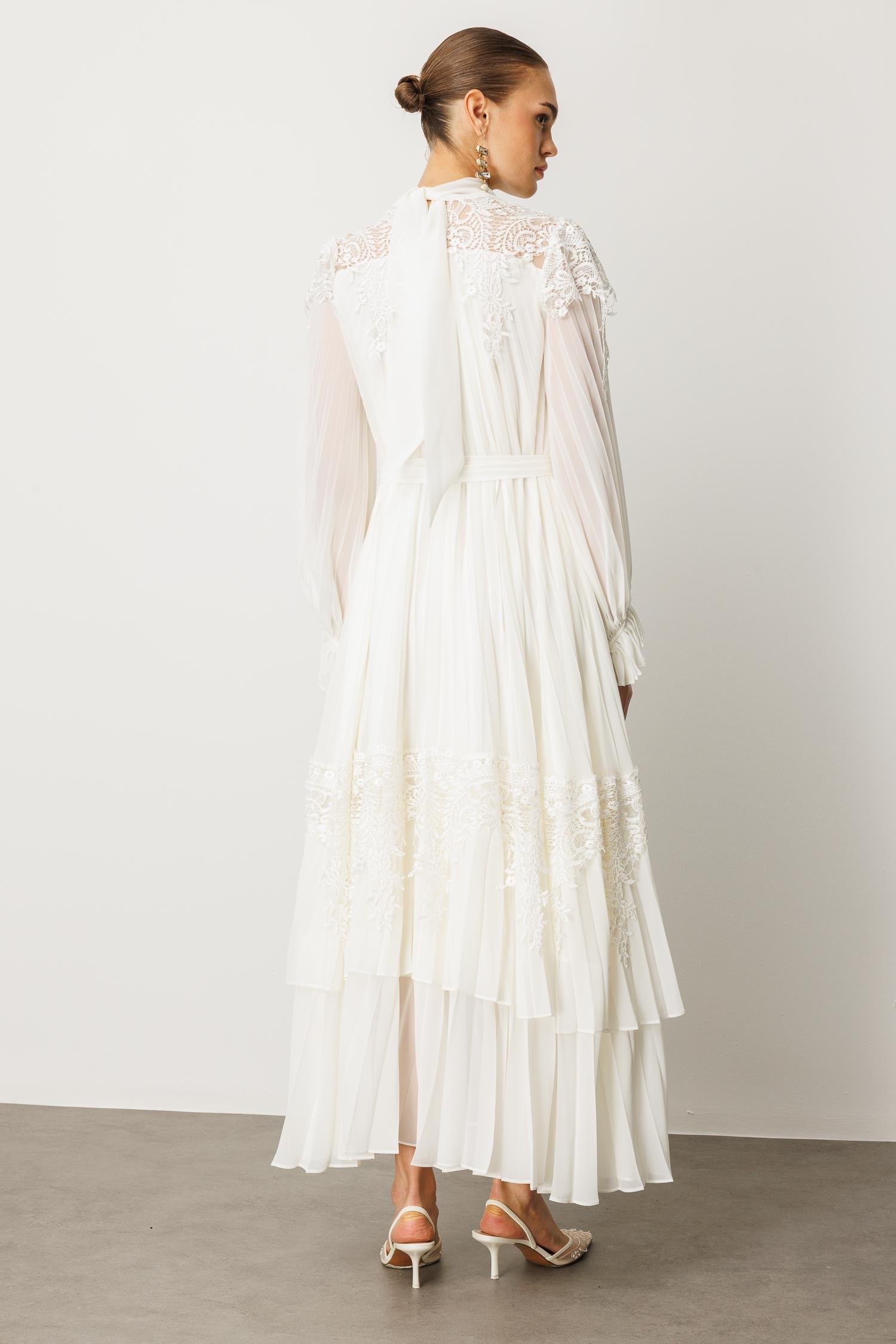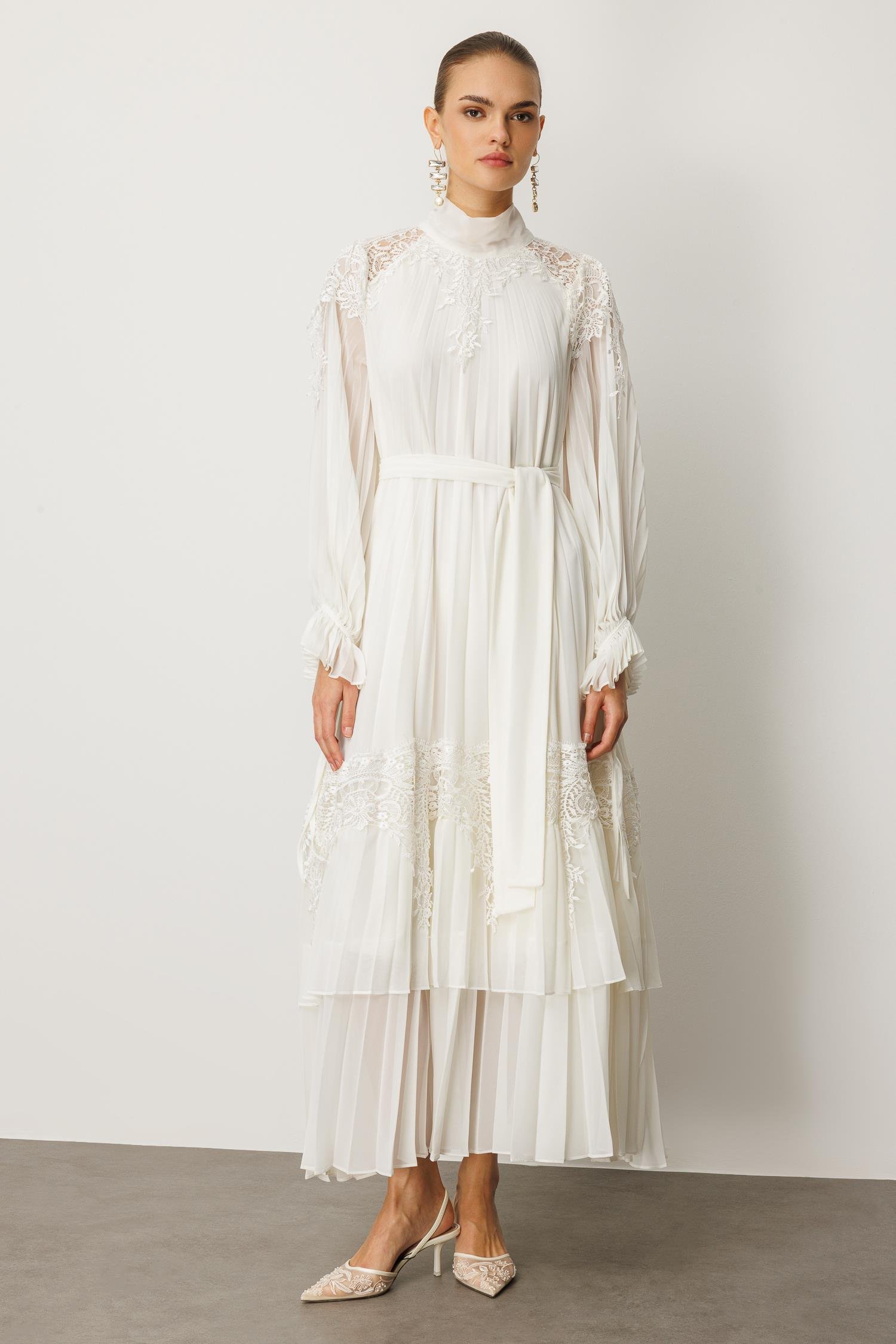 Elbisenin tamamını saran zarif dantel işlemeleri, feminen bir hava yaratırken, uzun kollu tasarımı şıklığı tamamlıyor. Maxi boyu, hem klasik hem de modern bir görünüm sunar. Yüksek kaliteli kumaşı sayesinde üzerinizde hoş bir duruş sergiler ve gün boyu konforlu bir kullanım sağlar. Arka kısmındaki detaylar, elbiseye özgün bir dokunuş katıyor.