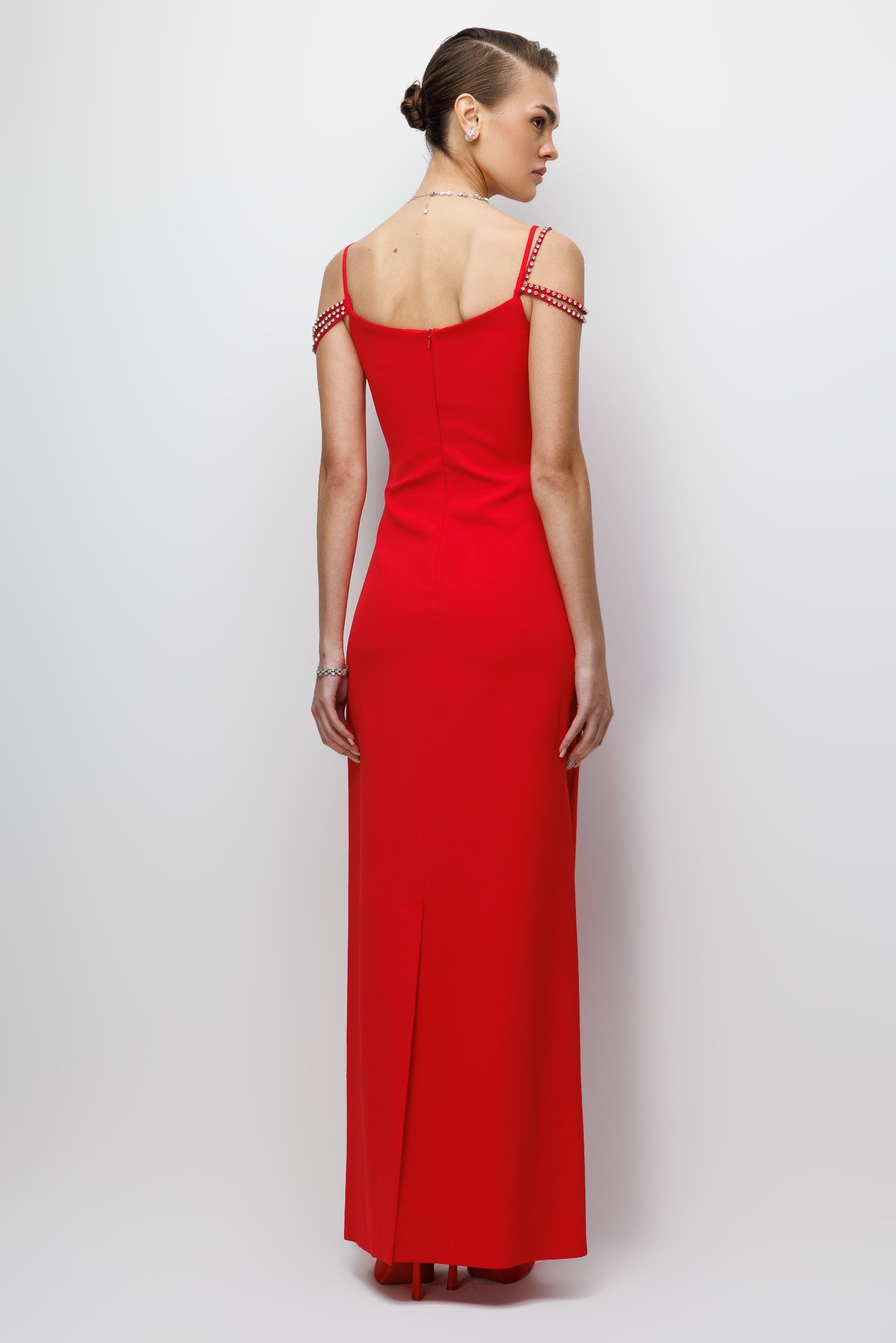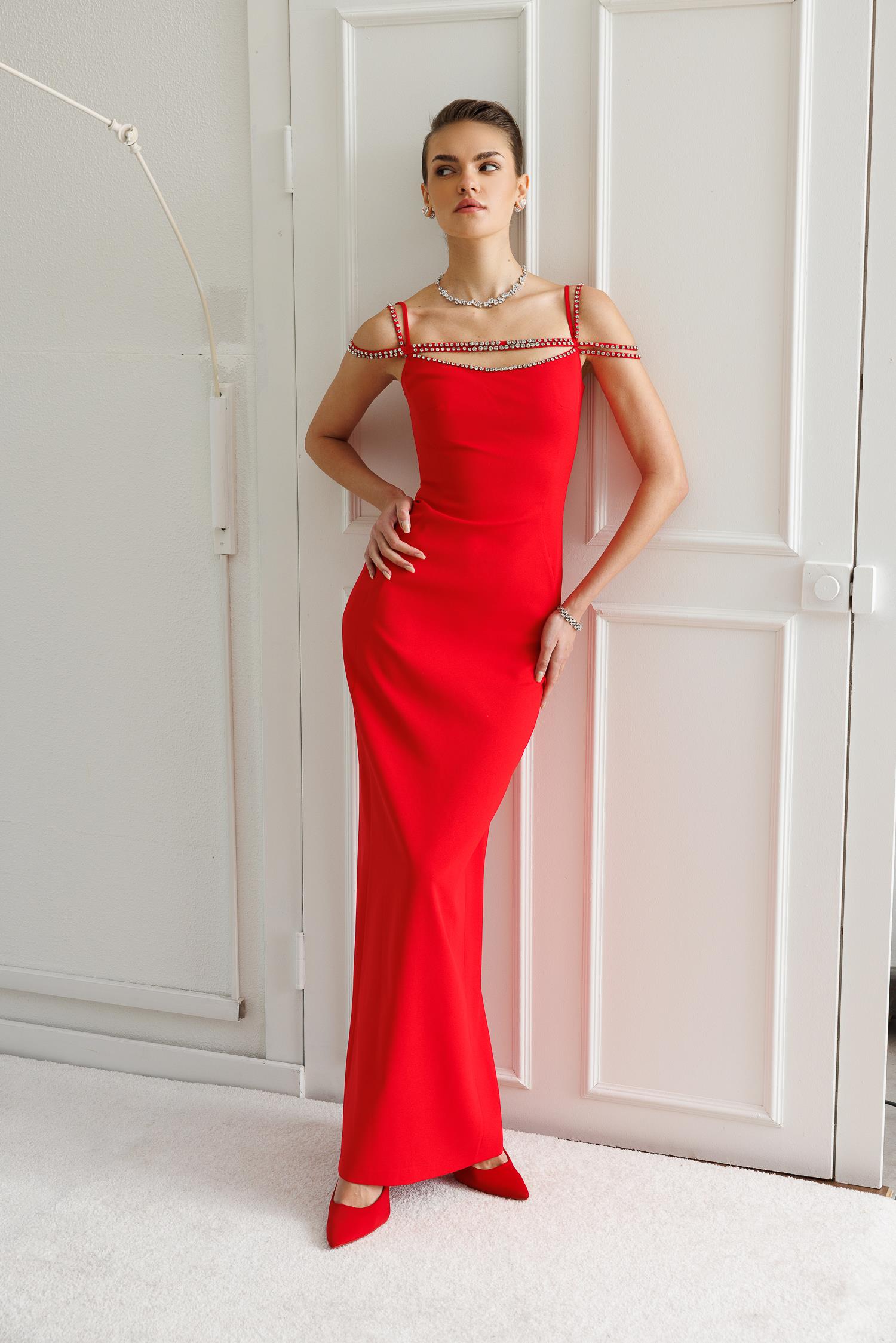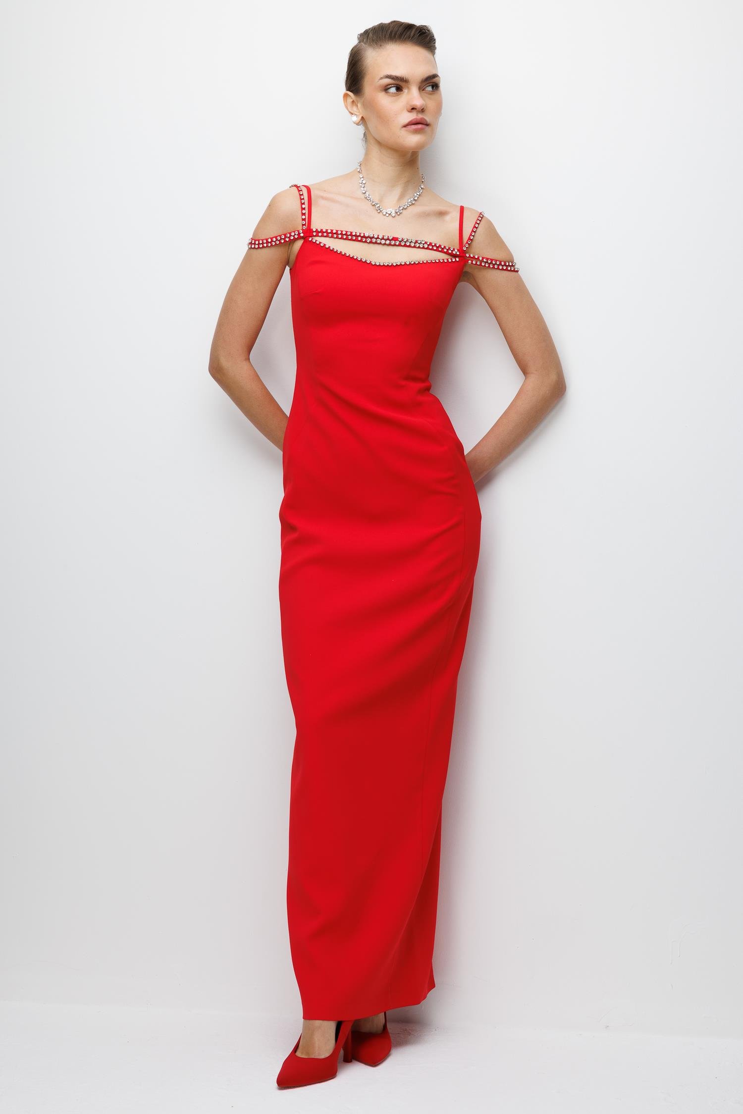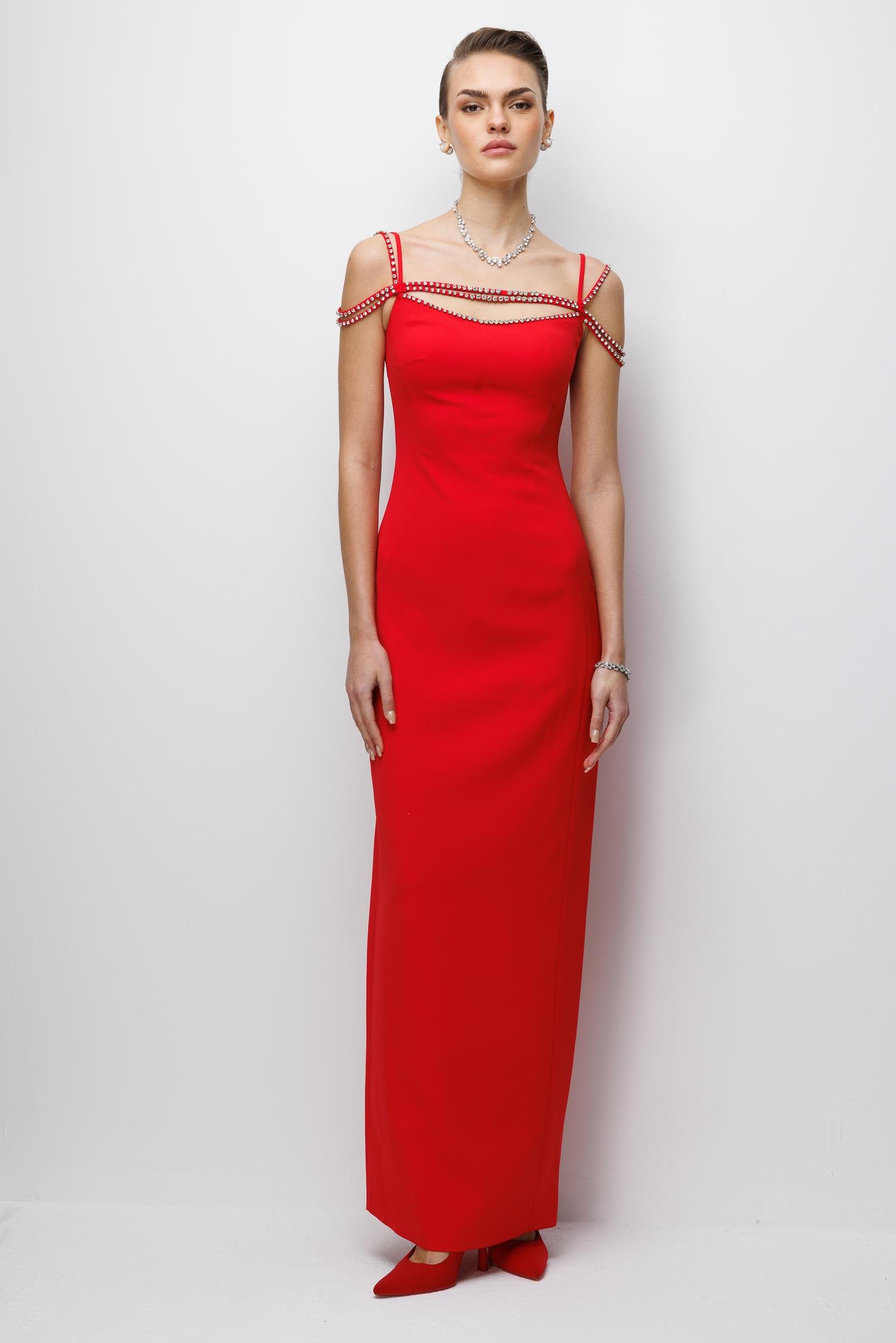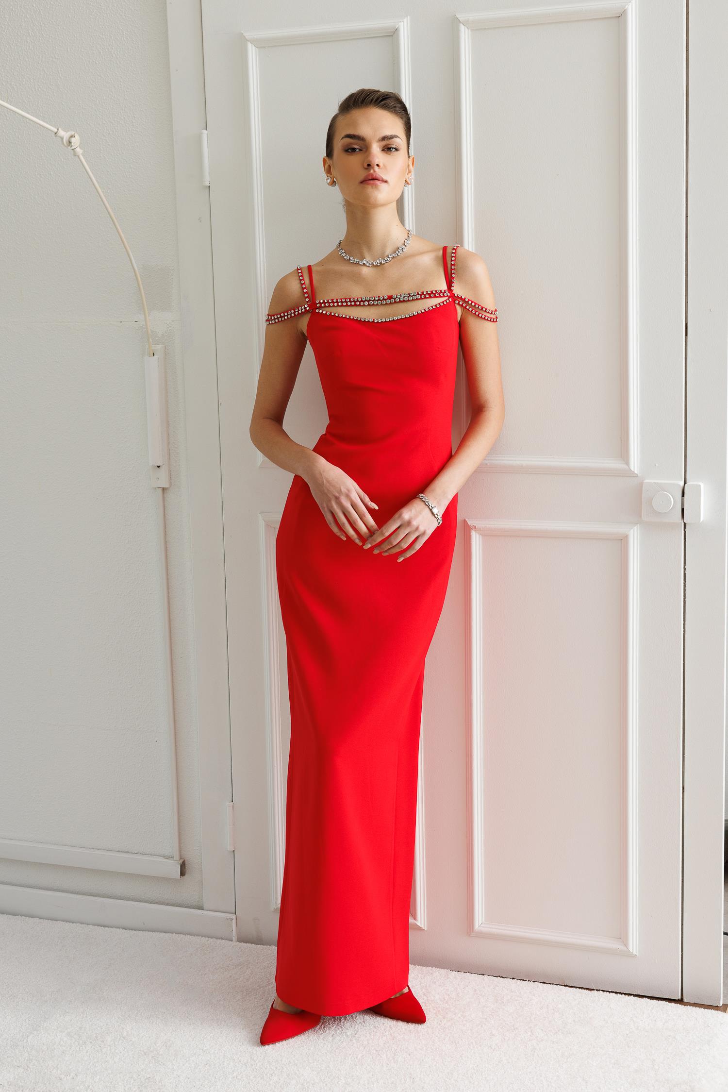 Ana Özellikler: Şerit Taş Detaylı, Maxi Boy, Abiye Kesim, Çarpıcı Kırmızı Ton.