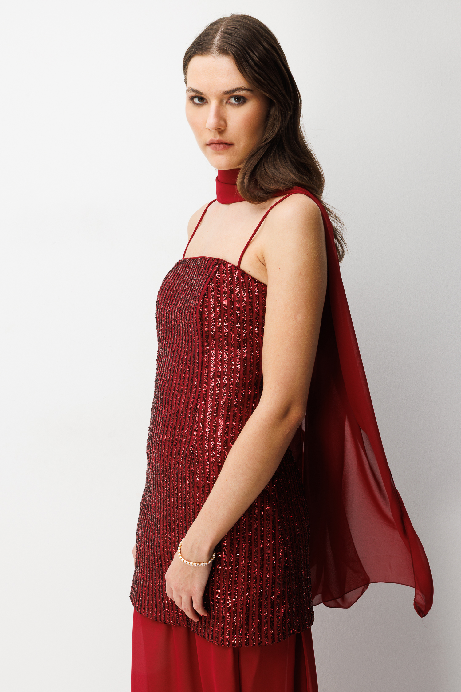 Payet Mini Elbise: İnce askılı, vücudu saran, tamamı kristal bordo payet işlemeli, ışıltılı mini gece elbisesi.