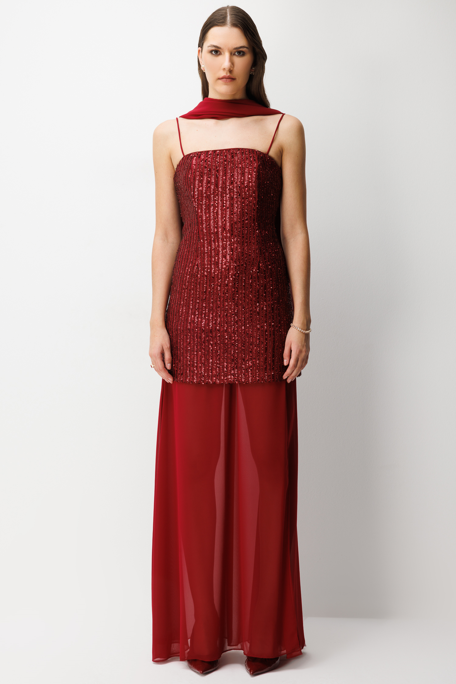 Şifon Maxi Etek: Belden oturan, payet elbisenin üzerine giyilebilen, derin yırtmaçlı ve uçuşan bordo şifon etek.