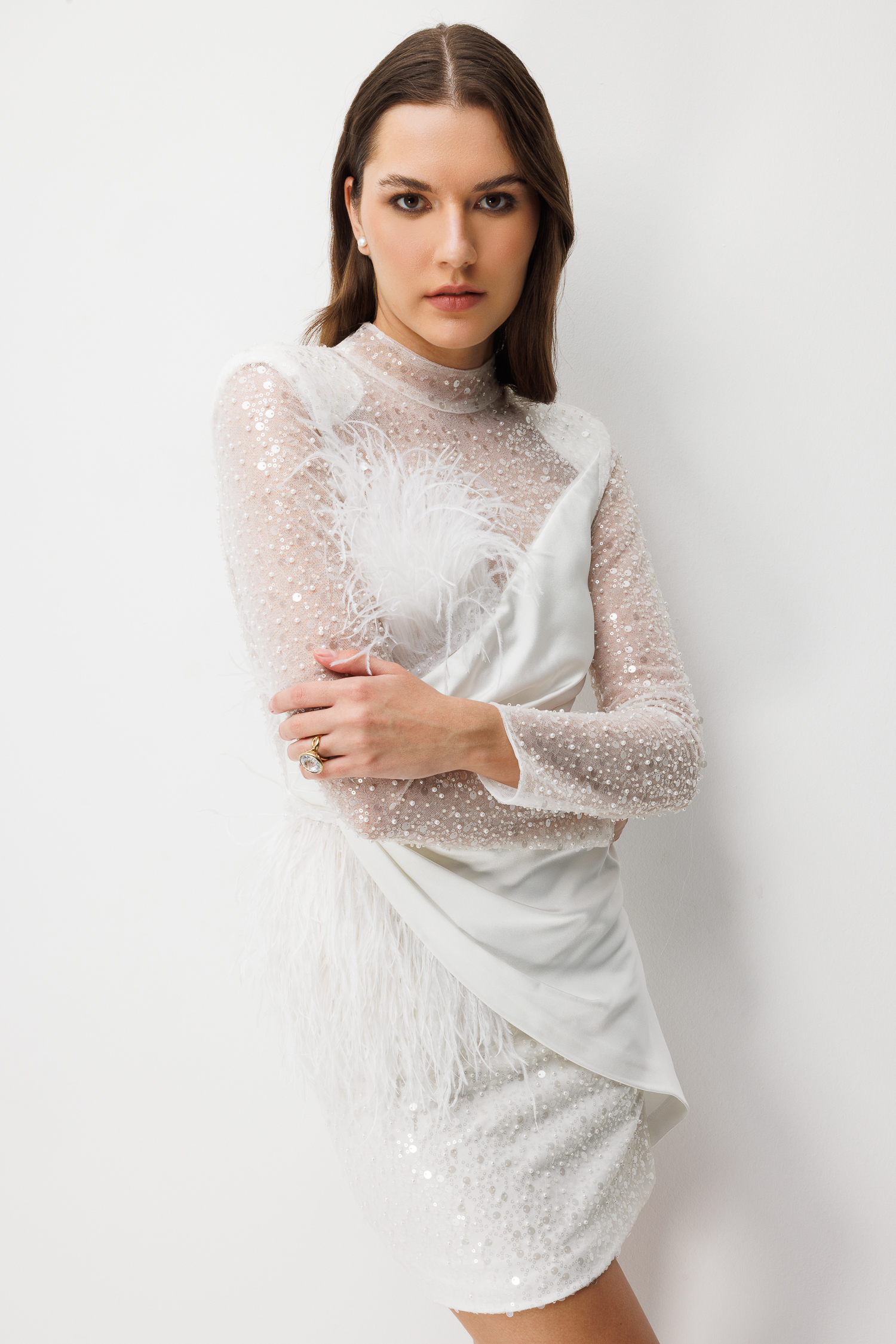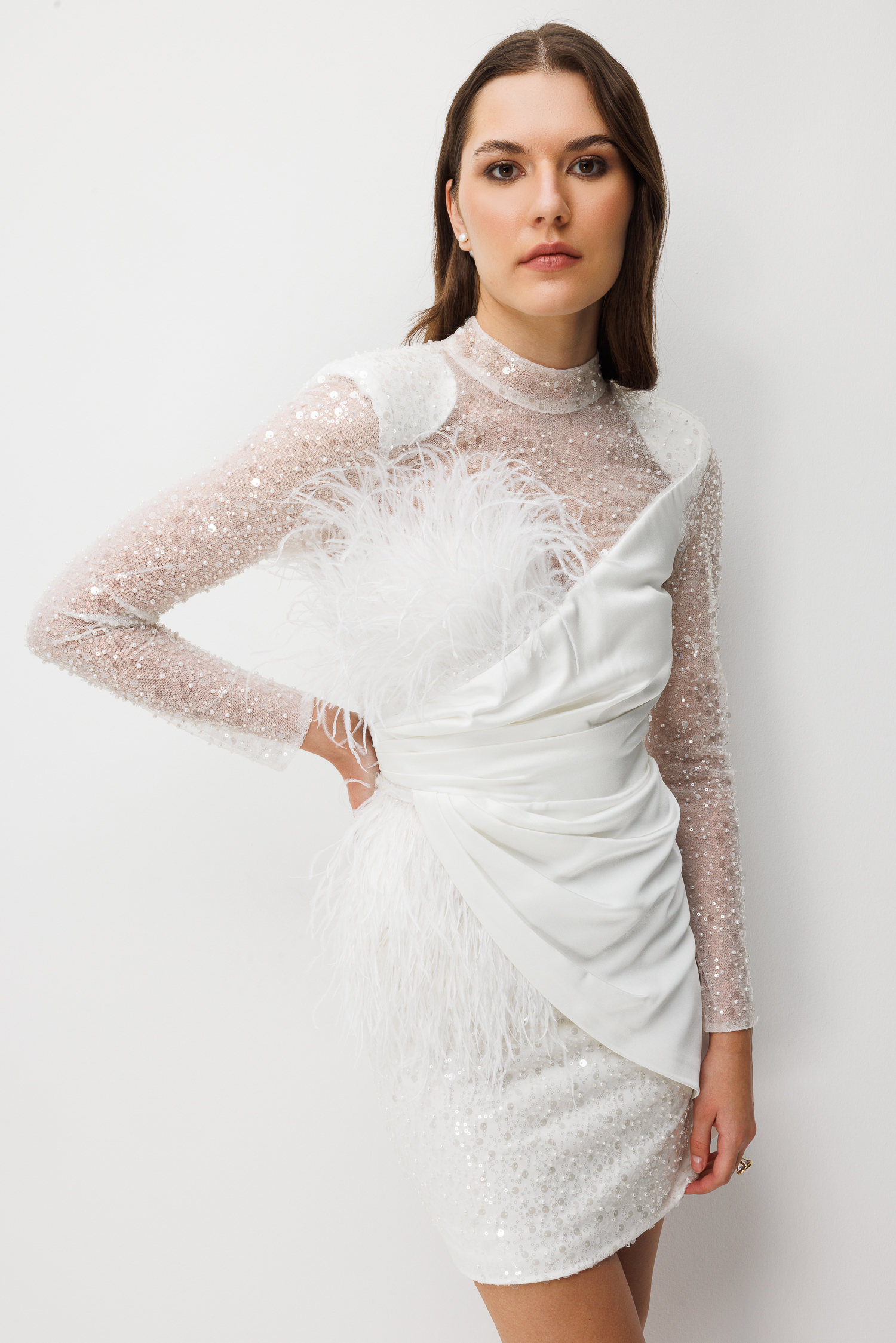 Kumaş: Işığı her açıdan yansıtan payet işlemeli doku ve kollarında transparan tül detaylar.