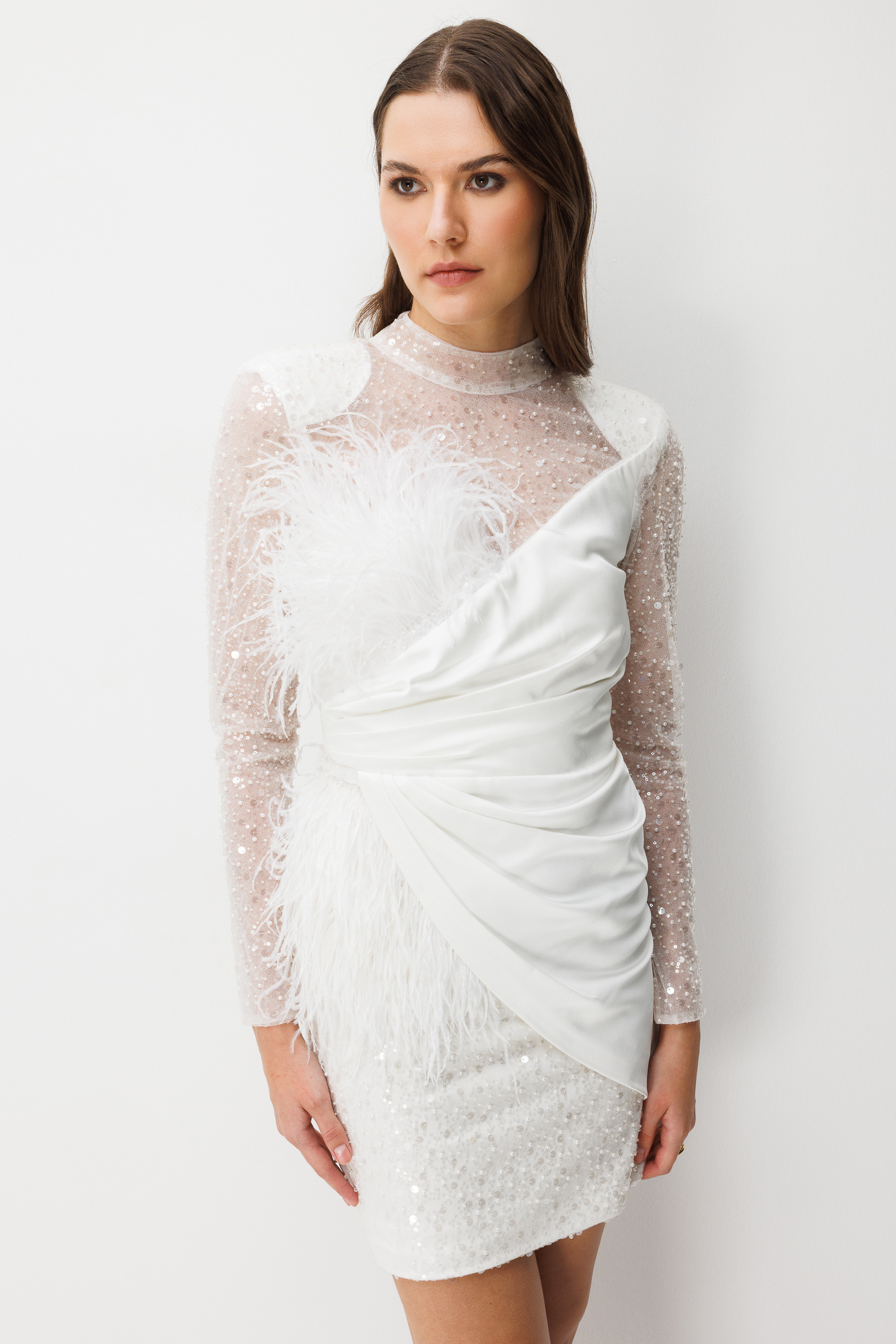 Tasarım: Dik yaka, uzun kollu ve vücudu saran iddialı mini kesim.