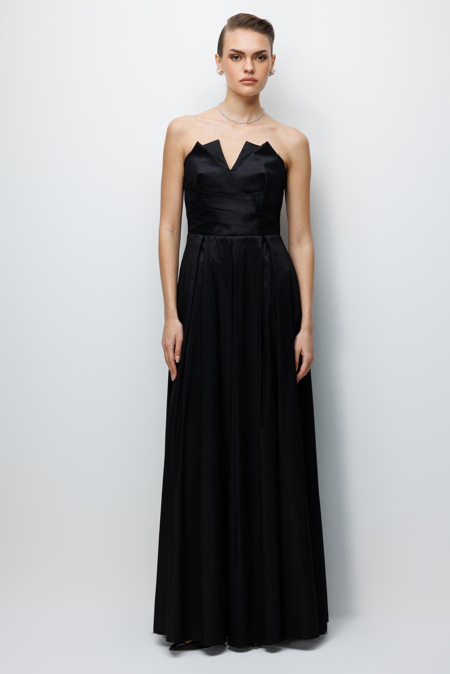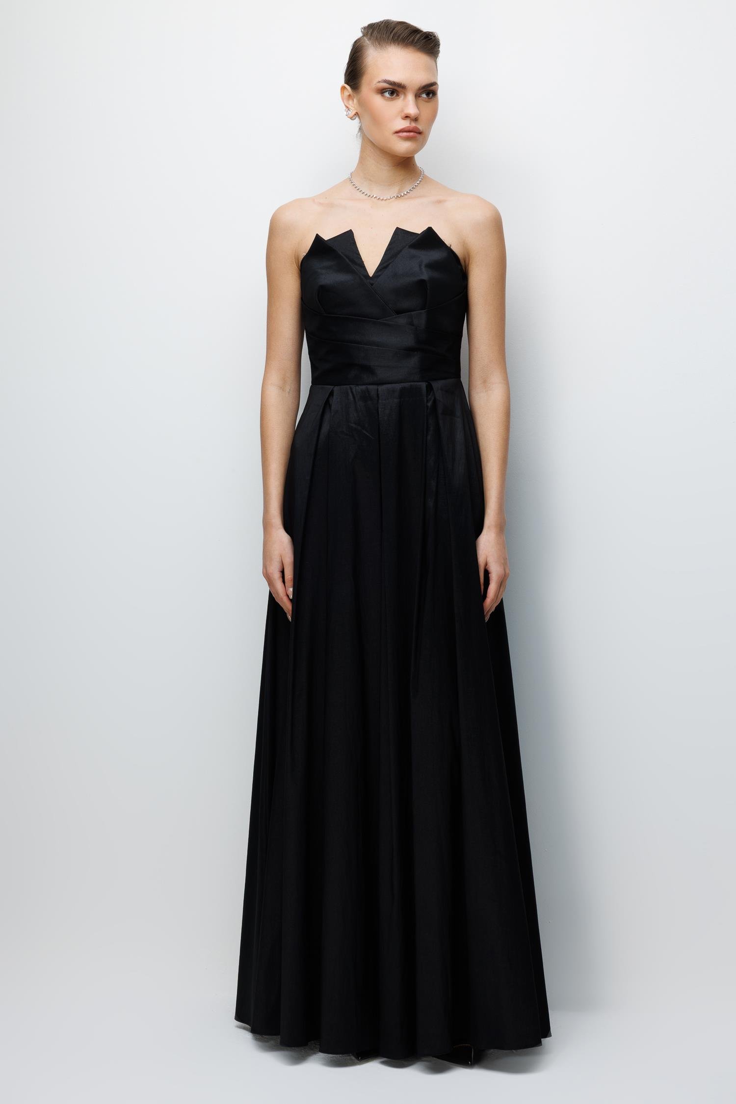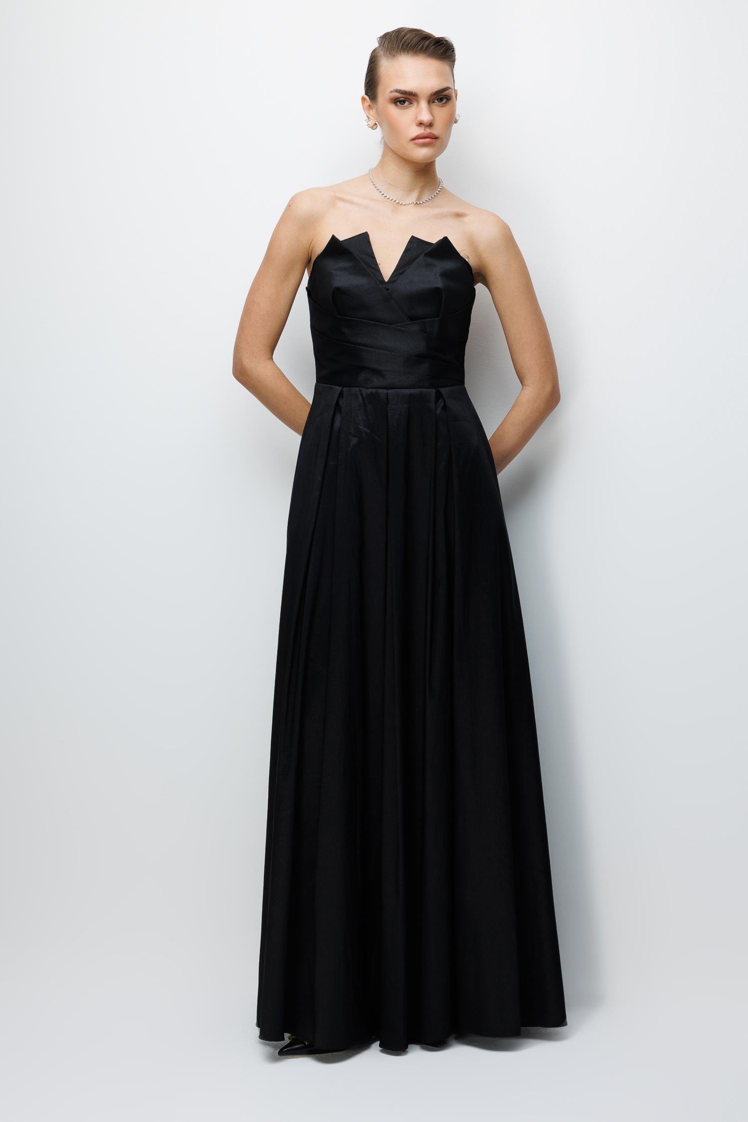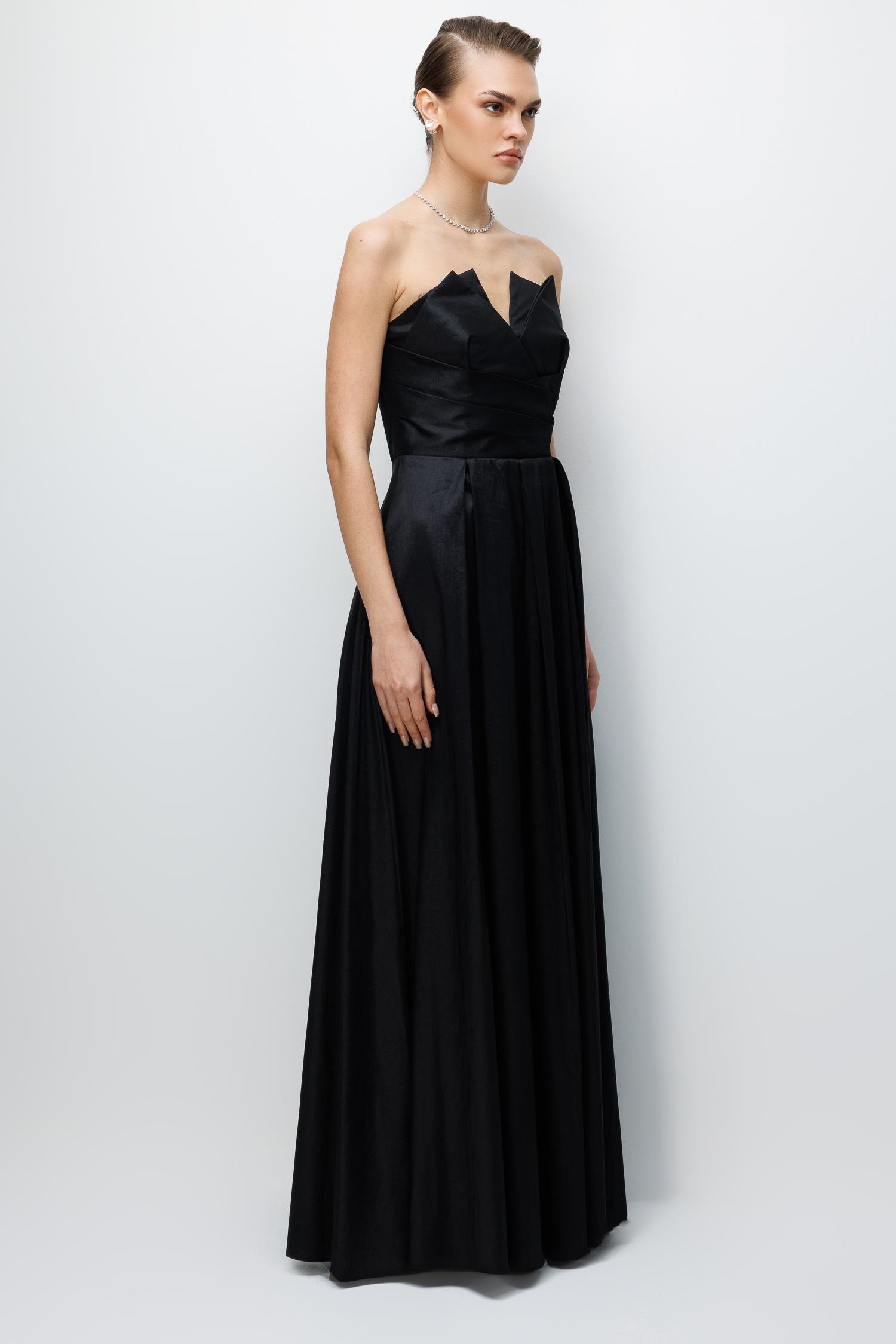 Ana Özellikler: Straplez Yaka, Asimetrik Detaylı, Saten Kumaş, Abiye Boy.