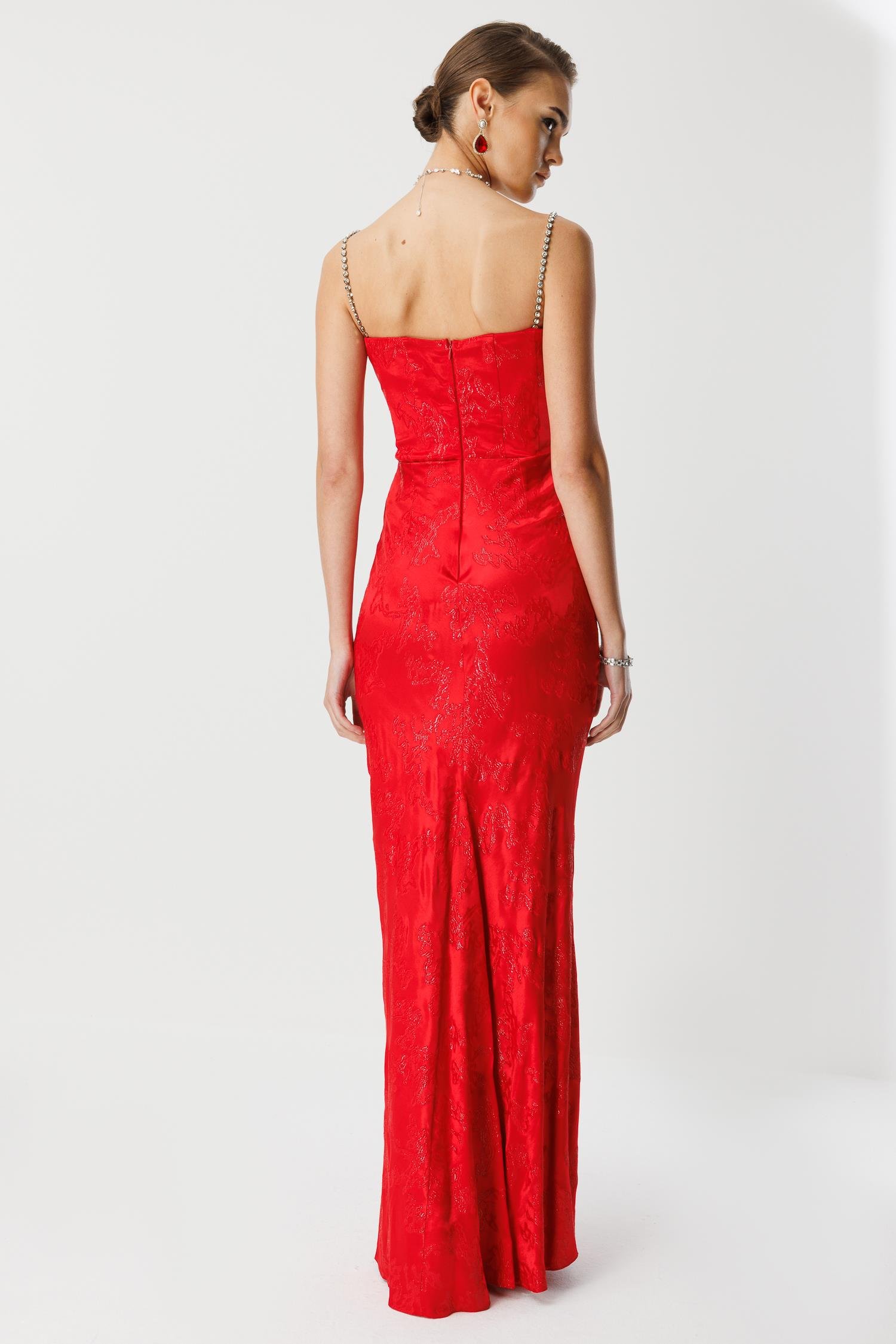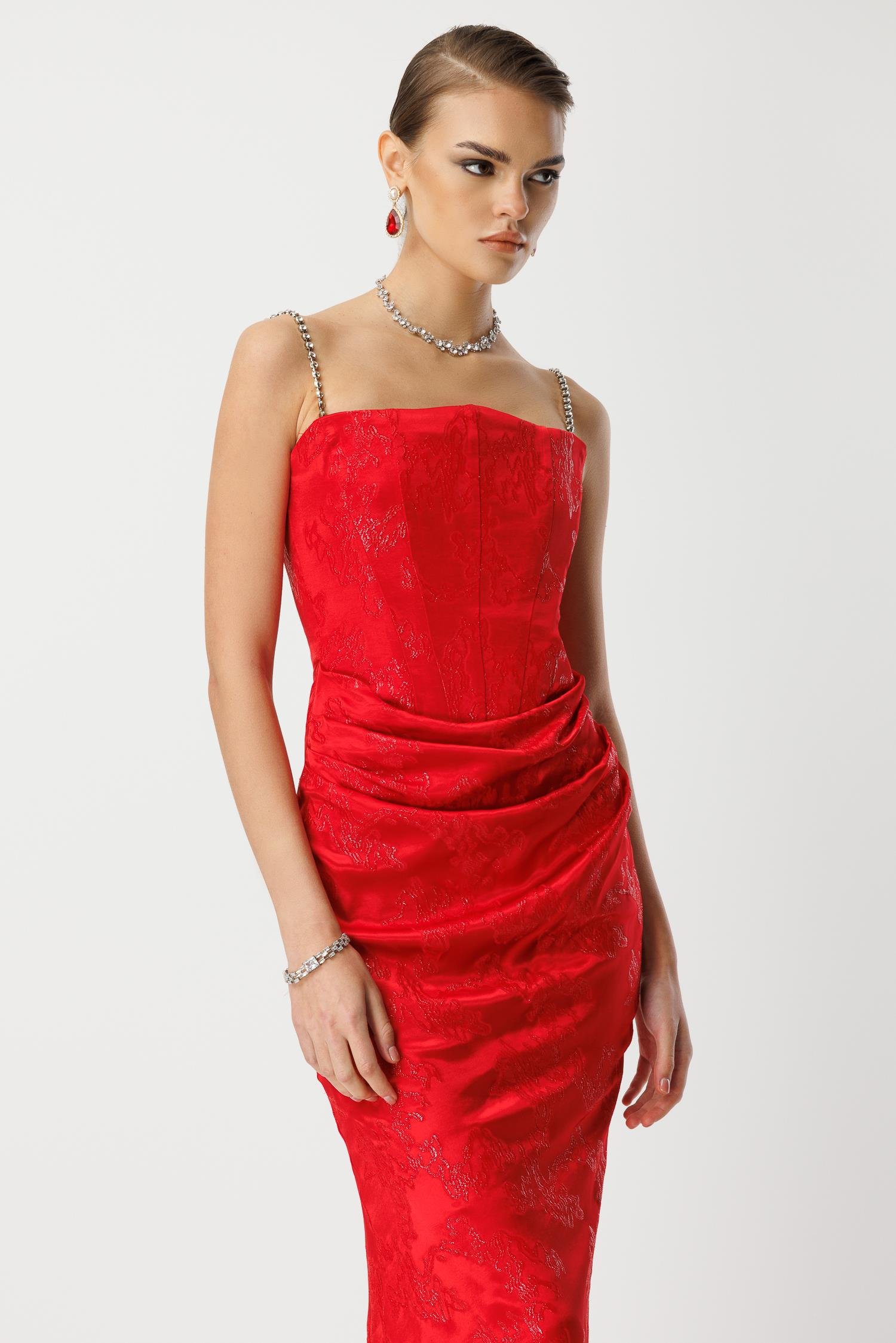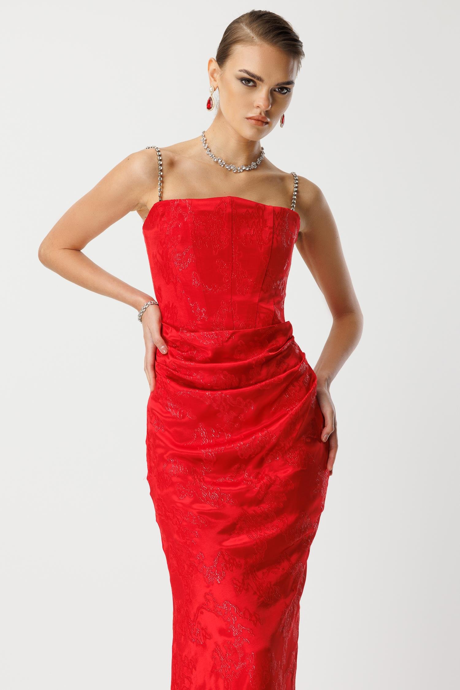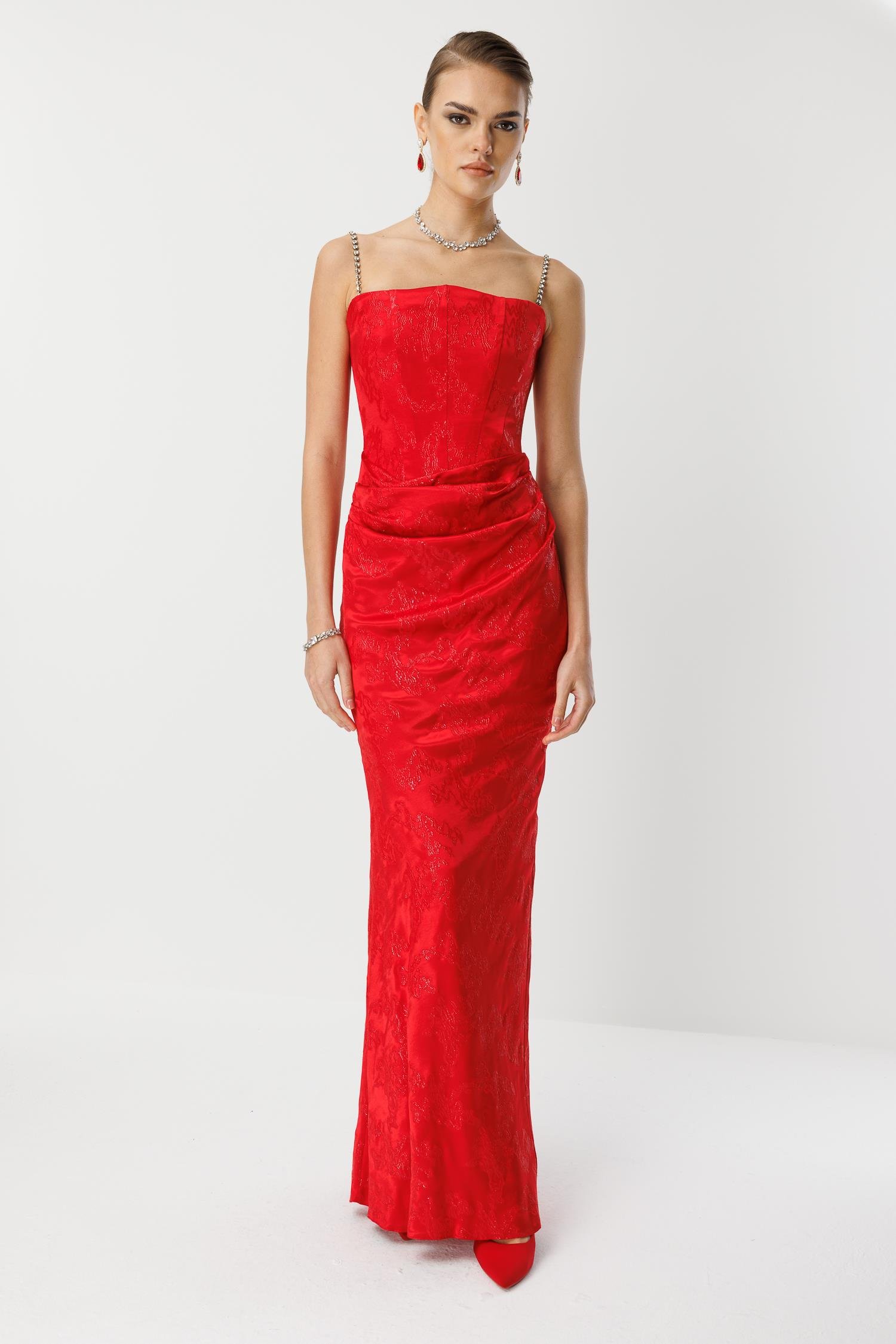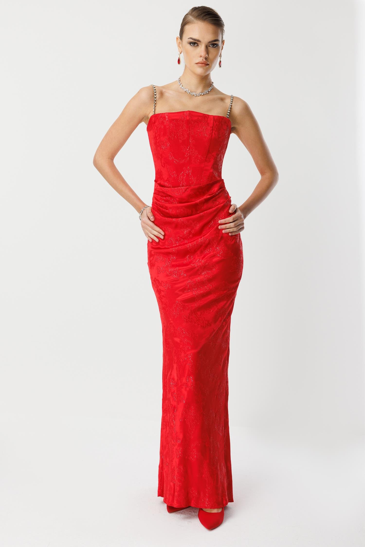 En görkemli galalar, özel açılışlar ve unutulmaz davetler için tasarlanmış, lüks ve büyüleyici bir model. Canlı kırmızı rengindeki bu uzun abiye elbise, özel jakar kumaşı, göz alıcı zincir askıları ve vücudu saran drapeli kesimi ile silüetinizi en çarpıcı haliyle öne çıkarır.