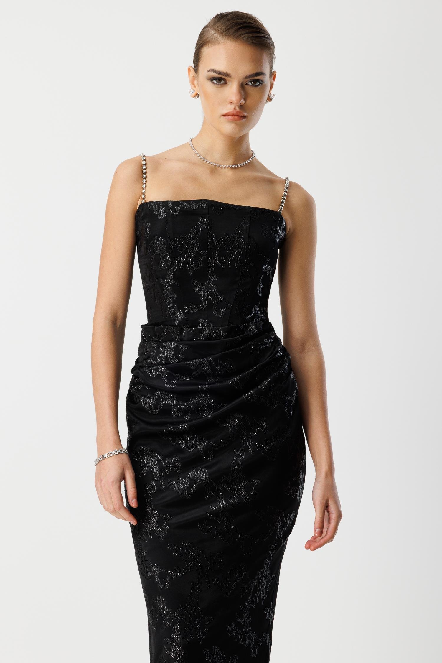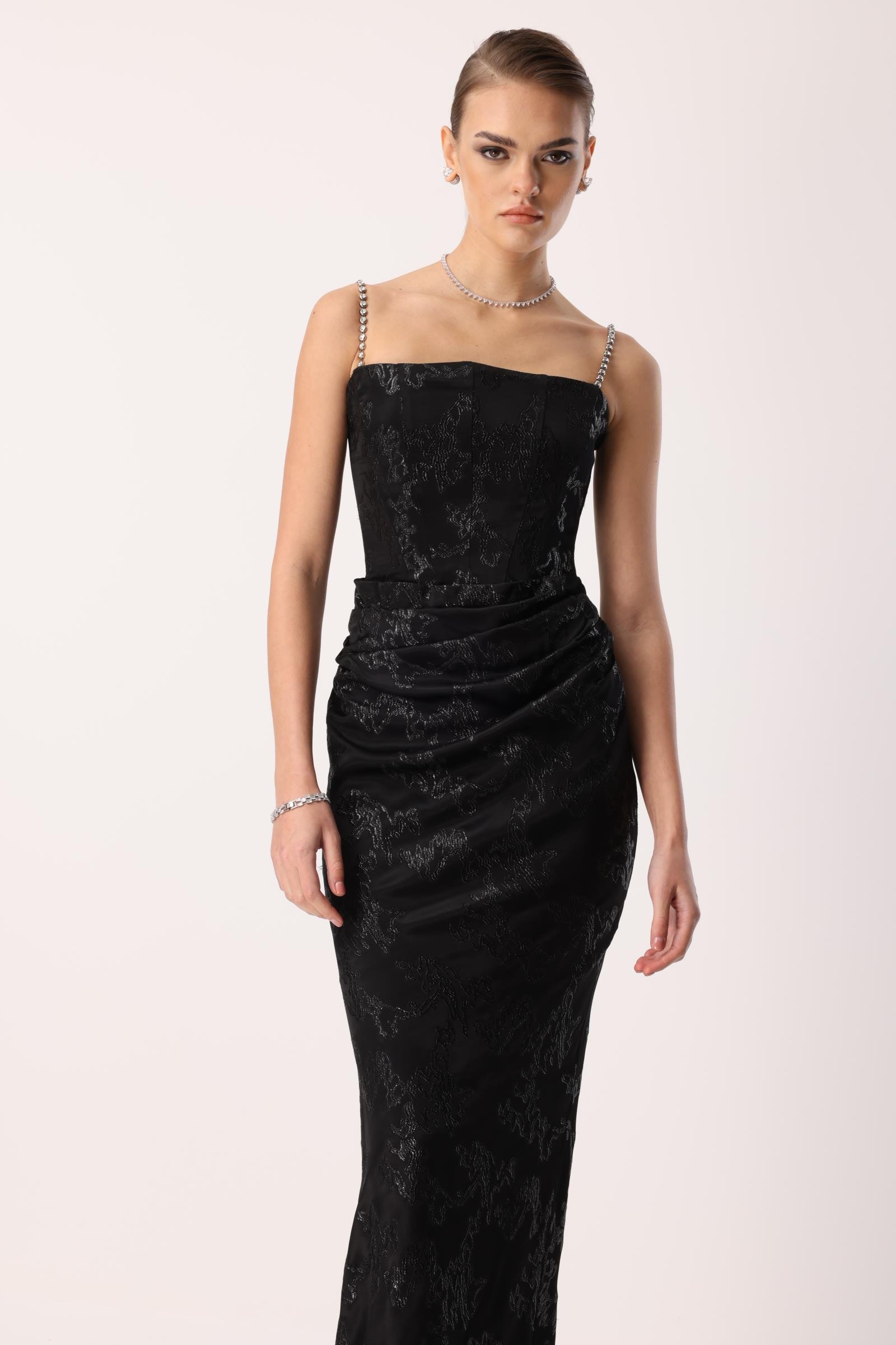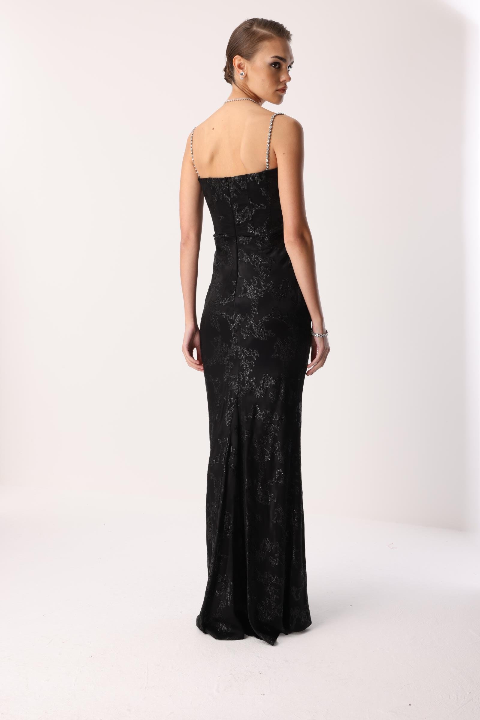 Askılar: Omuzlarda kullanılan ışıltılı zincir askılar, siyahın derinliği üzerinde modern ve lüks bir vurgu oluşturur.