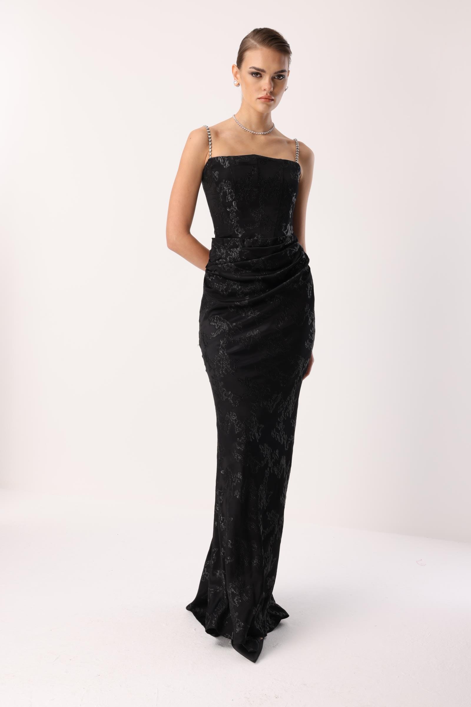 En şık davetler, galalar ve sofistike geceler için tasarlanmış, asil ve büyüleyici bir model. Asil siyah rengindeki bu uzun abiye elbise, lüks kumaşı, ışıltılı zincir askıları ve vücudu saran drapeli kesimi ile silüetinizi kusursuz bir zarafetle öne çıkarır.