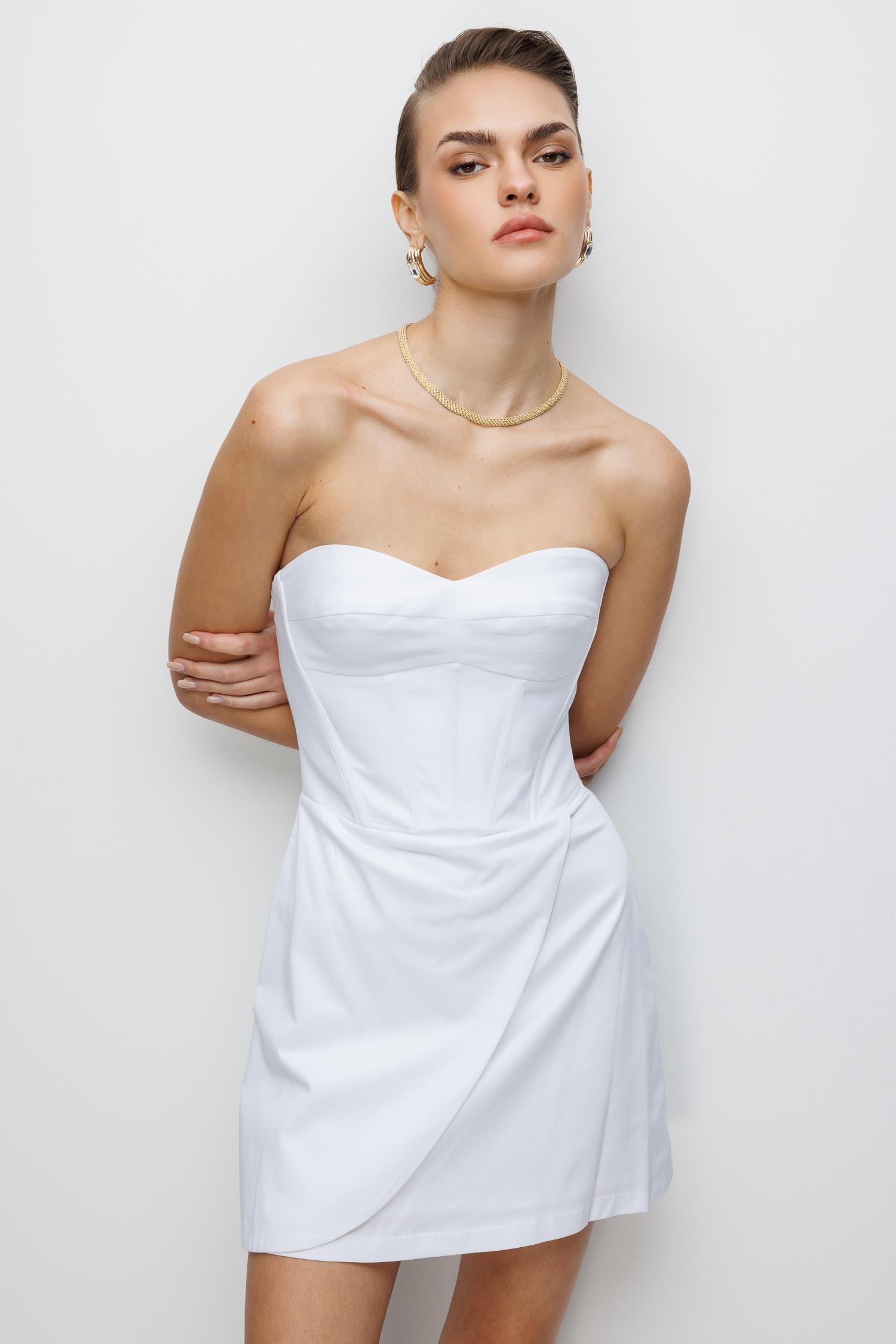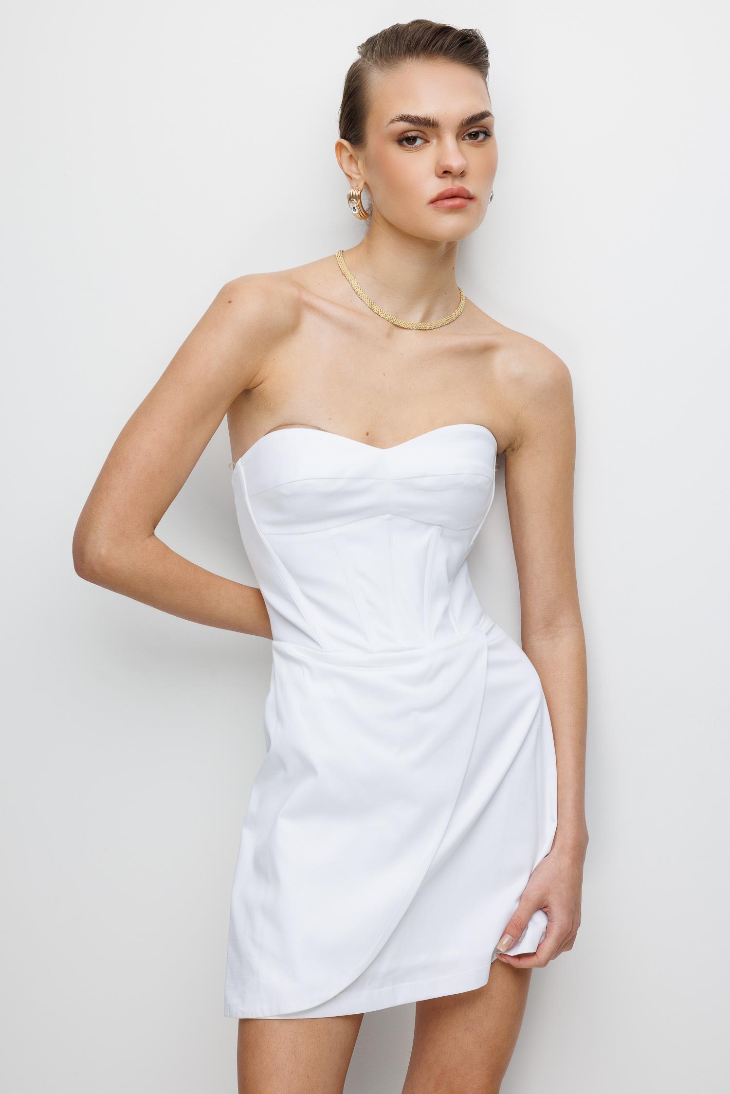 Ana Özellikler: Straplez Yaka, Mini Boy, Kruvaze/Drape Detaylı, Saf Beyaz Ton.