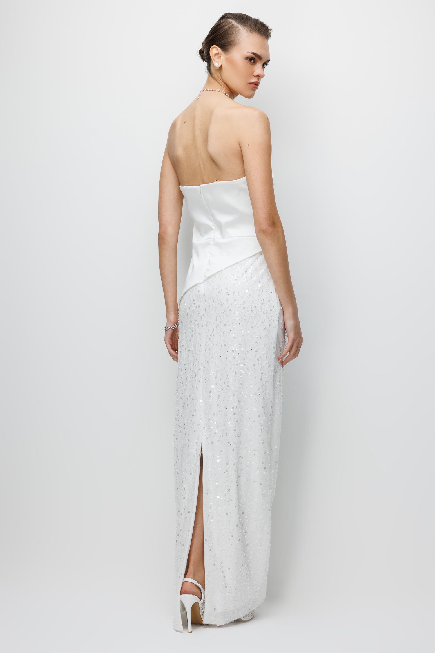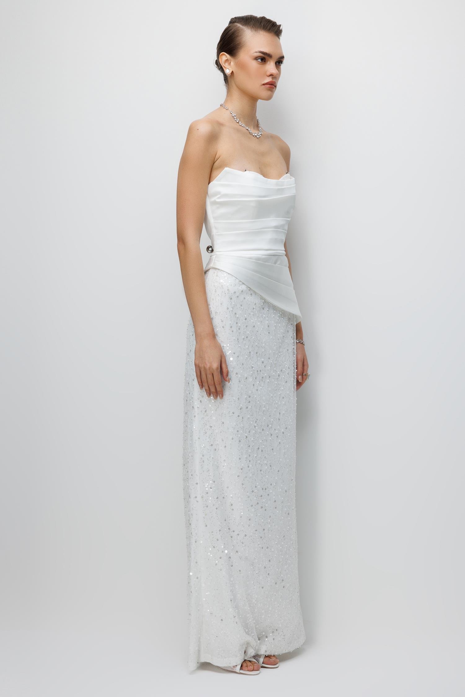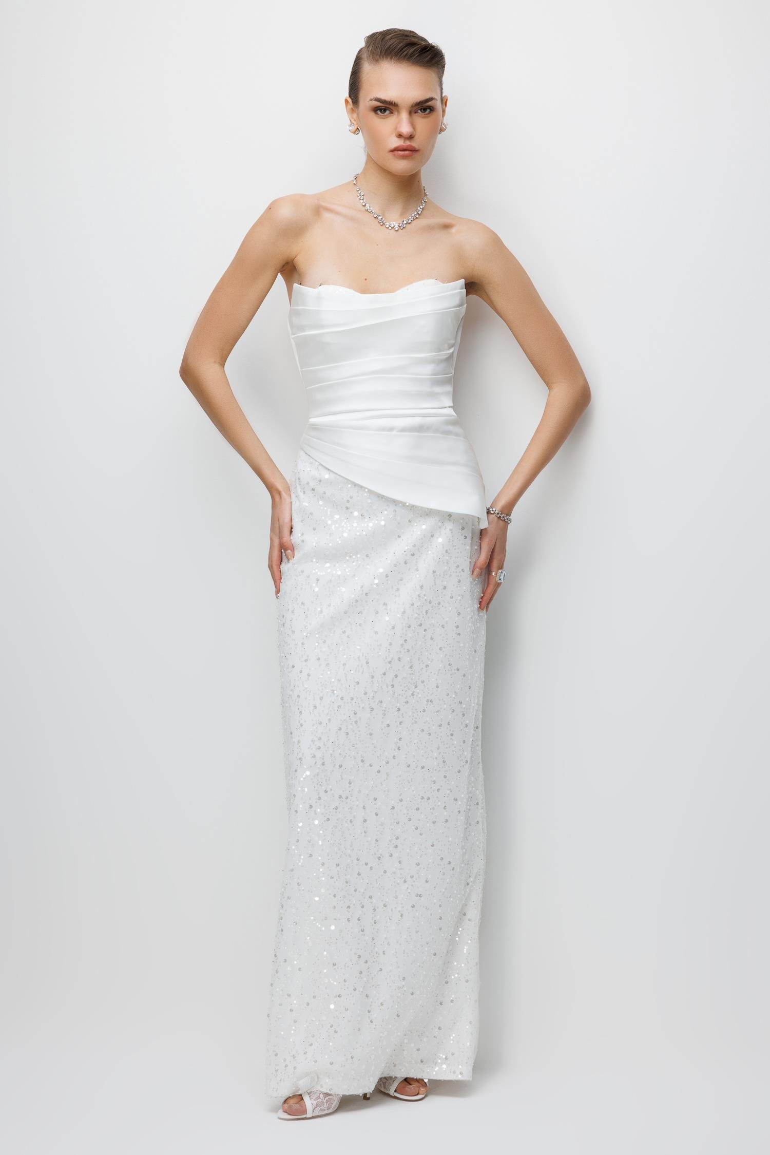Ana Özellikler: Straplez Yaka, Payet İşlemeli, Maxi Boy, Asil Ekru Ton.