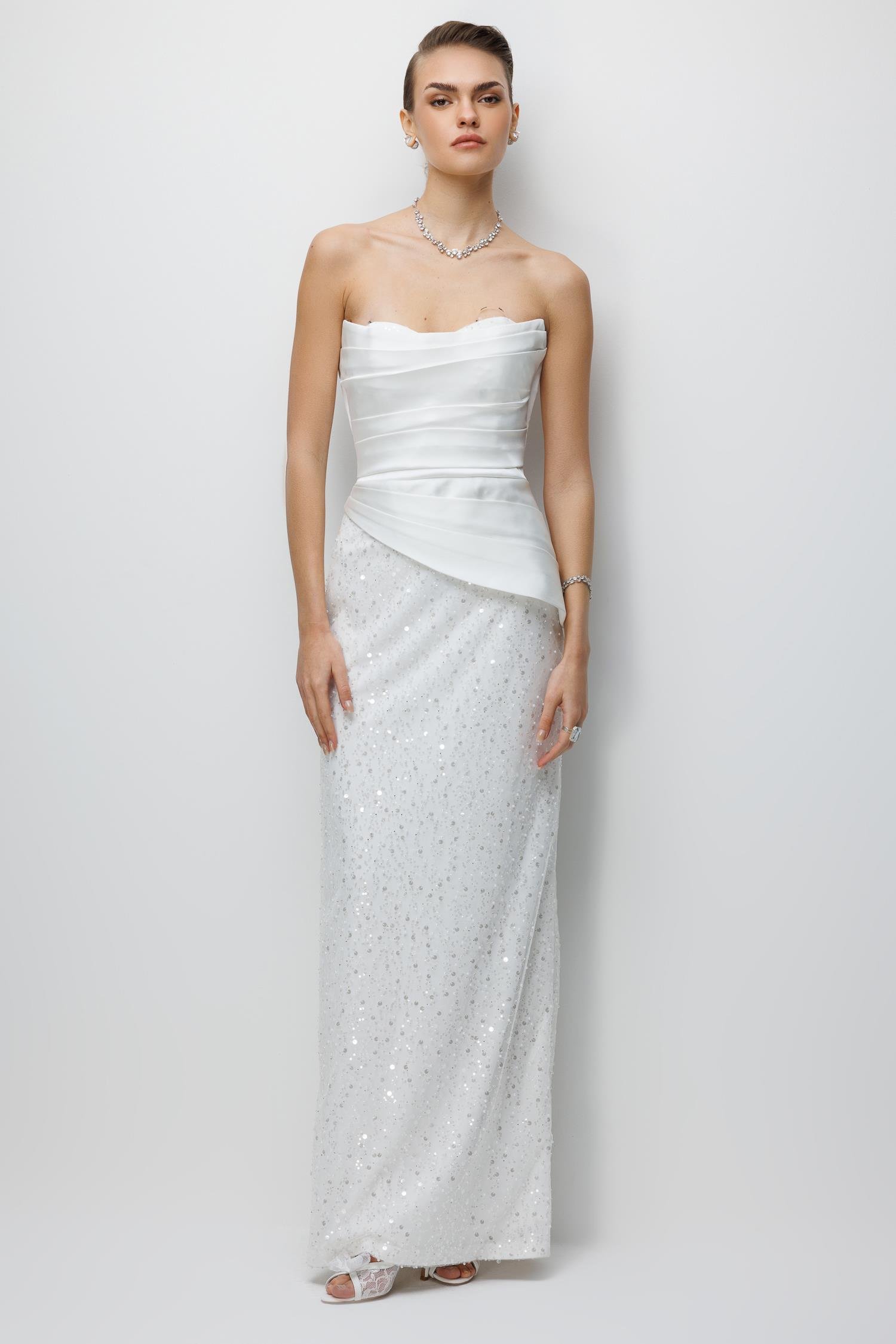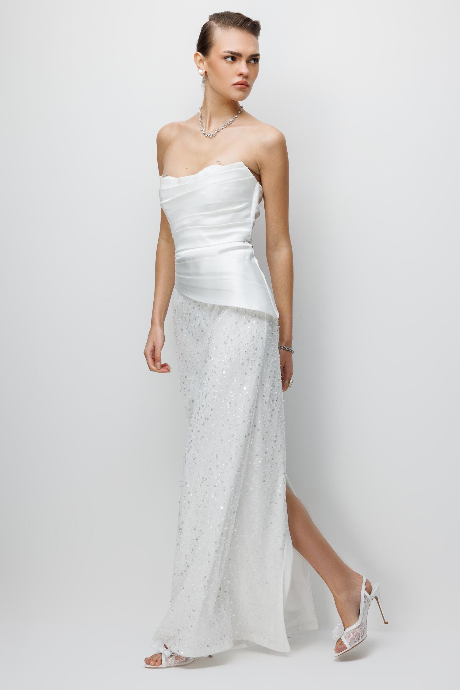 Bu elbise, nişanınız, lüks bir galada veya bir masal düğünündeki özel anlarınız için Ekru'nun saflığını ışıltıyla taşımak isteyenler için mükemmel bir seçimdir.