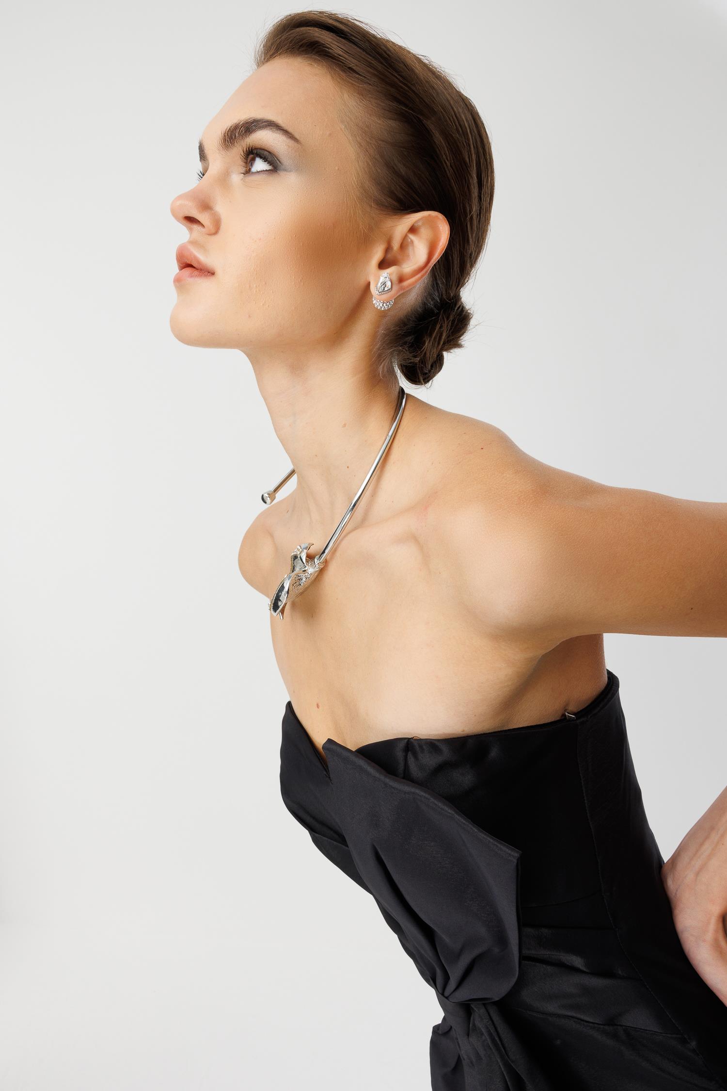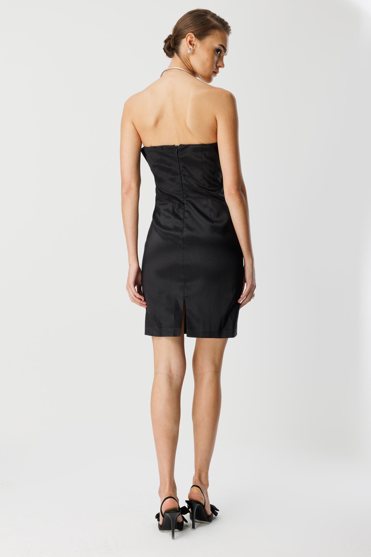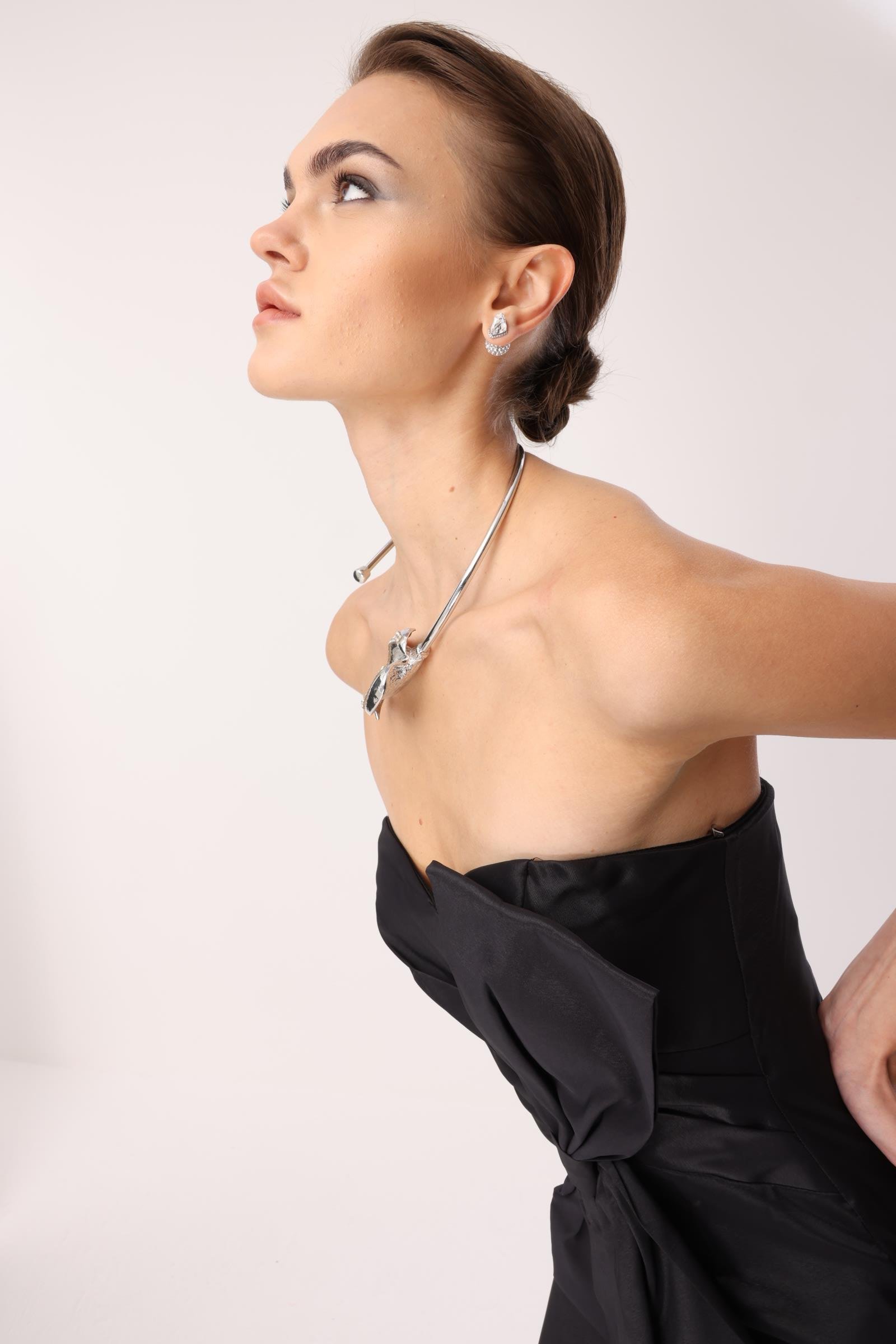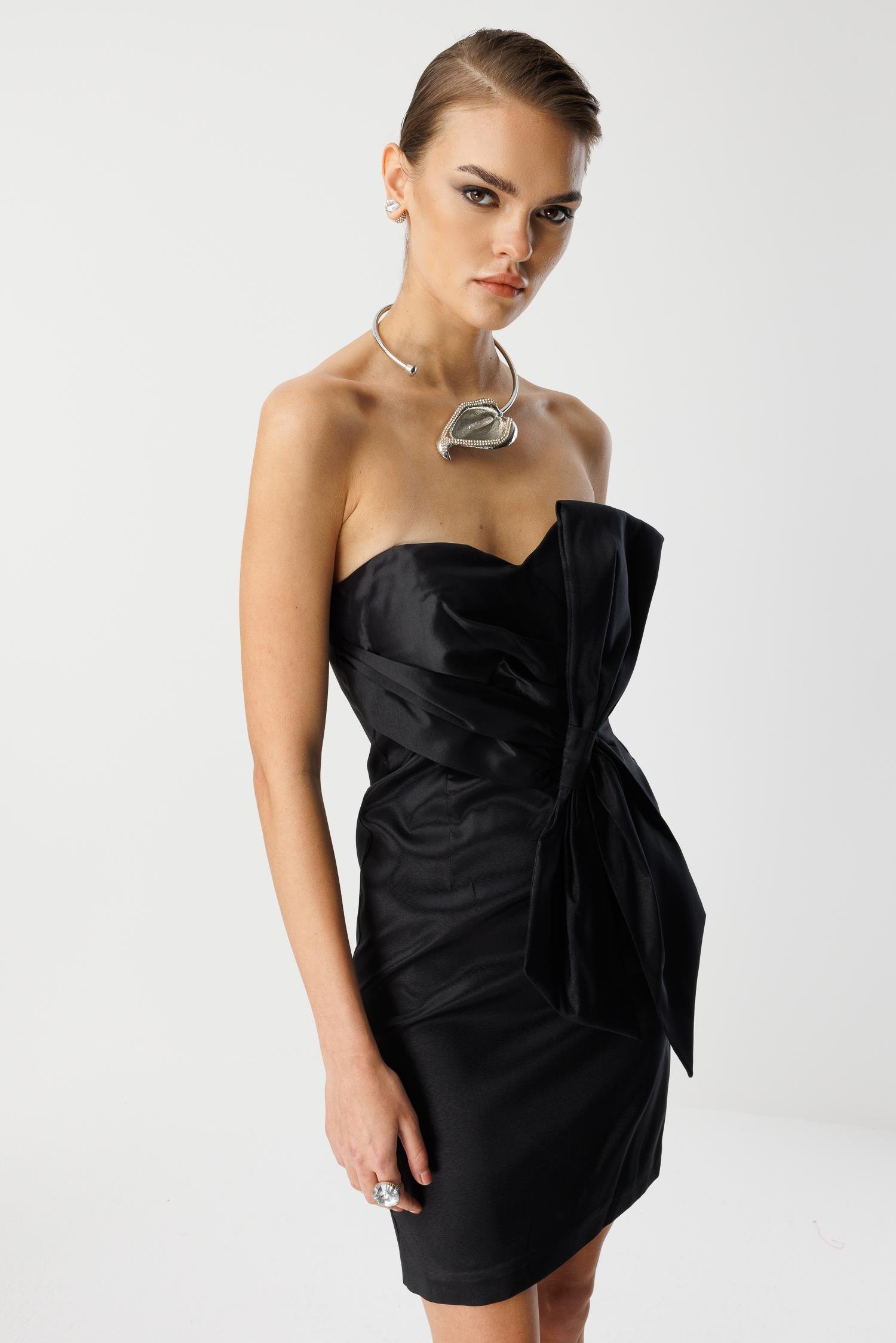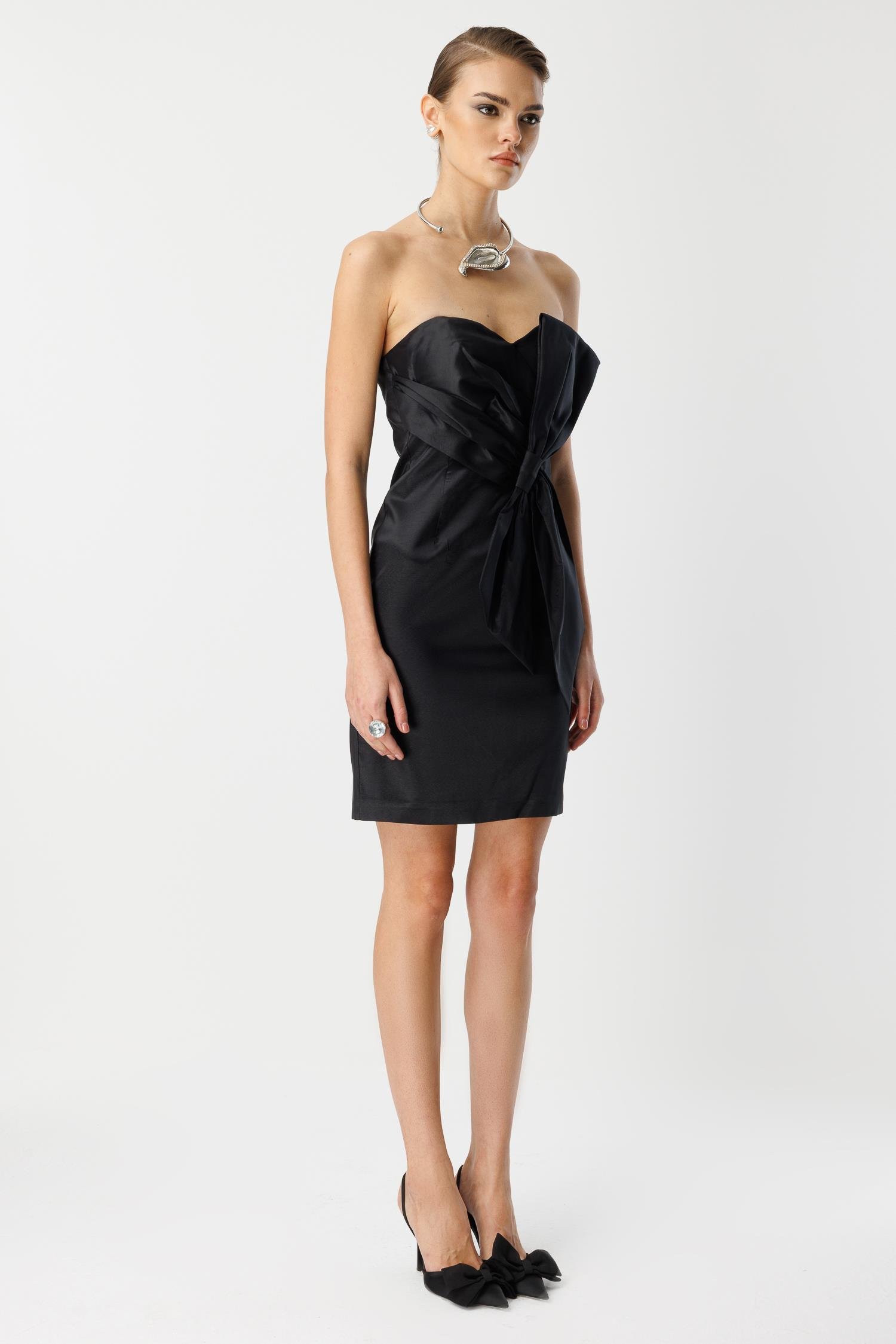 Detay Vurgusu: Göğüs kısmındaki asimetrik fiyonk detayı, elbiseye modern ve heykelsi bir form kazandırır.