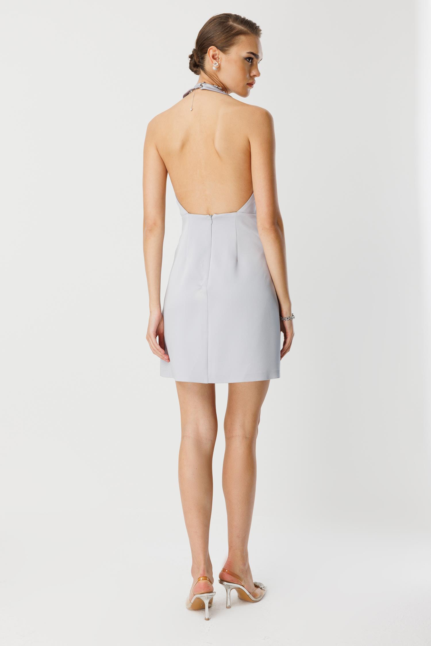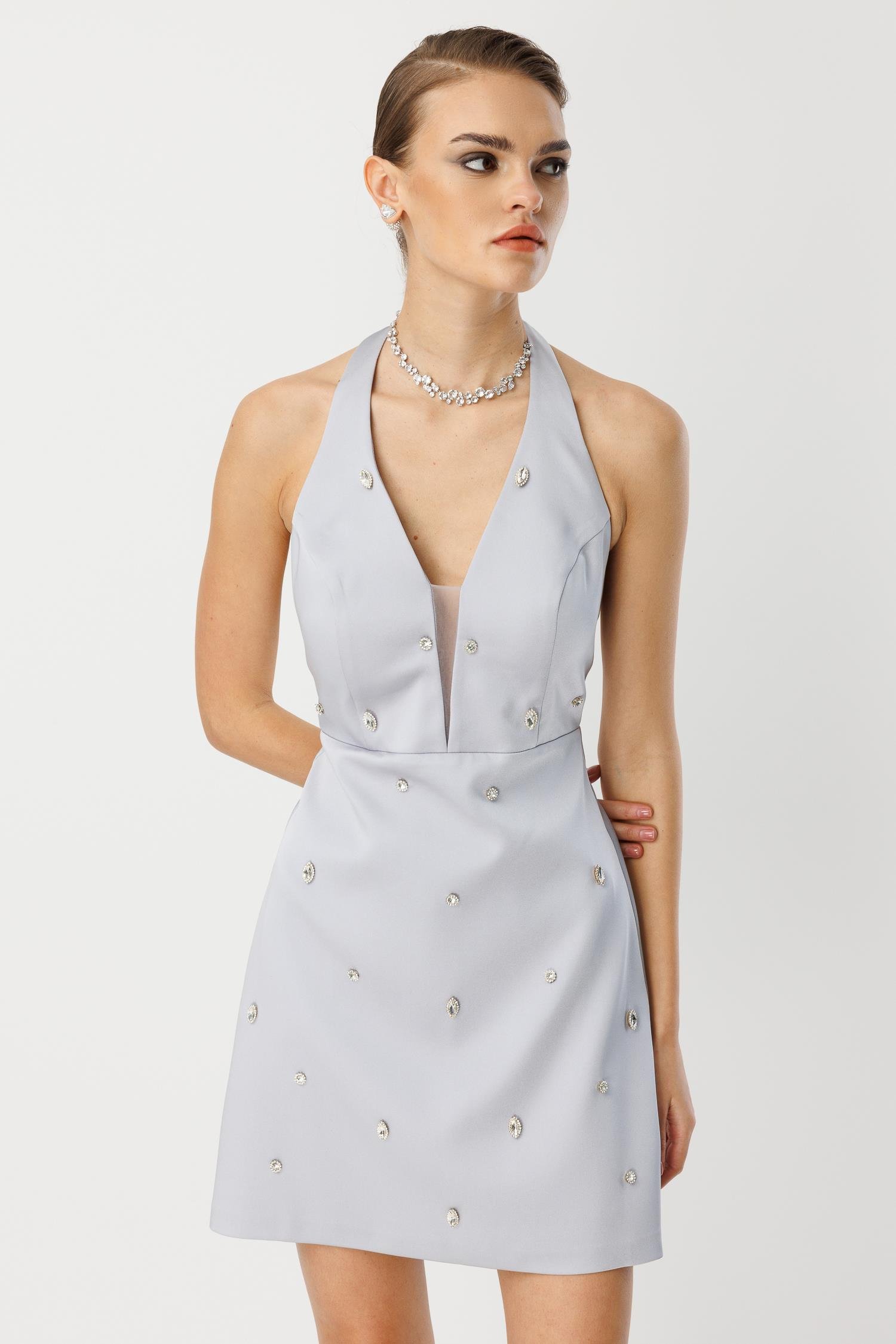 Taş Detayları: Elbisenin ön yüzeyine rastgele serpiştirilmiş, ışıltılı büyük taş (kristal) işlemeleri, gümüş rengi kumaş üzerinde lüks bir parıltı yaratır.