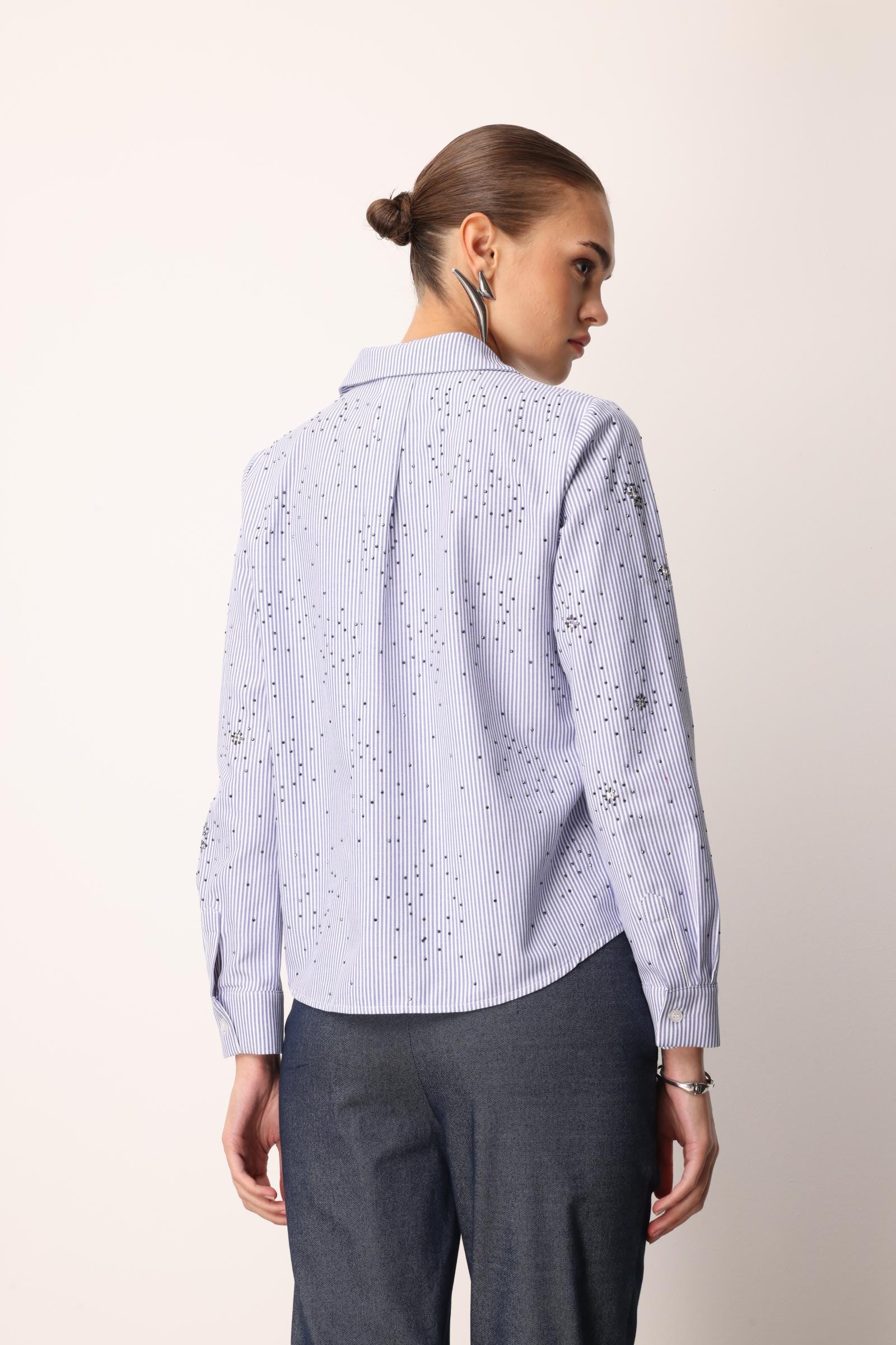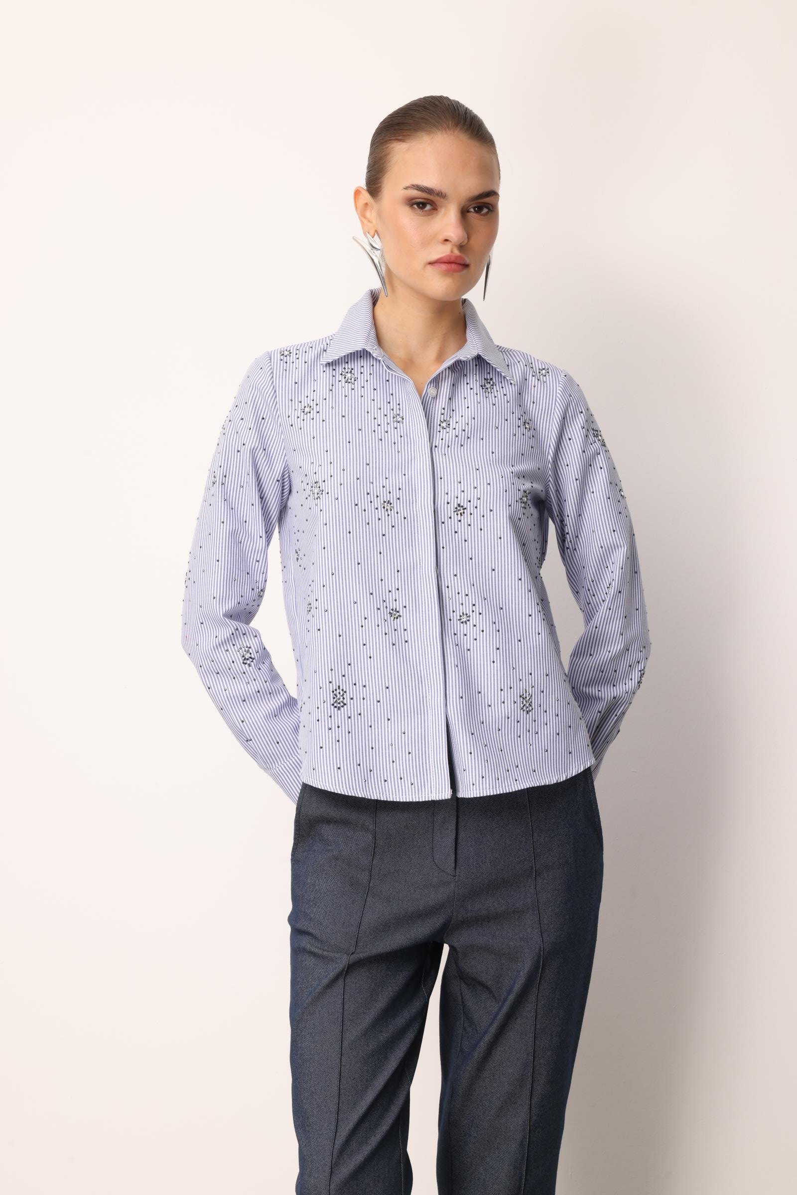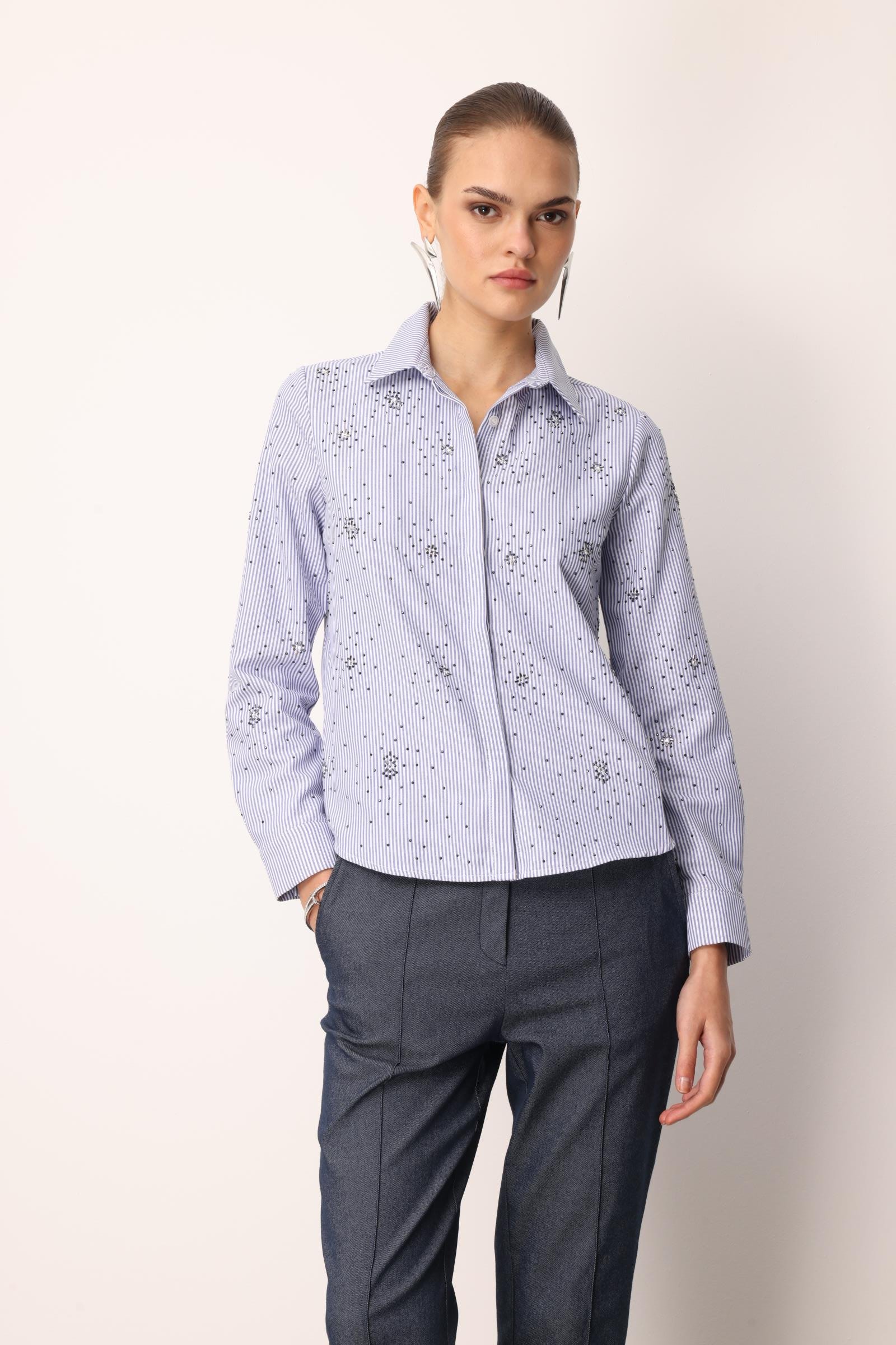 Klasik mavi-beyaz çizgili gömleğe modern ve ışıltılı bir dokunuş. Yüksek kaliteli poplin kumaşı üzerindeki minik boncuk/taş işlemeleri, gömleğin ön ve arka yüzeyine dinamik bir hareket katar. Ofis ve günlük giyimi, eğlenceli detaylarla birleştirir.