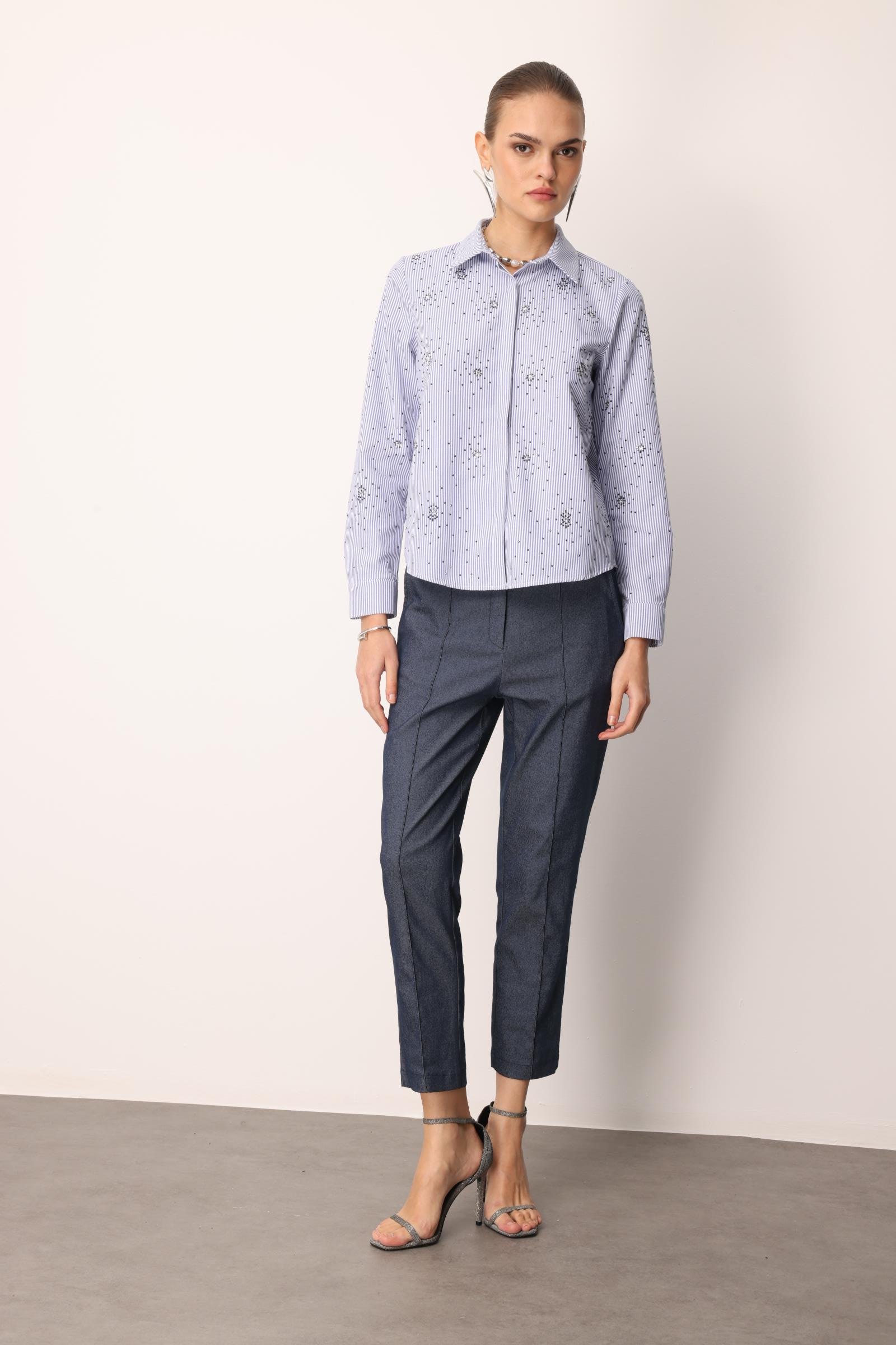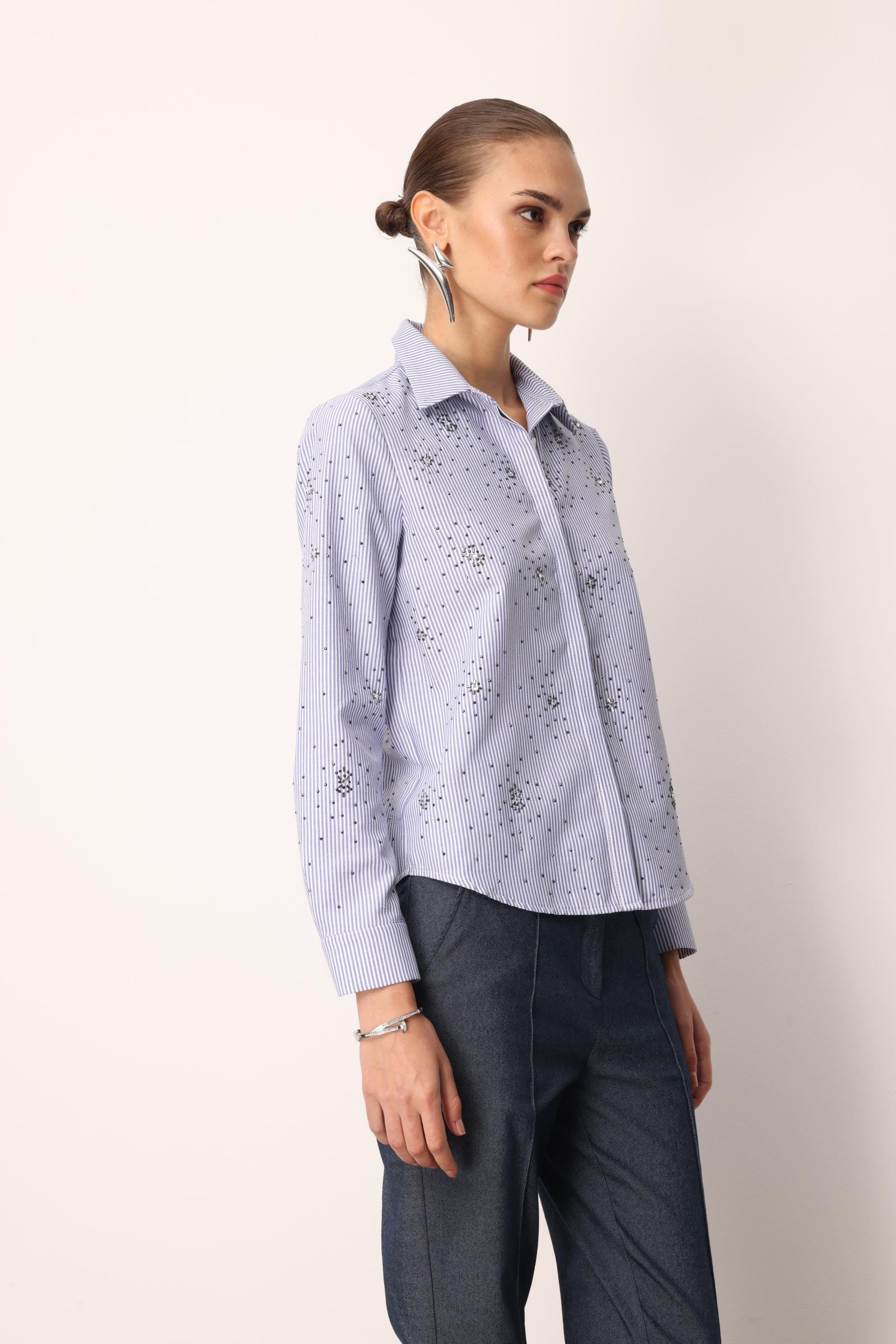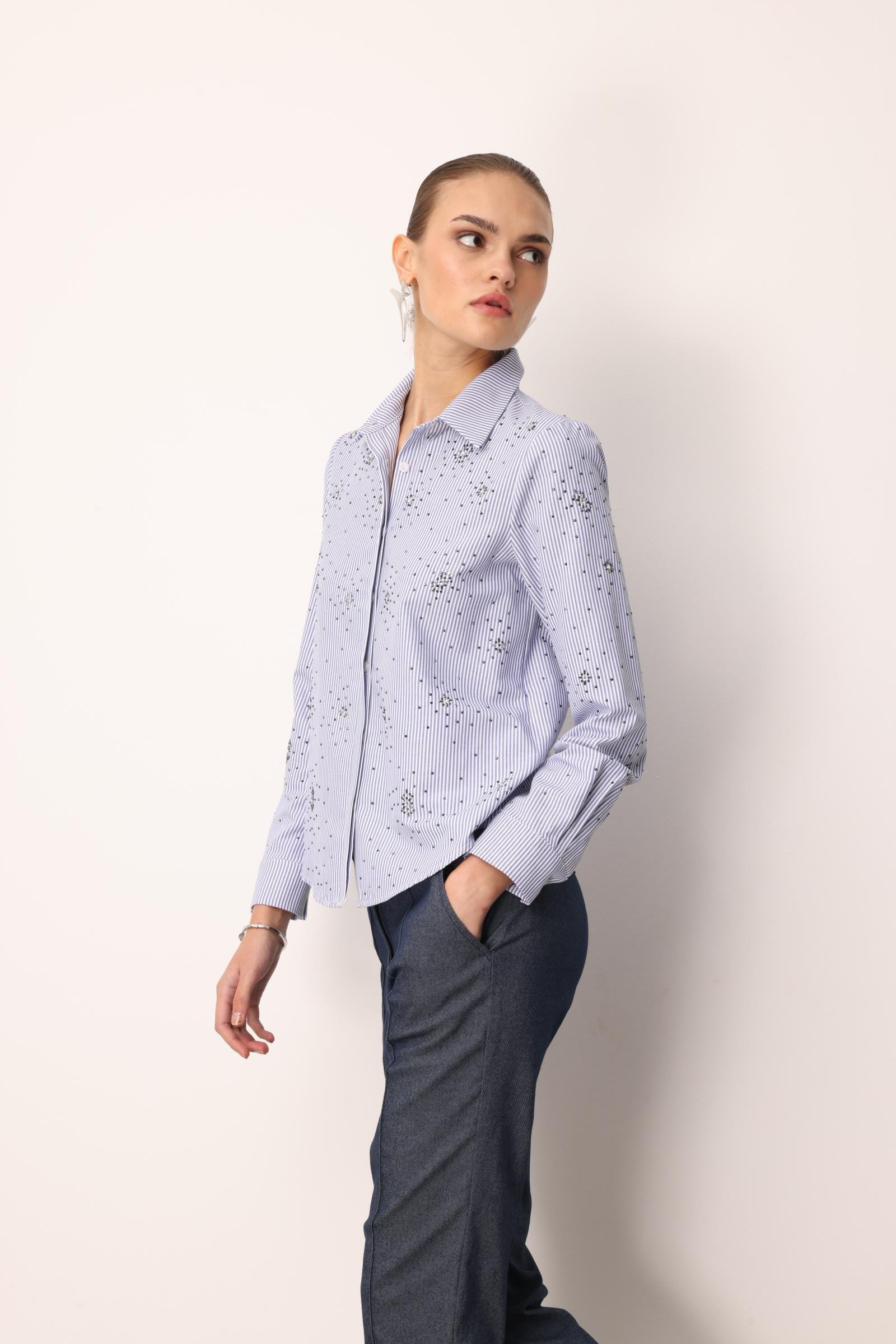 Klasik mavi-beyaz çizgili gömleğe modern ve ışıltılı bir dokunuş. Yüksek kaliteli poplin kumaşı üzerindeki minik boncuk/taş işlemeleri, gömleğin ön ve arka yüzeyine dinamik bir hareket katar. Ofis ve günlük giyimi, eğlenceli detaylarla birleştirir.