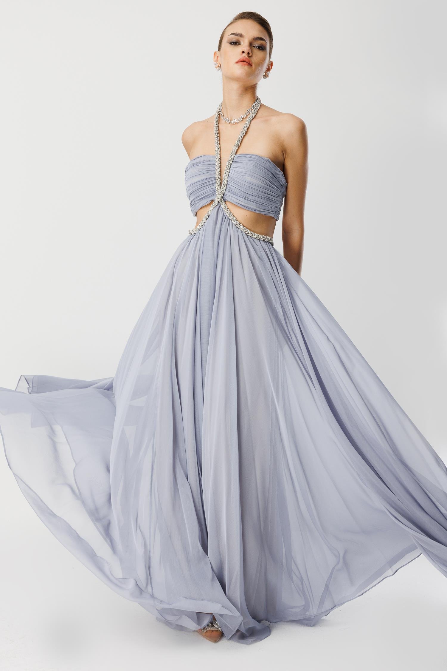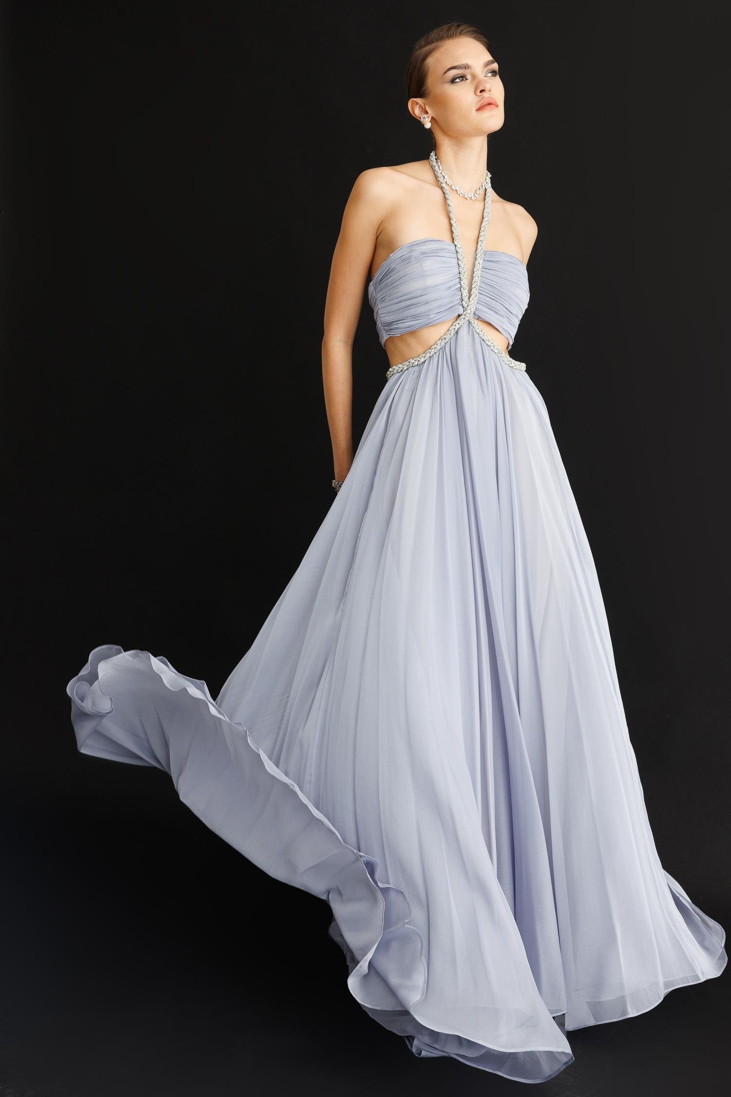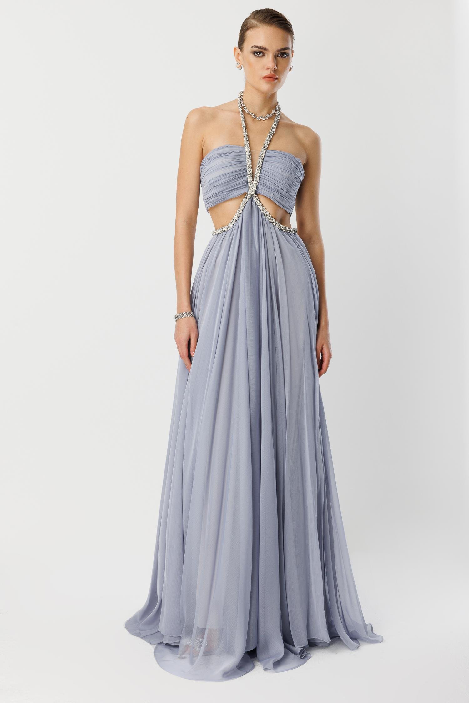 Girdiğiniz her ortamda nefesleri kesin. Aurora Kesimli Tül Elbise, adeta bir peri masalından fırlamışçasına, sizi en özel anlarınızın yıldızı yapacak. Uçuşan lavanta tonlu şifon eteği ve cesur dekolte kesimi ile zarafet ve cüretkarlığı birleştiriyor. Bel kısmındaki göz alıcı, el işçiliği kristal detaylar, vücudunuzu kusursuzca sararak silüetinizi yüceltir. Unutulmaz bir balo, nişan veya kırmızı halı etkinliği için tasarlanmıştır. Bu elbise sadece bir giysi değil, bir ifadedir.