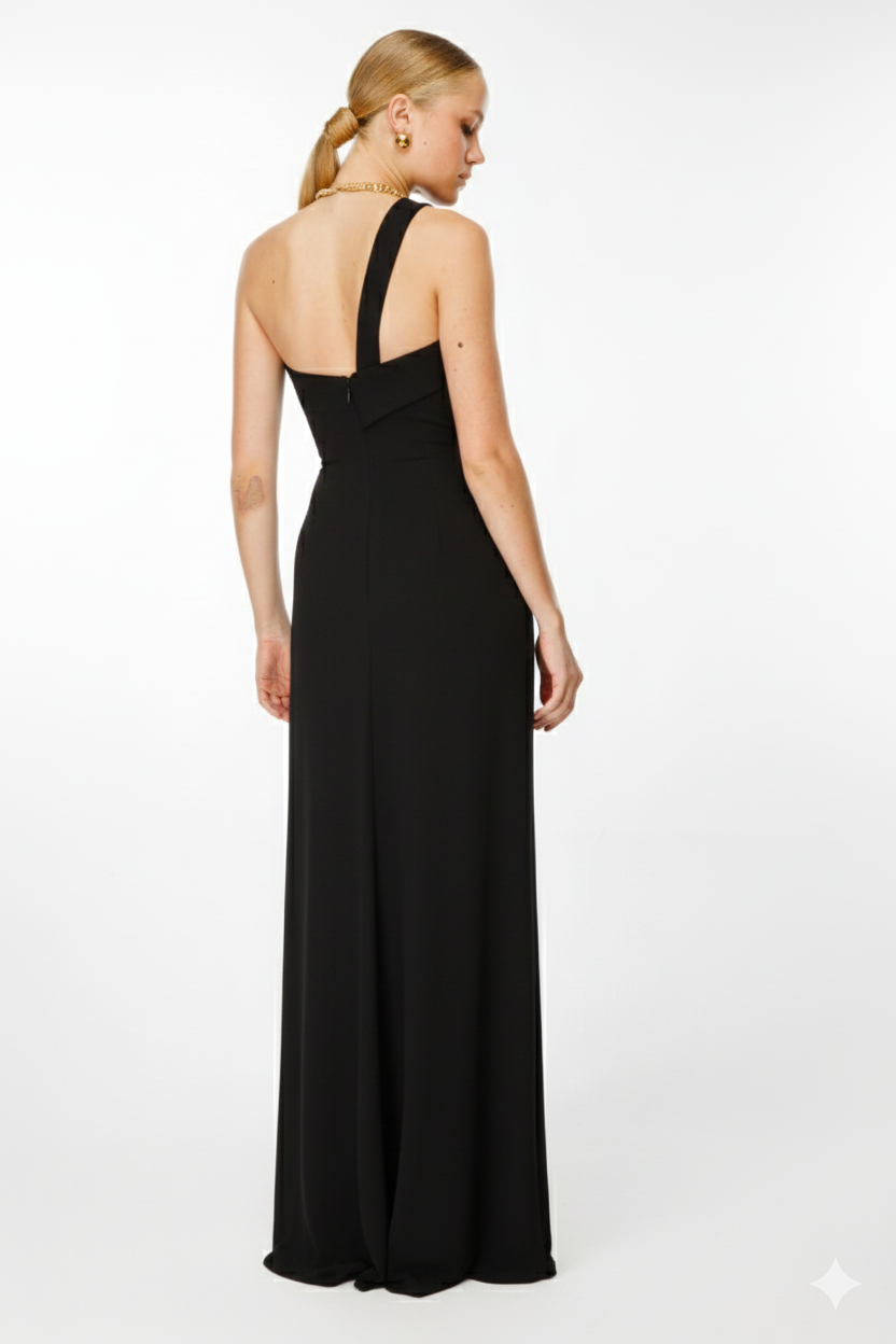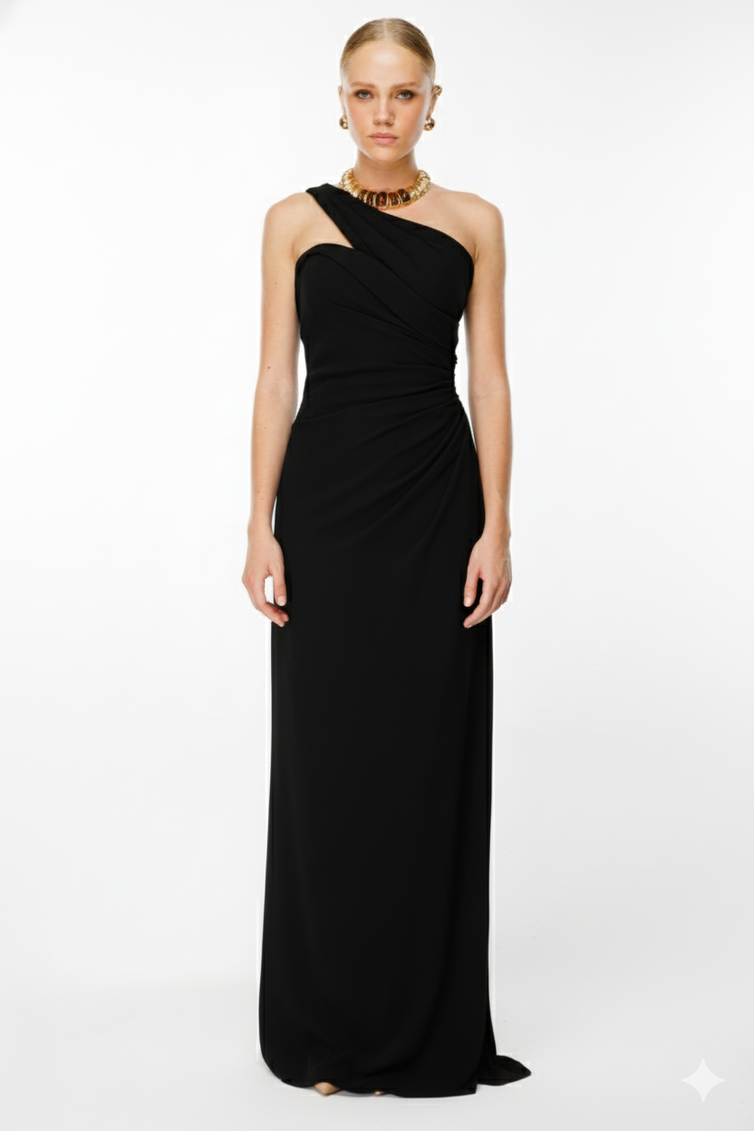 Tek Omuzlu Drapereli Maksi Elbise: Vücudu kusursuzca saran krep dokusu ve asimetrik yaka detayıyla gece şıklığının en üst noktası. Bel bölgesindeki özel drapeler, zarif bir form sunarken derin yırtmaç detayı hareket özgürlüğü ve çekicilik sağlar.