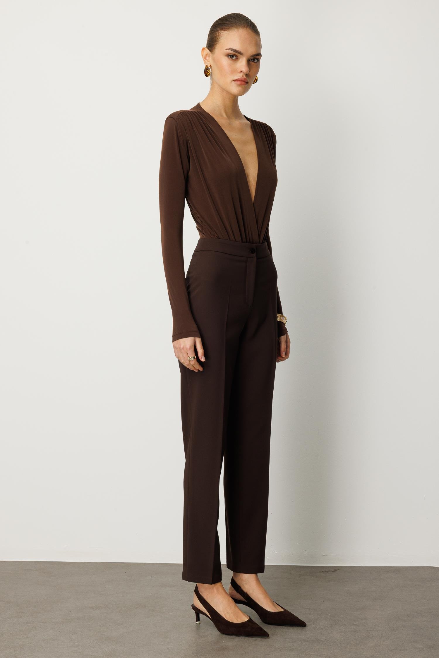 2. Sofistike Akşam (Body ile): Kahverengi derin V yaka body (üst) ve zarif topuklu ayakkabılarla birleştirerek, akşam davetleri için şık ve iddialı bir kombin oluşturun.