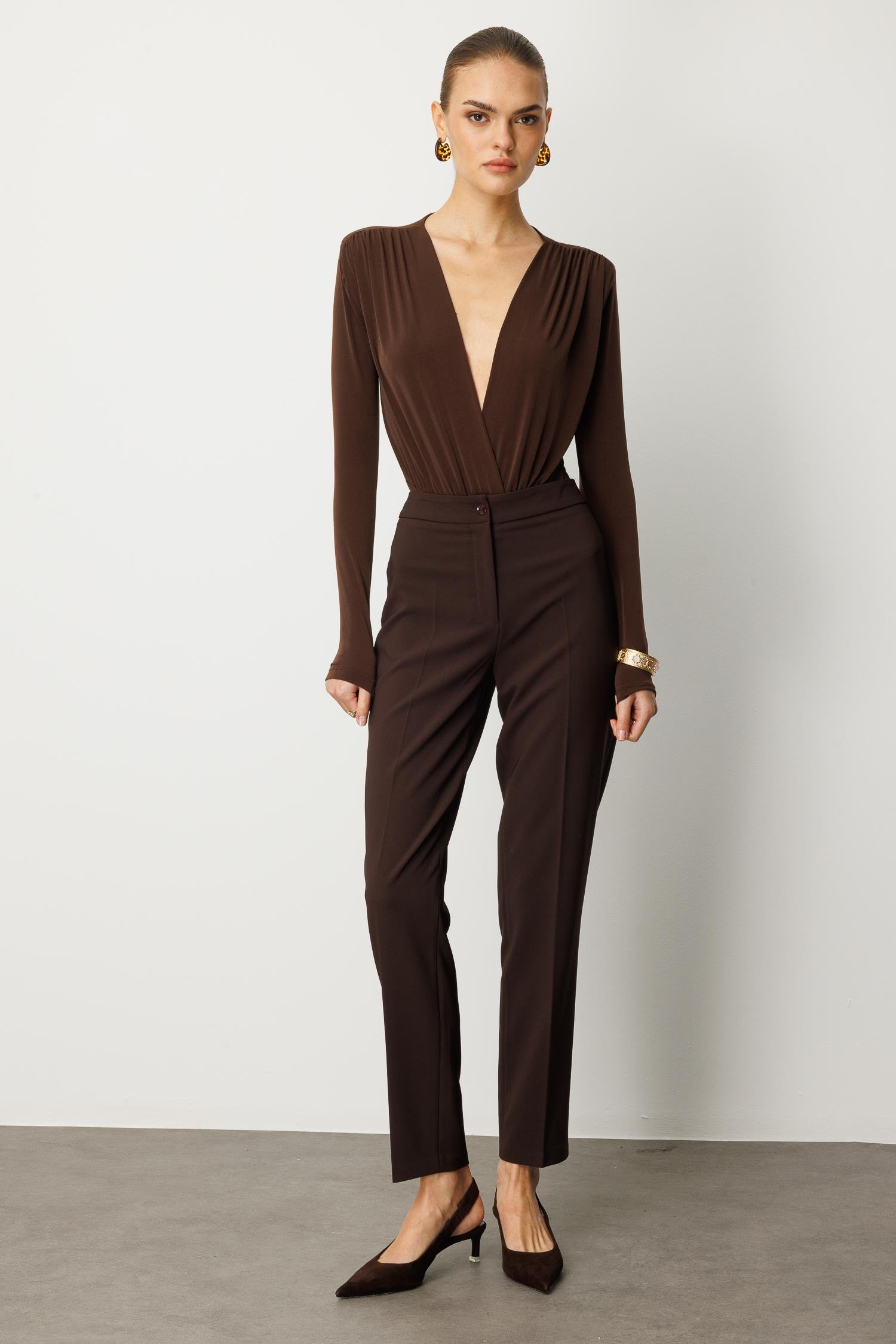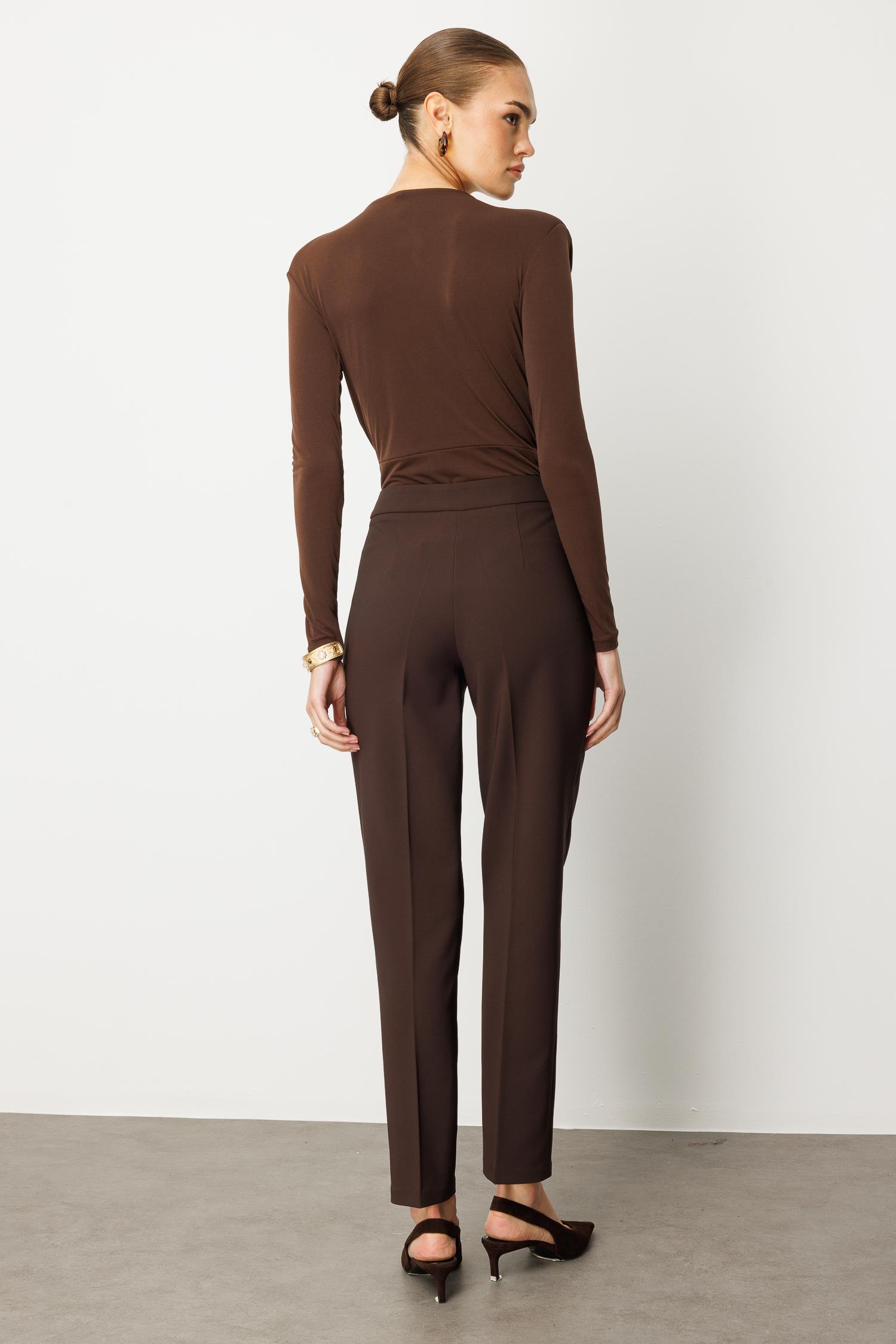 Gardırobunuzun en çok yönlü ve elegant parçası olmaya aday. Derin, zengin koyu kahverengi tonuyla tasarlanan bu pantolon, hem ofis şıklığında hem de iddialı akşam kombinlerinde kusursuz bir temel oluşturur. Yüksek beli ve vücuda tam oturan düz kesimi sayesinde, bacak boyunuzu anında uzatarak zarif bir silüet yaratır.