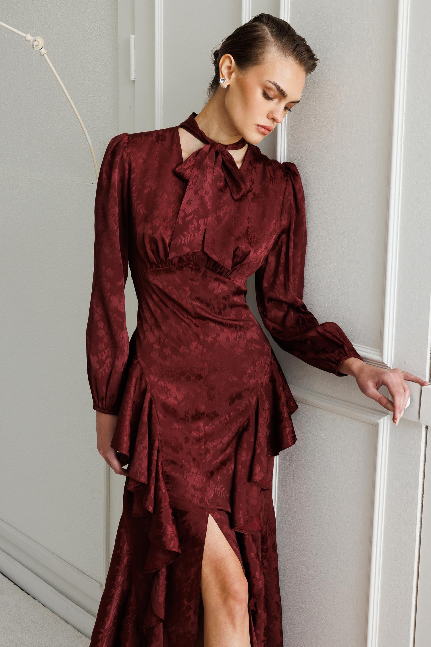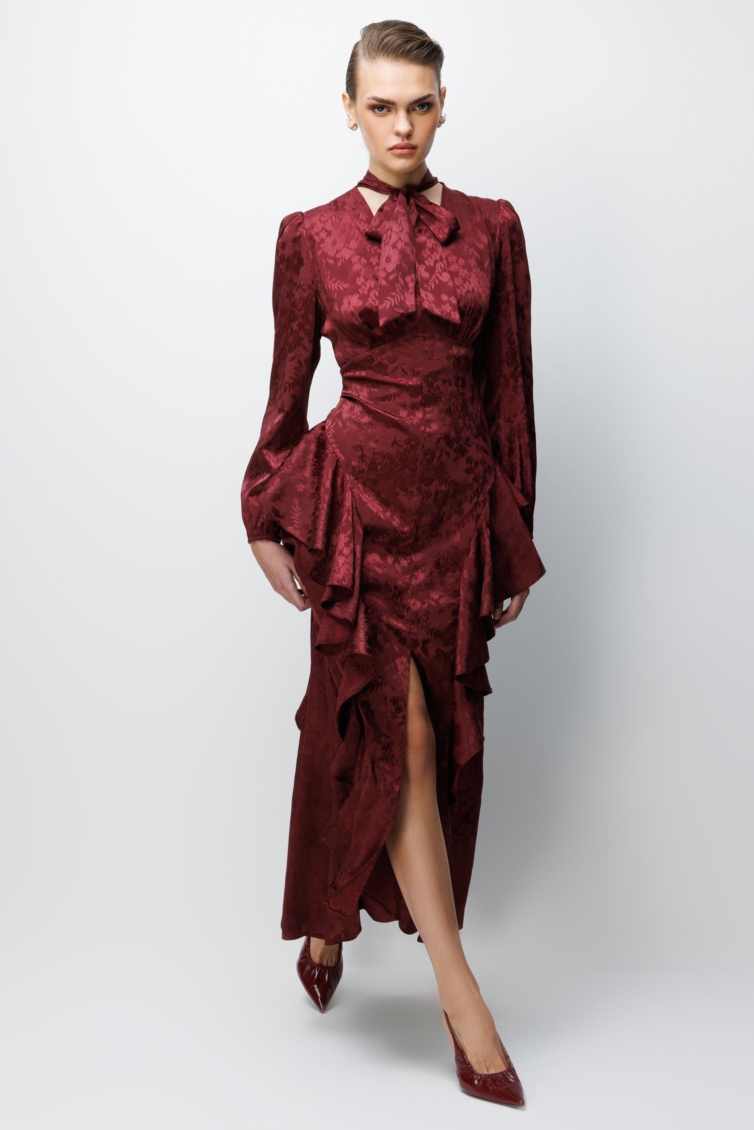Ürün Açıklaması: Zarafeti ve modern detayları bir araya getiren bu özel tasarım elbise, gardırobunuzun en ikonik parçası olmaya aday. Kendinden desenli jakar kumaşın asil dokusu, hareketli volan detaylarıyla birleşerek her adımda büyüleyici bir silüet yaratır. Göğüs altından oturan kesimi ve boyun bağlama detayı, feminen hatları ön plana çıkarırken; yırtmaçlı tasarımı cesur ve modern bir dokunuş katar. Özel davetlerden akşam yemeklerine kadar her ortamda çabasız şıklığın anahtarı.