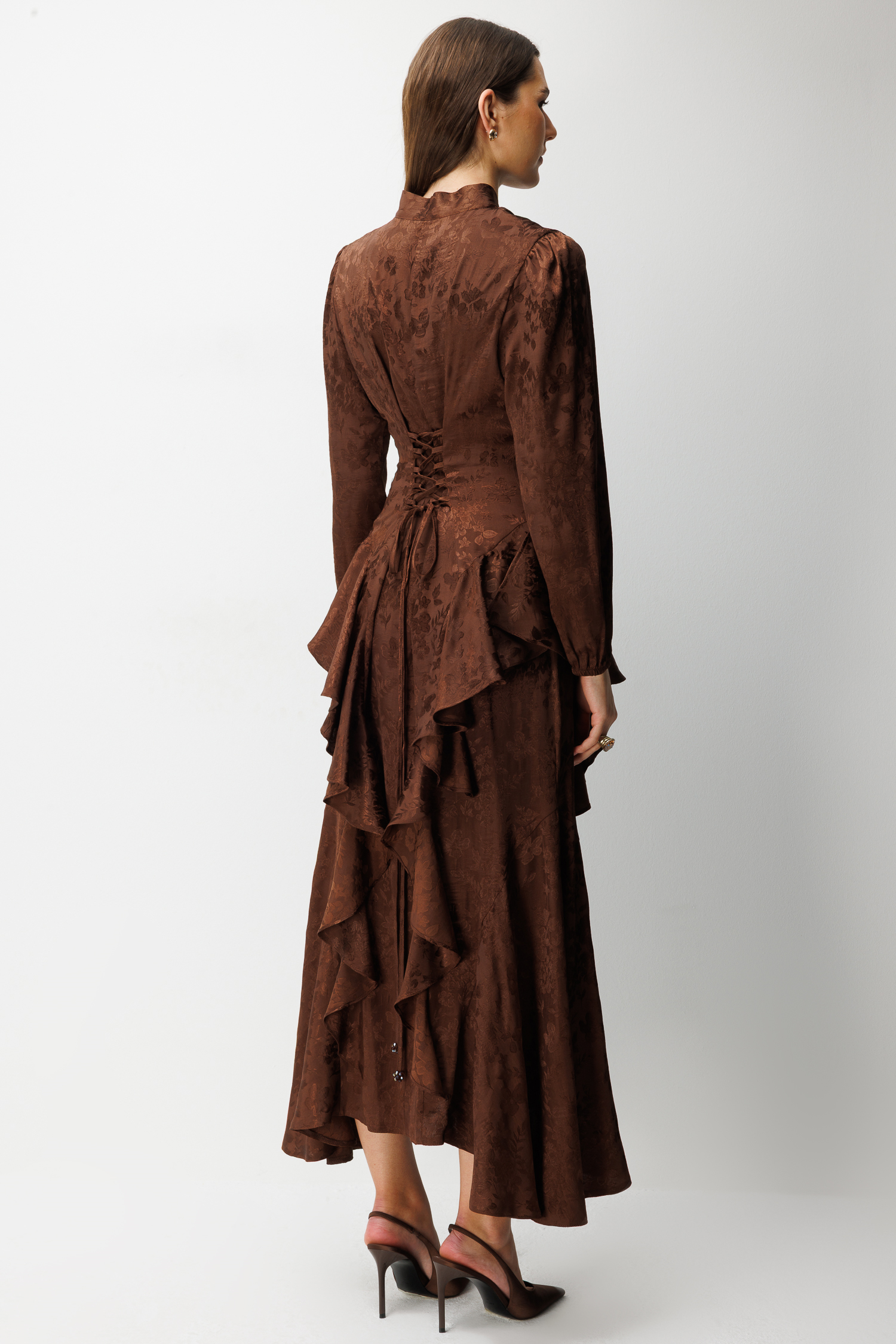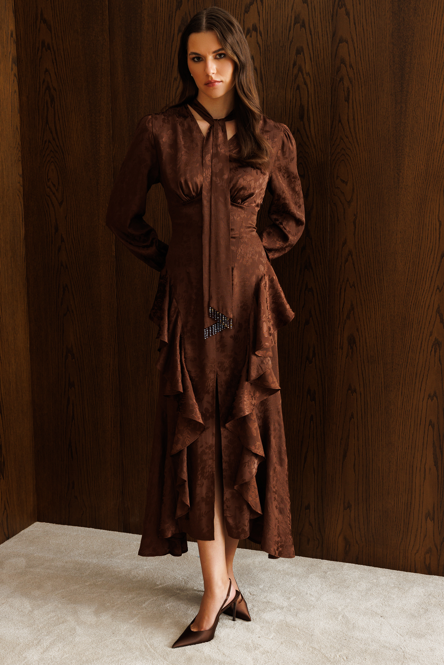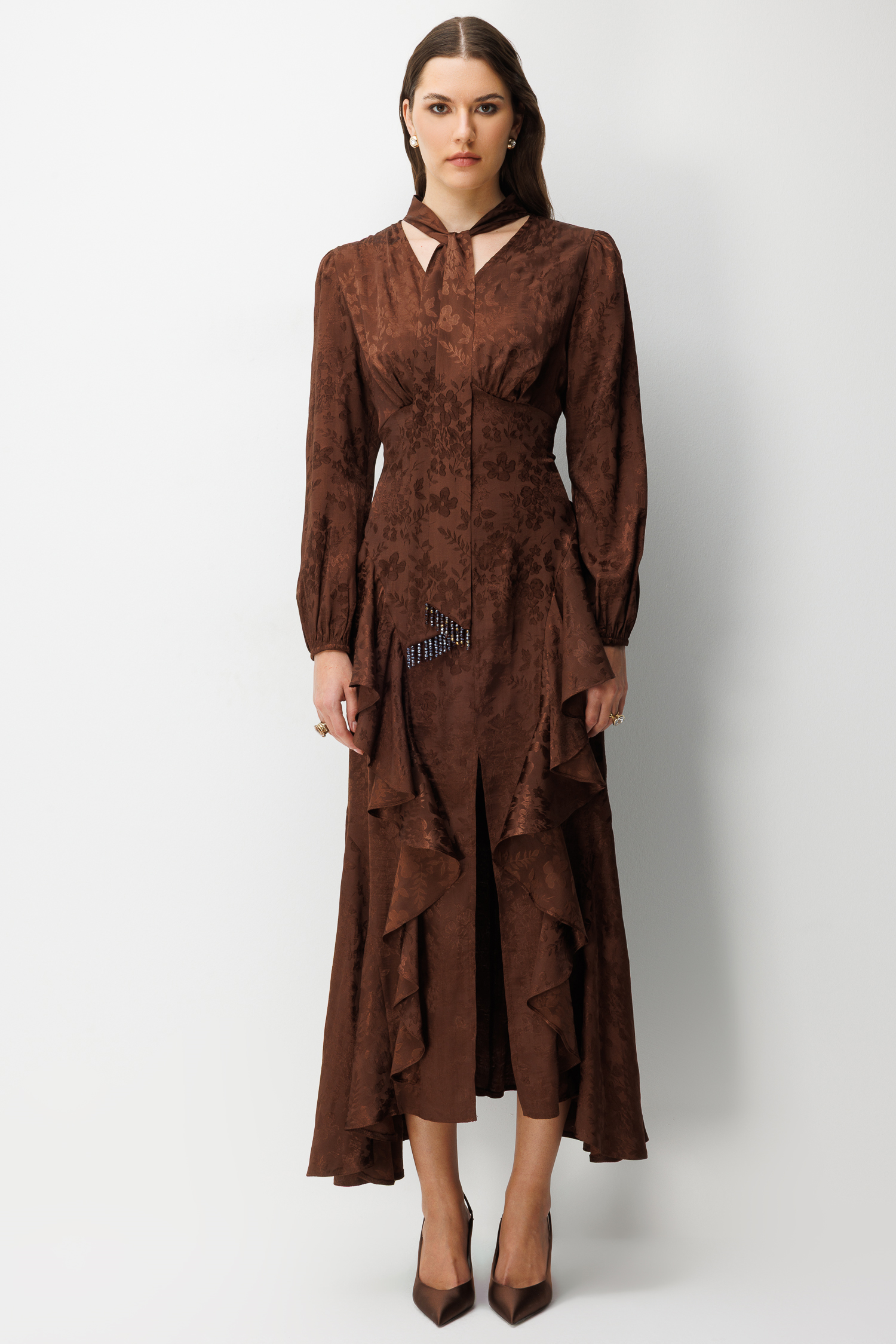 Detaylar: Boyundan bağlamalı fular yaka, bel vurgulu kesim, asimetrik volanlar, ön yırtmaç.