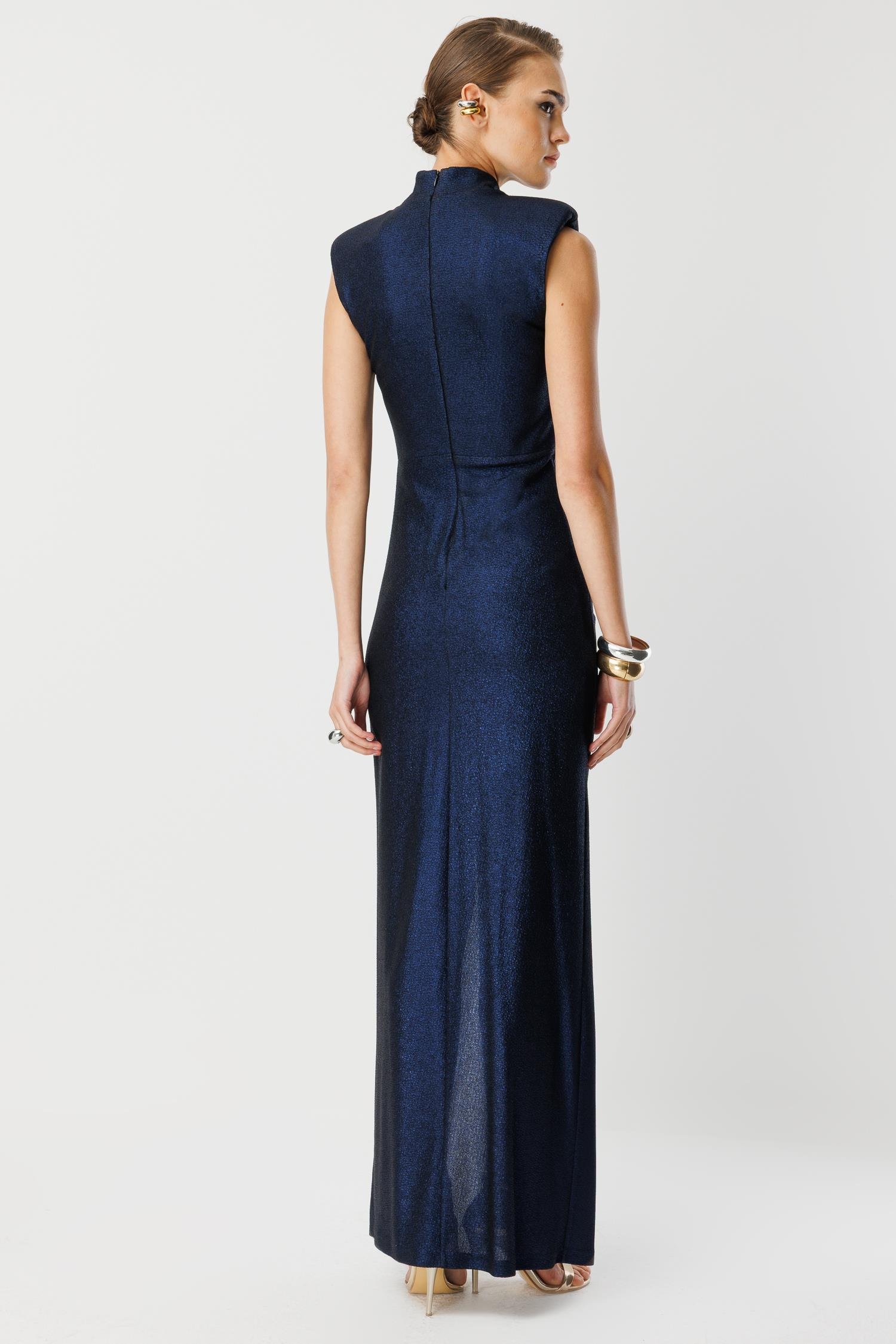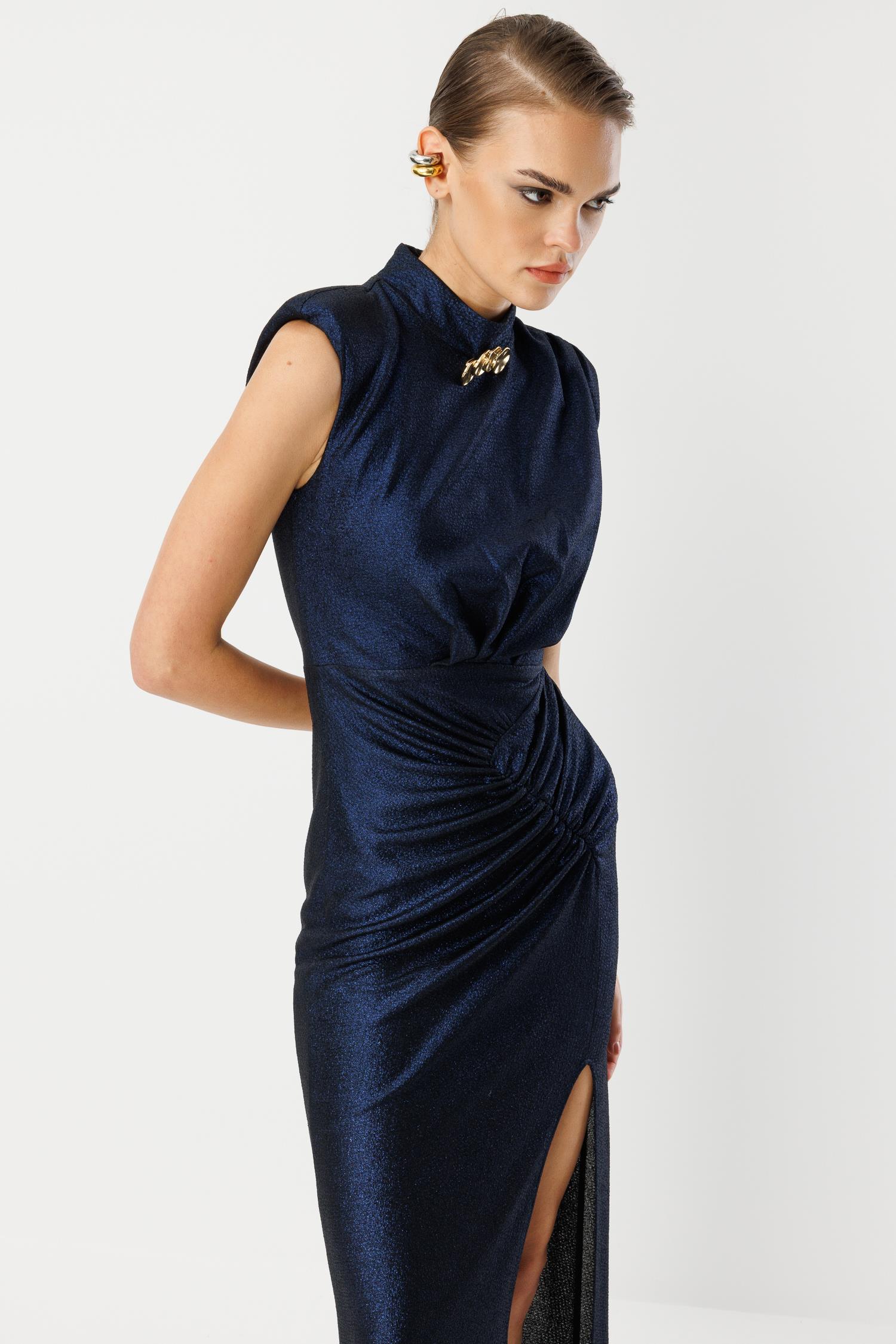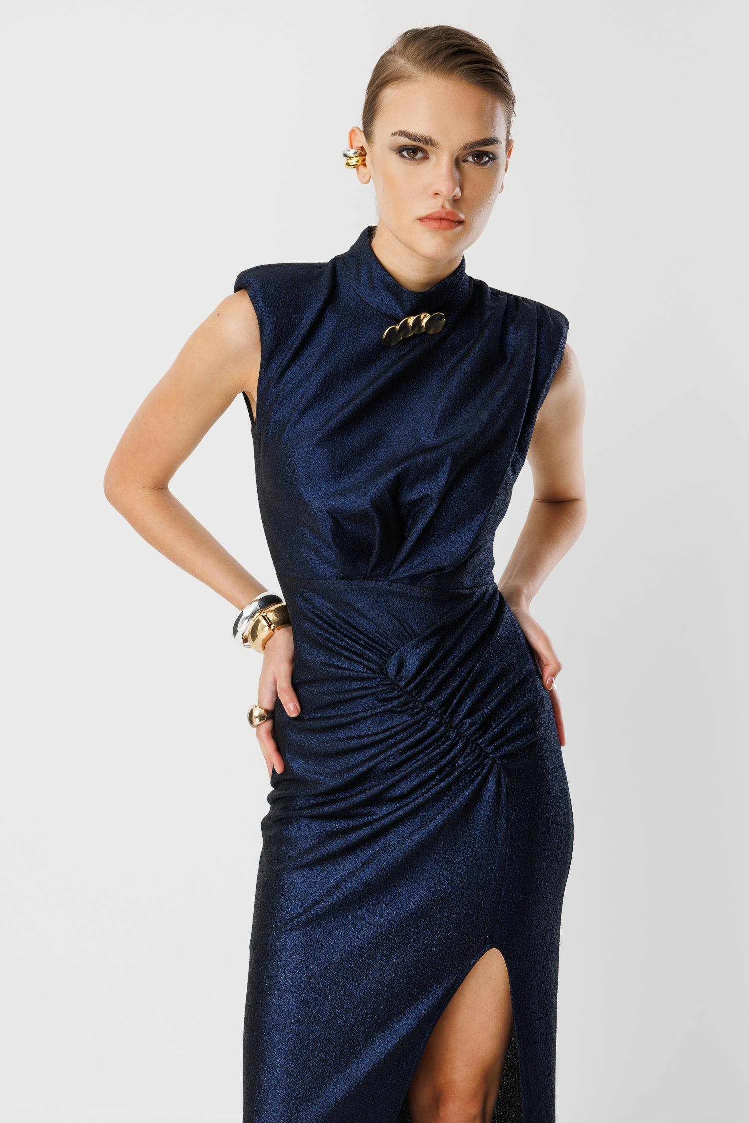 Özel galalar, şık davetler ve gece kulüpleri için tasarlanmış, iddialı ve modern bir model. Simli lacivert rengin derinliği, dik yaka ve vücudu saran drapaj detaylarıyla birleşerek size benzersiz bir sofistike hava katıyor.