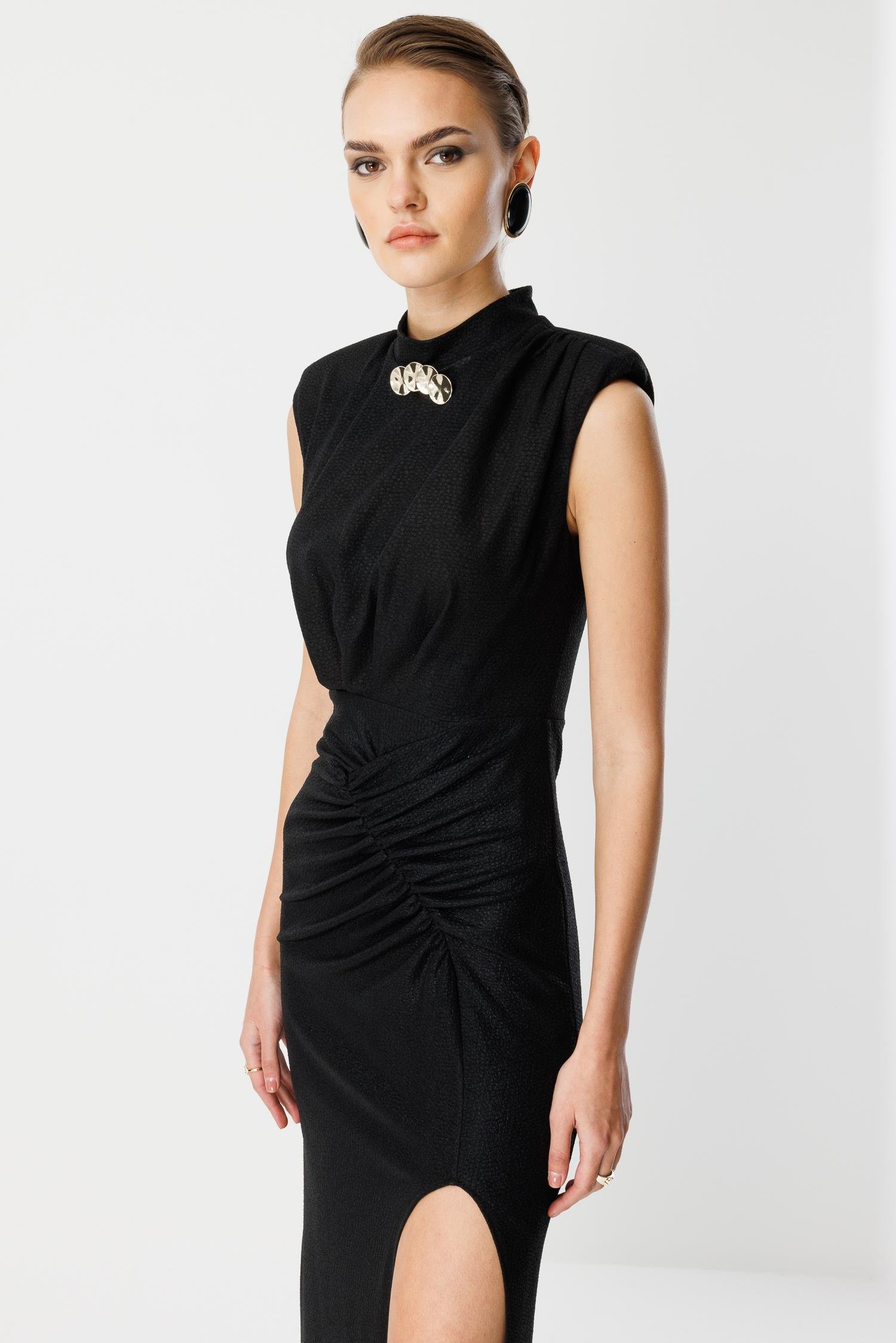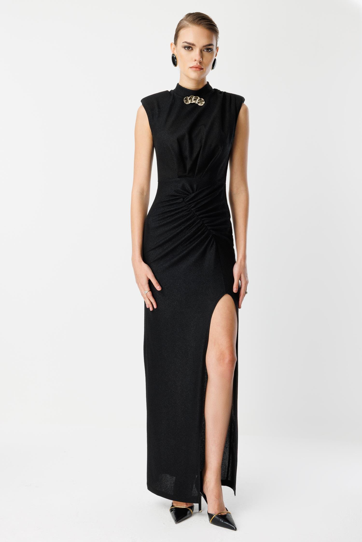 Özel galalar, lüks davetler ve unutulmaz geceler için tasarlanmış, iddialı ve modern bir model. Simli siyah rengin derinliği, dik yaka ve vücudu saran drapaj detaylarıyla birleşerek size benzersiz bir sofistike hava katıyor.