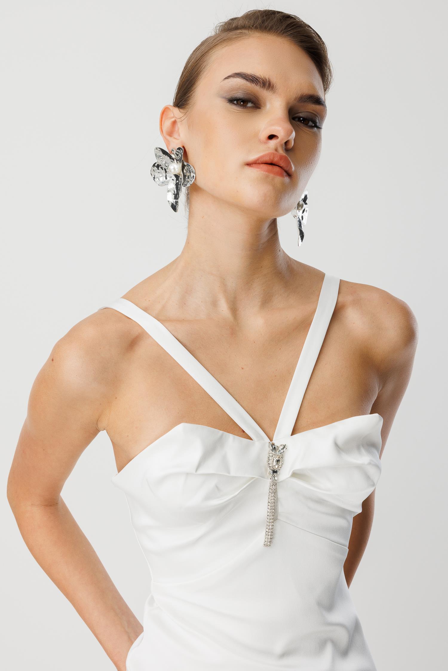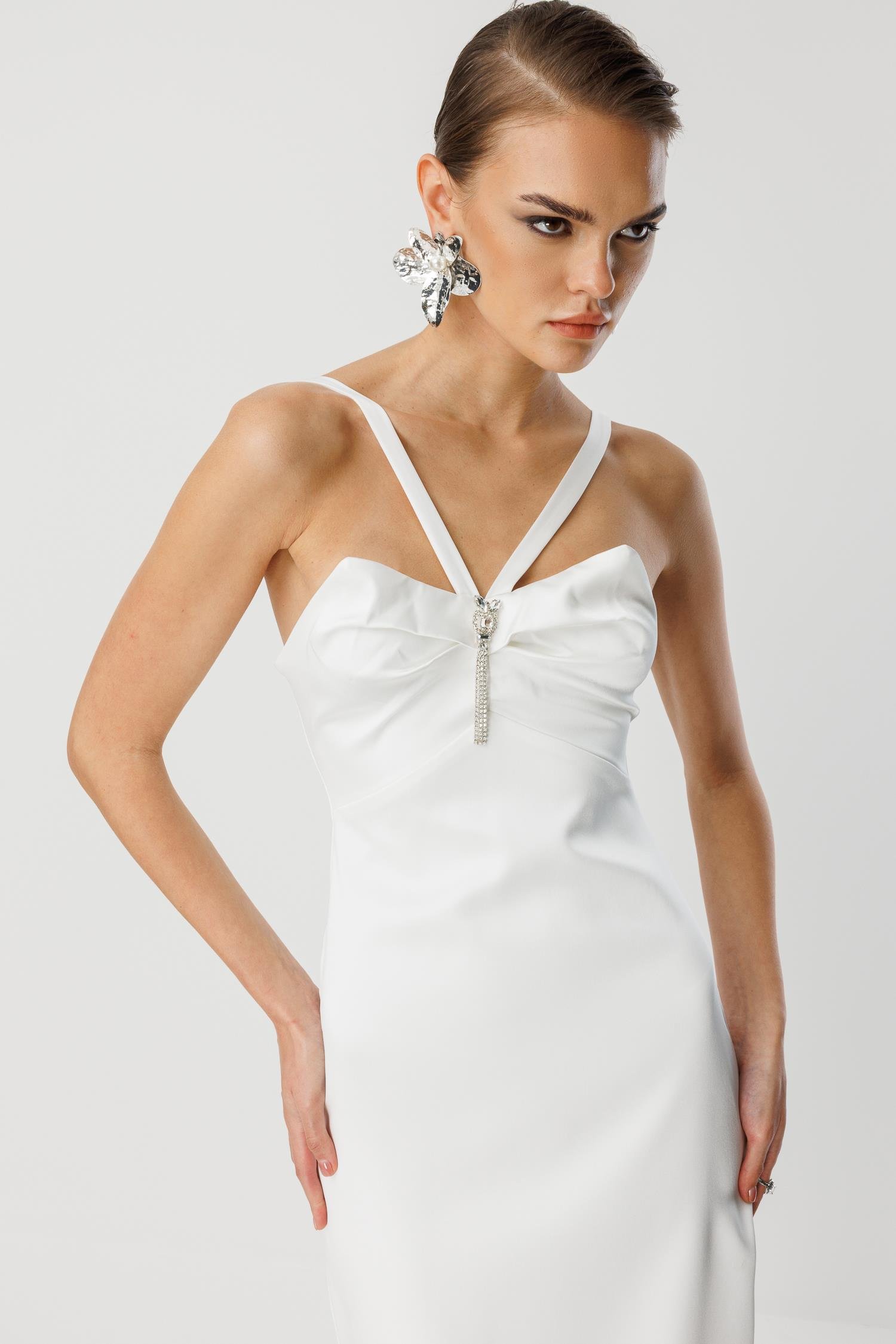 Yaka Askı Detayı: İnce askılar ve göğüsteki ışıltılı taş detayı, feminen ve zarif bir dokunuş sunar.