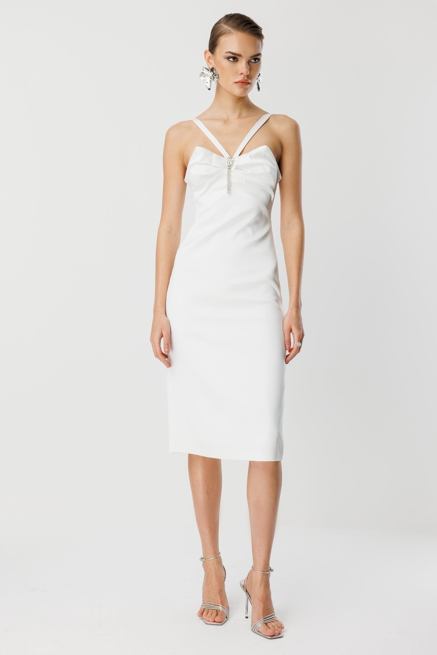 Maksimum Işıltı: Elmas veya zirkon taşlı küpeler ve bileklikler tercih edin. Özellikle askılı versiyonu için gümüş tonlarında ince topuklu sandaletler önerilir.