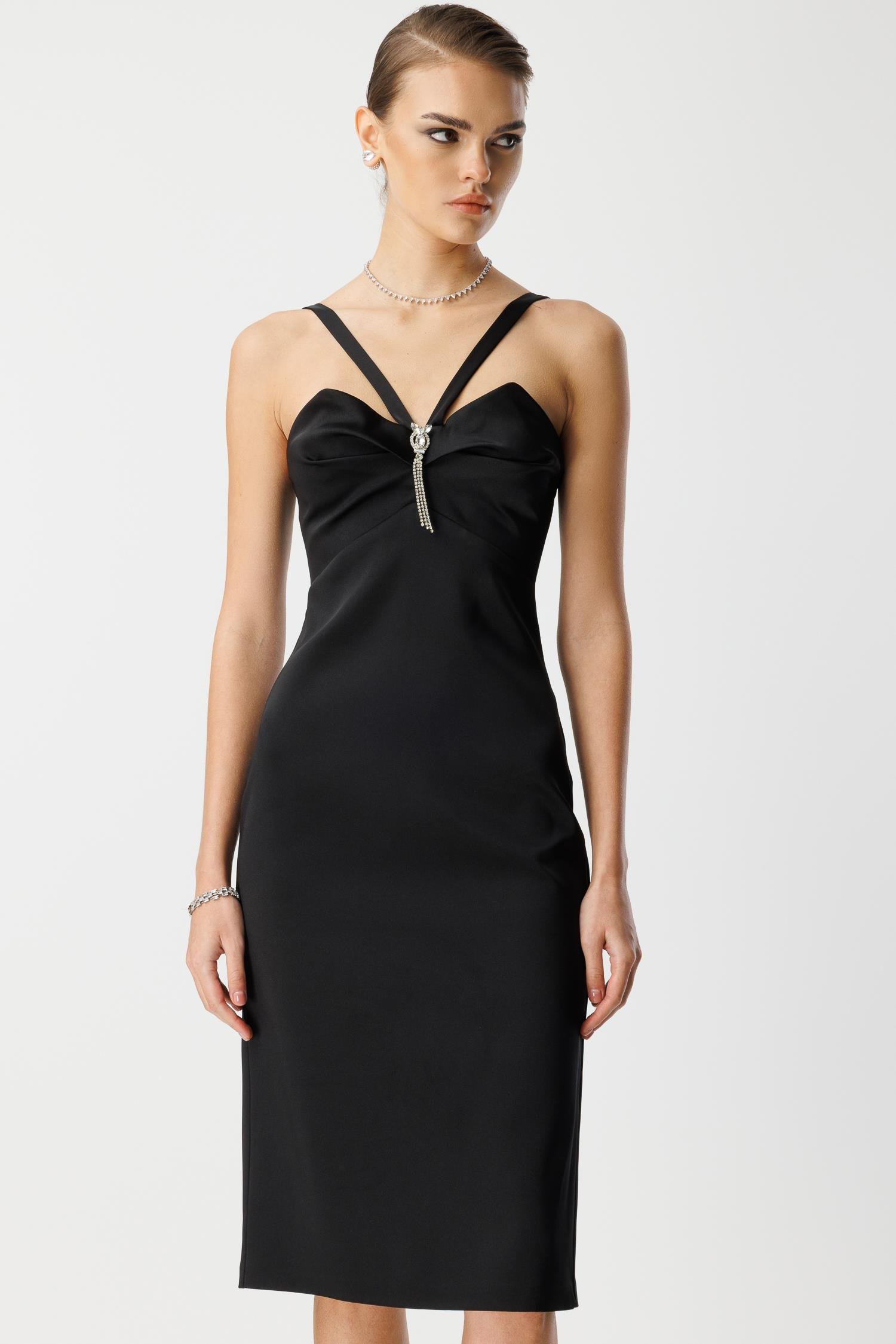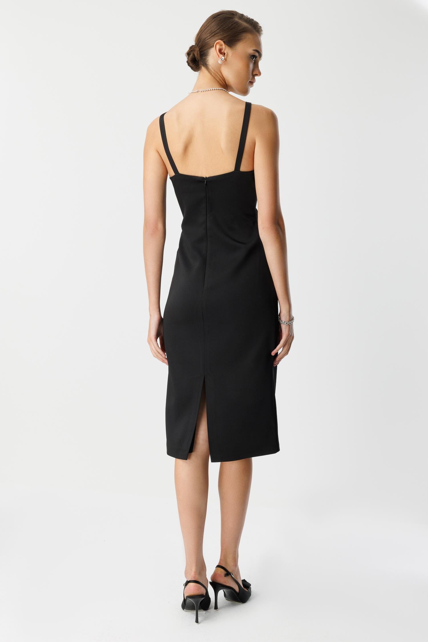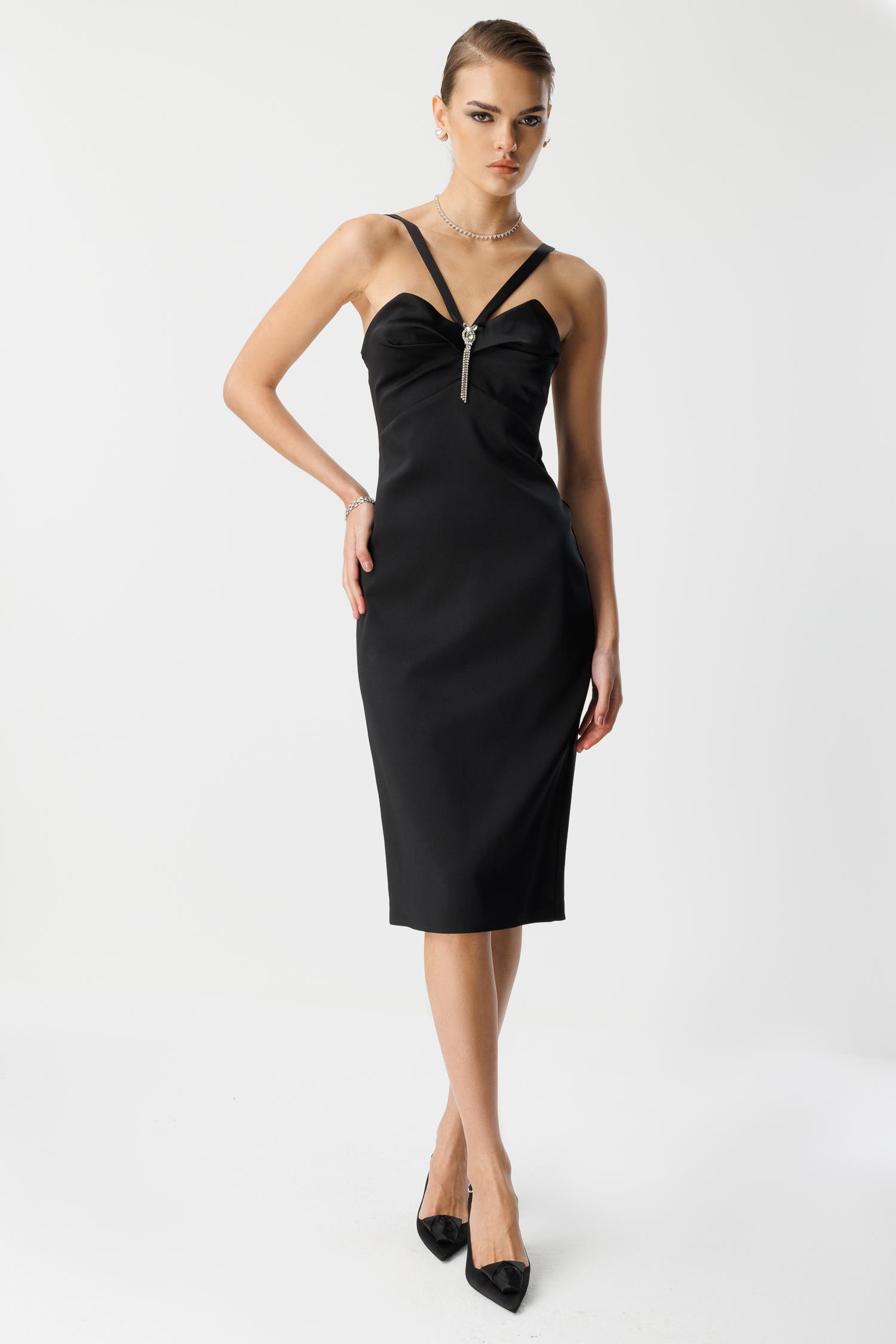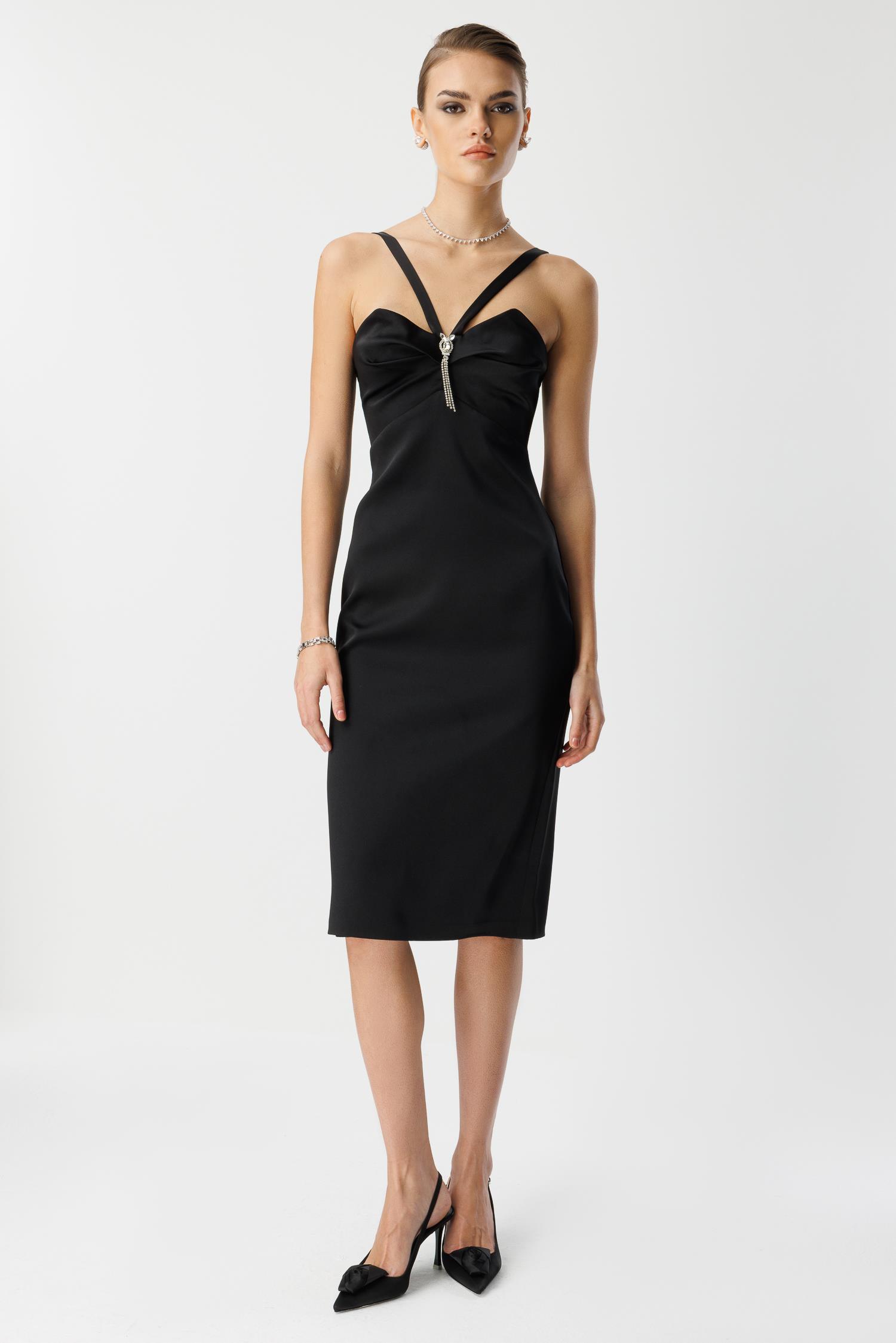 Davetlerinize dramatik ve sofistike bir dokunuş katacak, güçlü bir tasarım. Klasik Siyah rengindeki bu elbise, keskin kesimi ve göğüs/askı detaylarıyla dikkat çekerek çarpıcı bir silüet yaratır.
