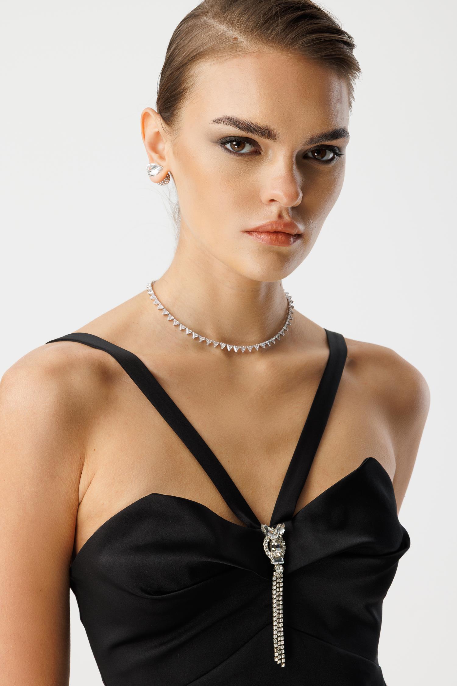 Yaka Askı Detayı: İnce, çapraz askılar ve göğüsteki ışıltılı taş detayı, feminen ve modern bir şıklık sunar.