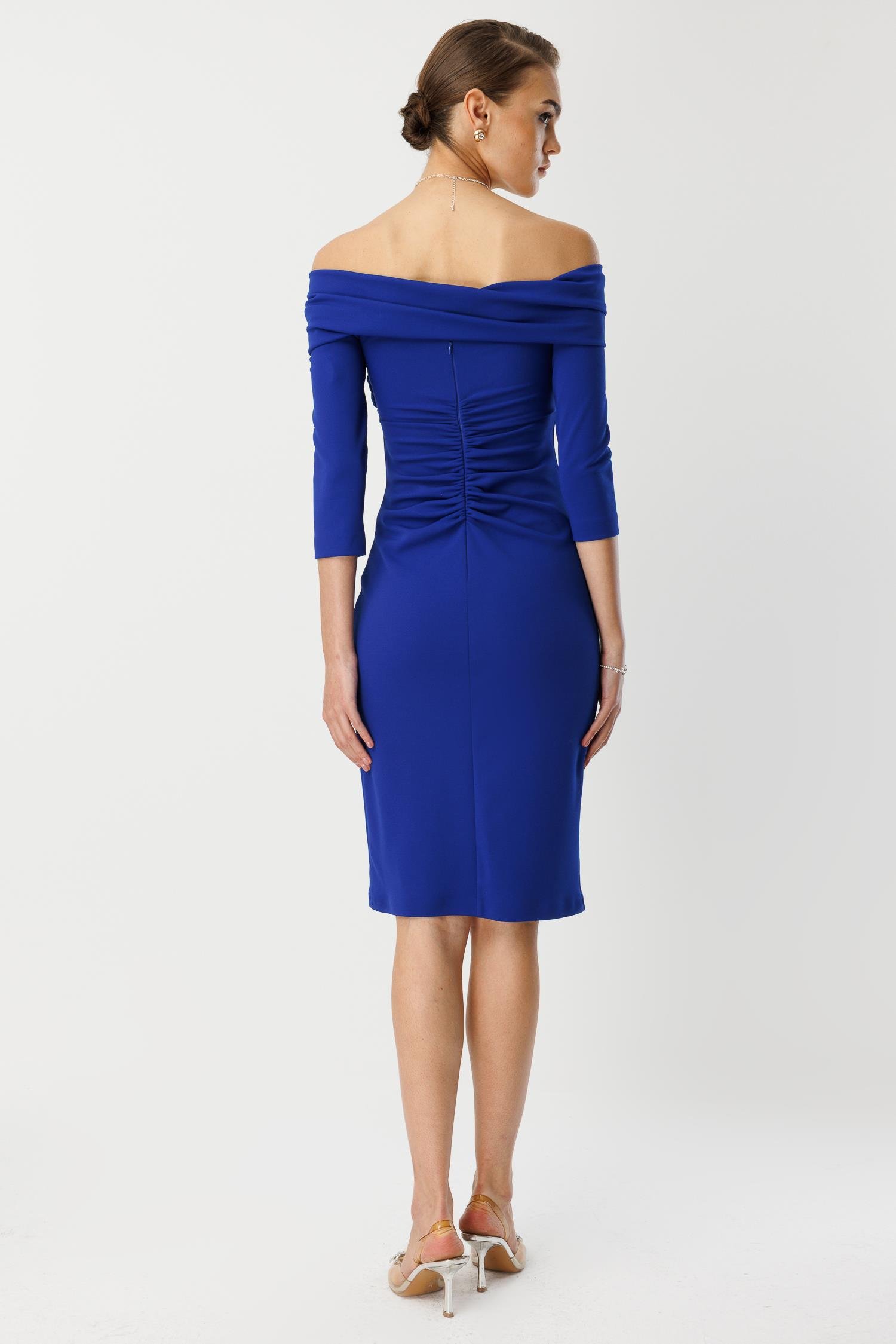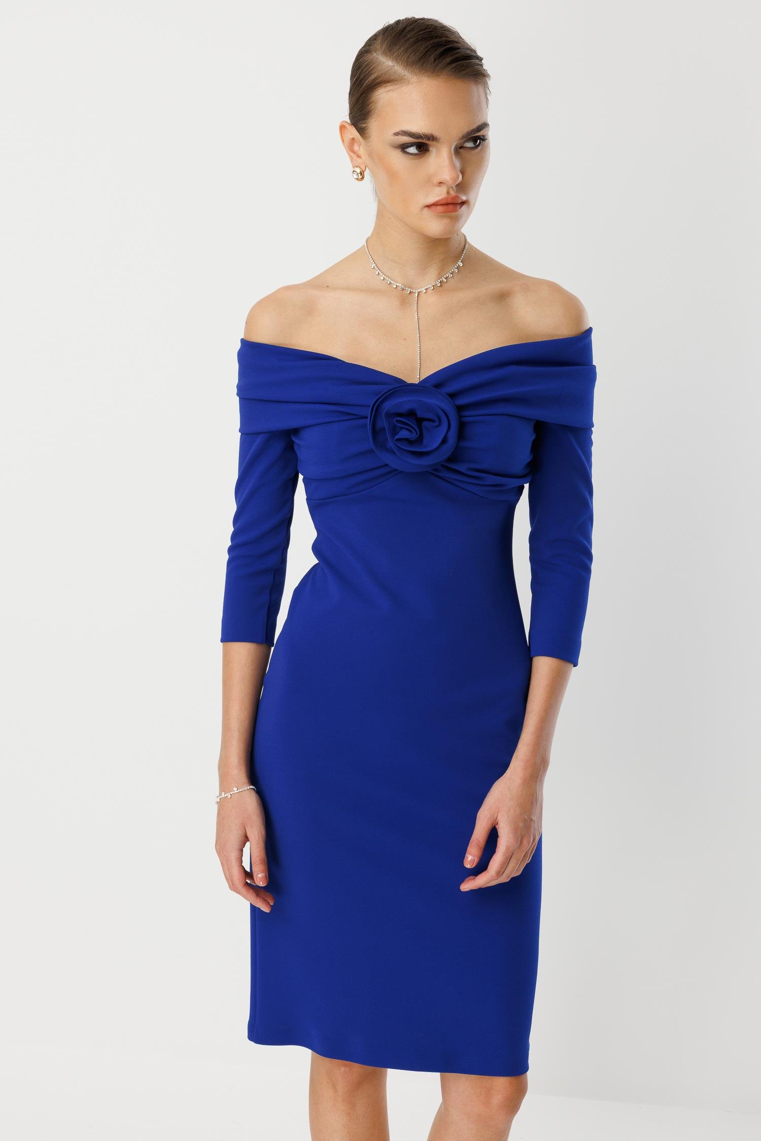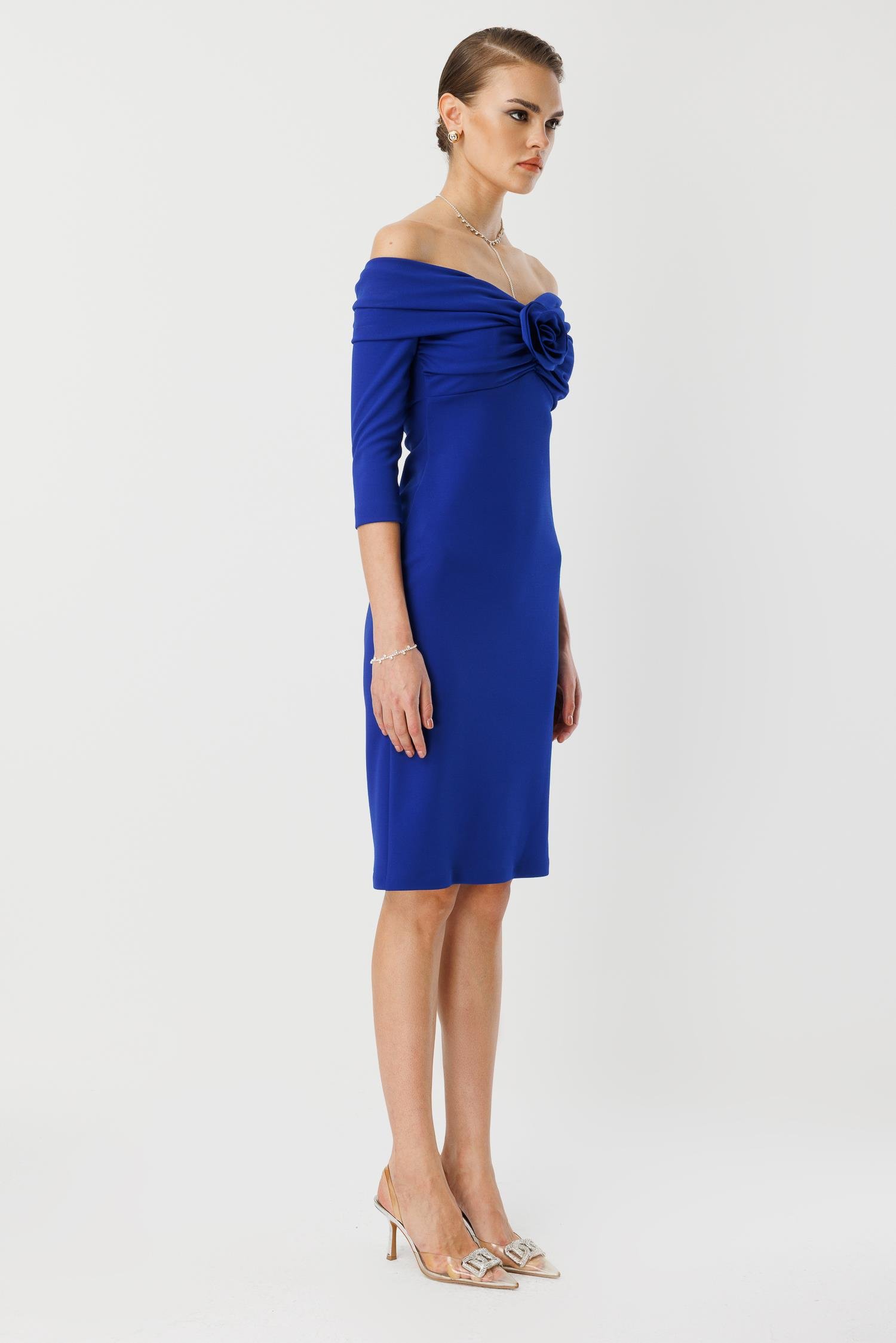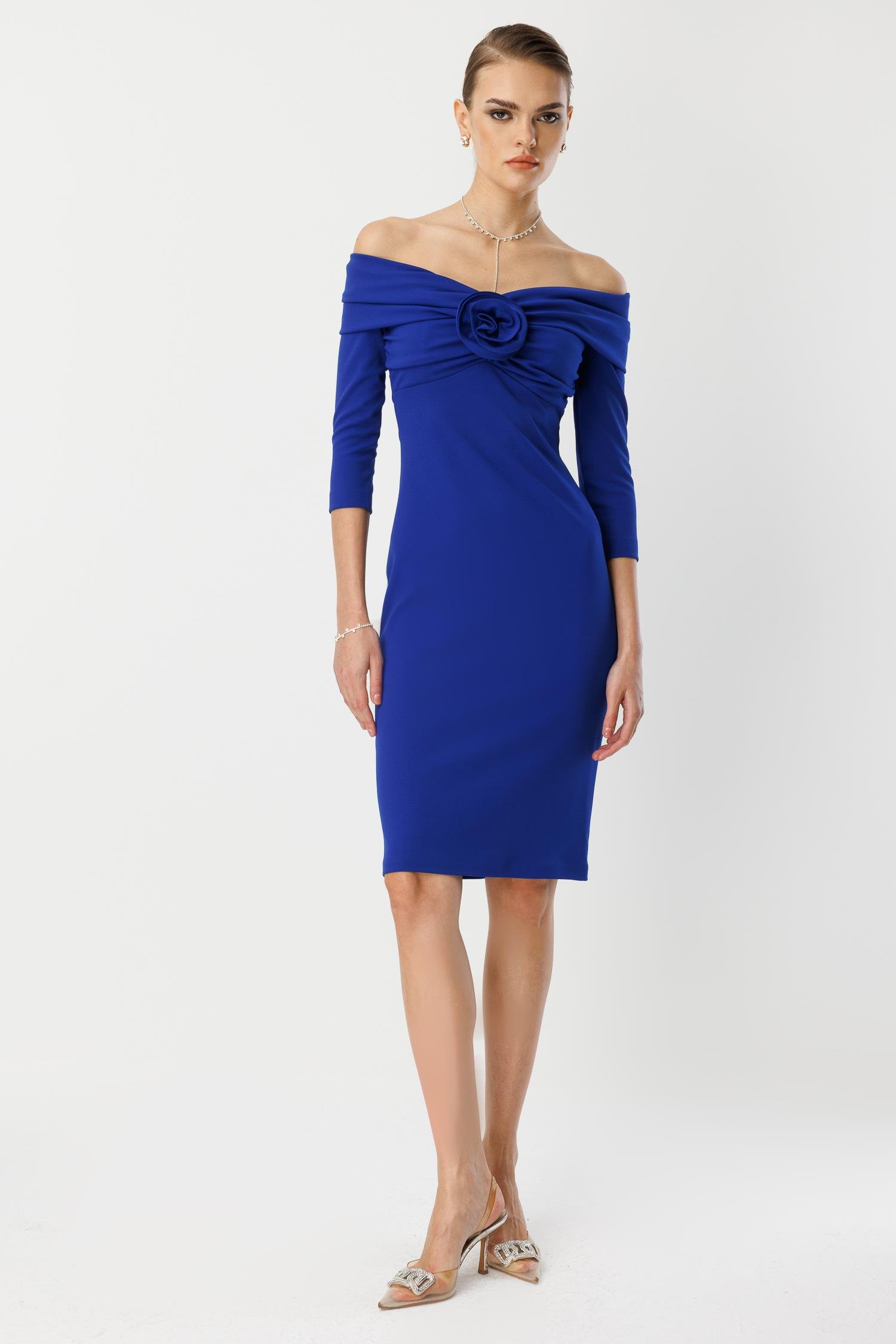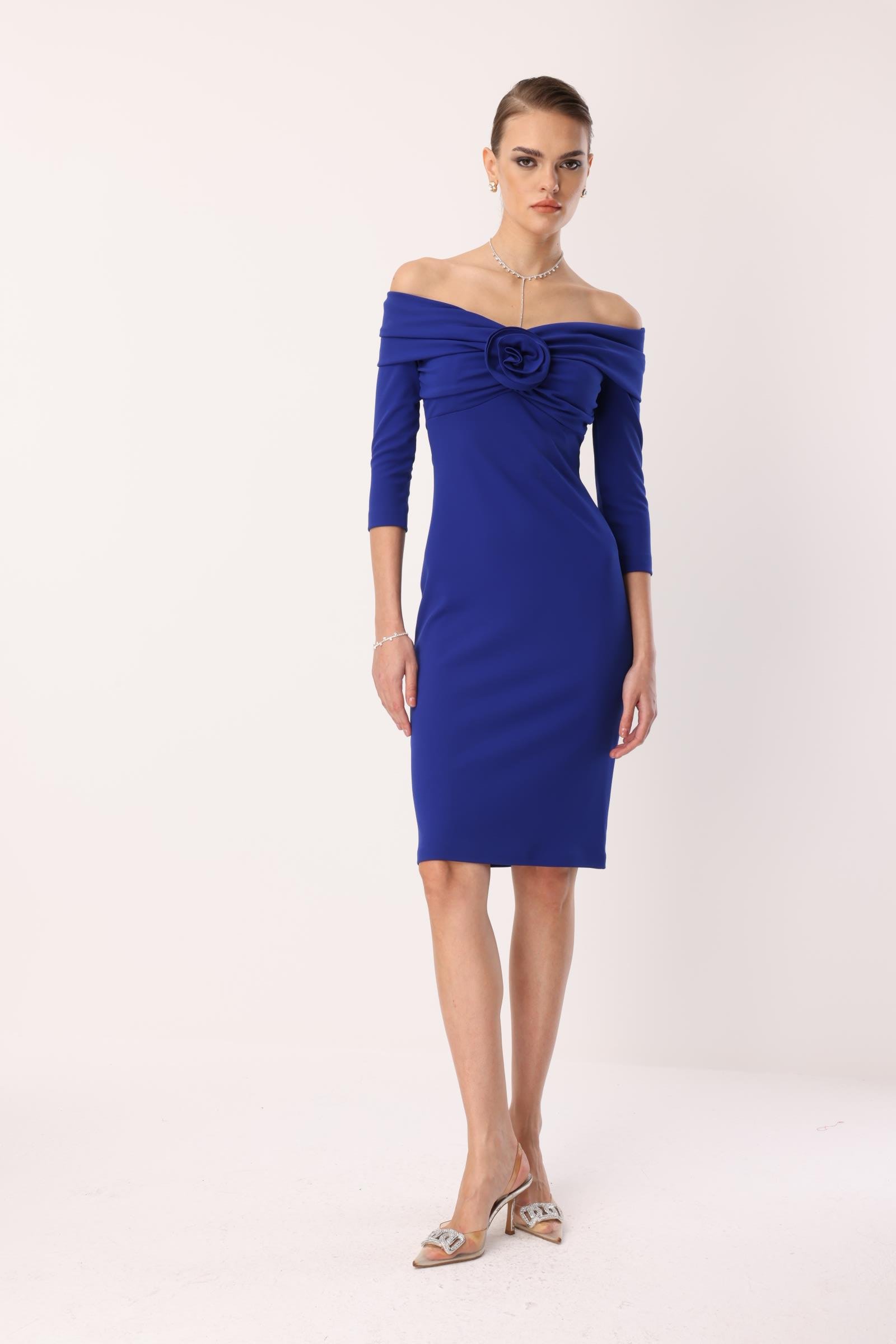 Kokteyl davetleri, şık akşam yemekleri ve özel kutlamalar için tasarlanmış, klasik kesimi modern cazibeyle birleştiren dikkat çekici bir model. Saks Mavi rengin enerjisi ve omuzları açık tasarımın feminenliği, merkezi gül detayıyla birleşerek size göz alıcı bir şıklık sunar.