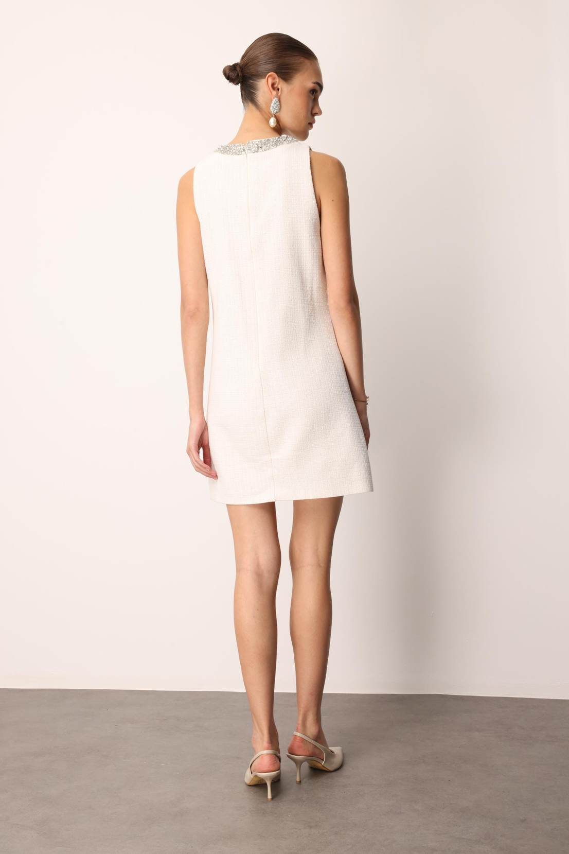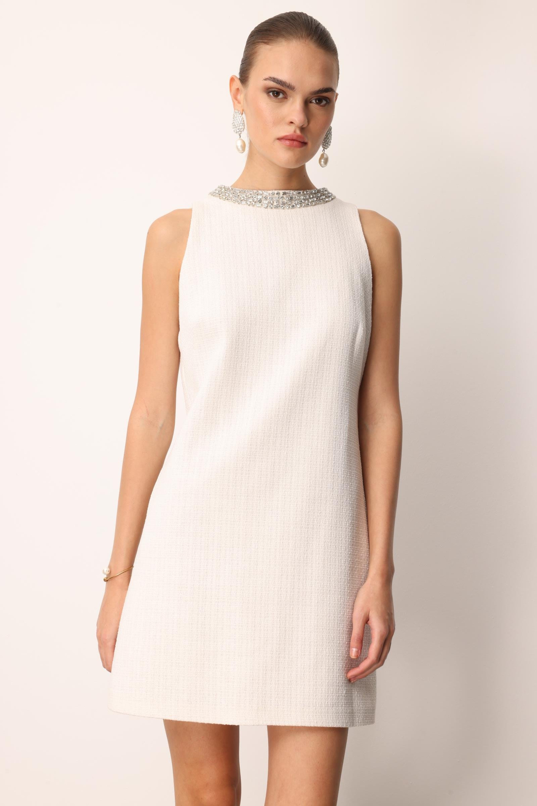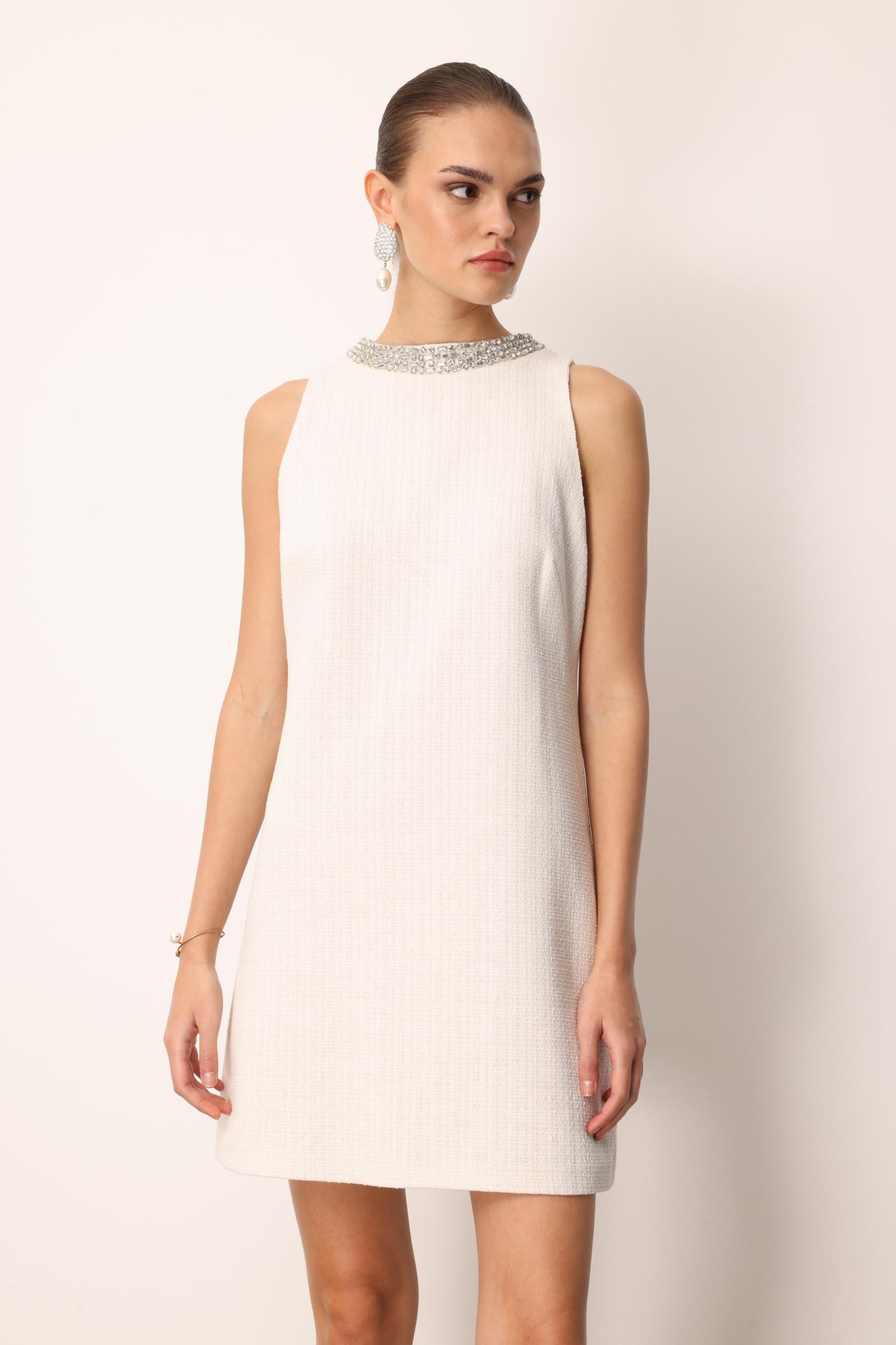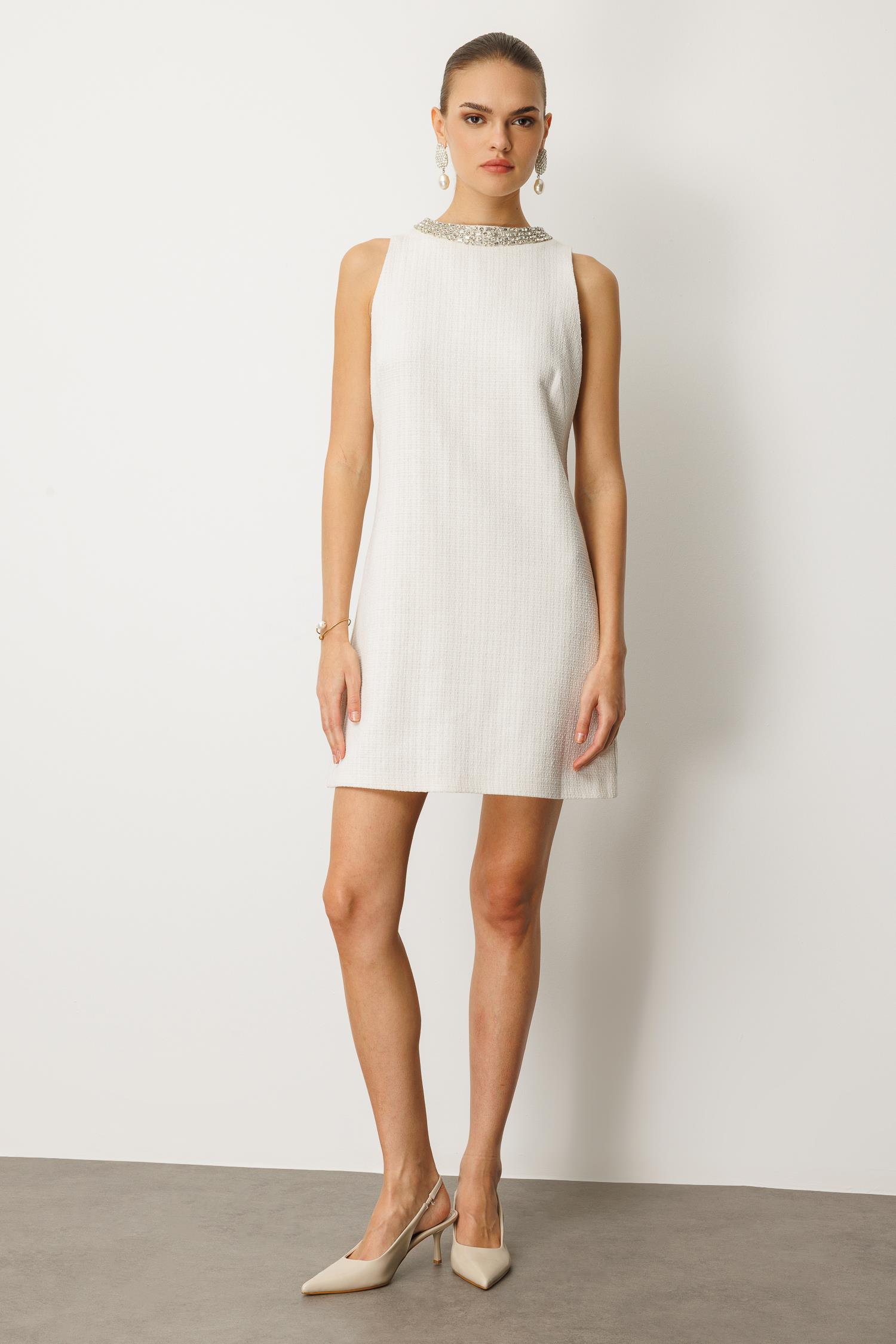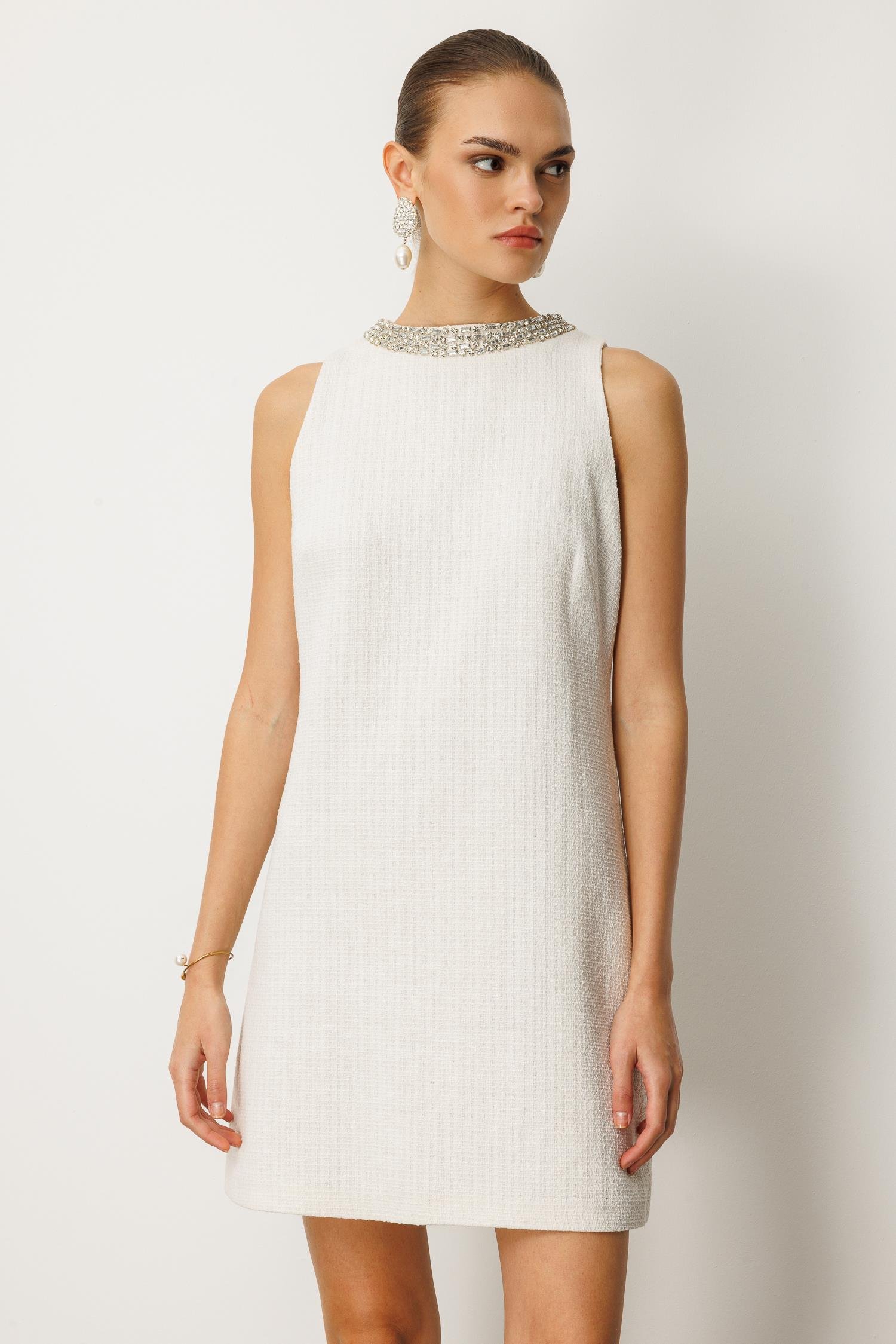 Minimalist kesim, maksimum etki. Bu mini elbise, sade ve düz kesimine rağmen yaka kısmındaki göz alıcı taş şerit detayıyla tüm bakışları üzerine çekiyor. Kusursuz dokusu, onu hem günlük şıklık hem de özel anlar için vazgeçilmez kılıyor.