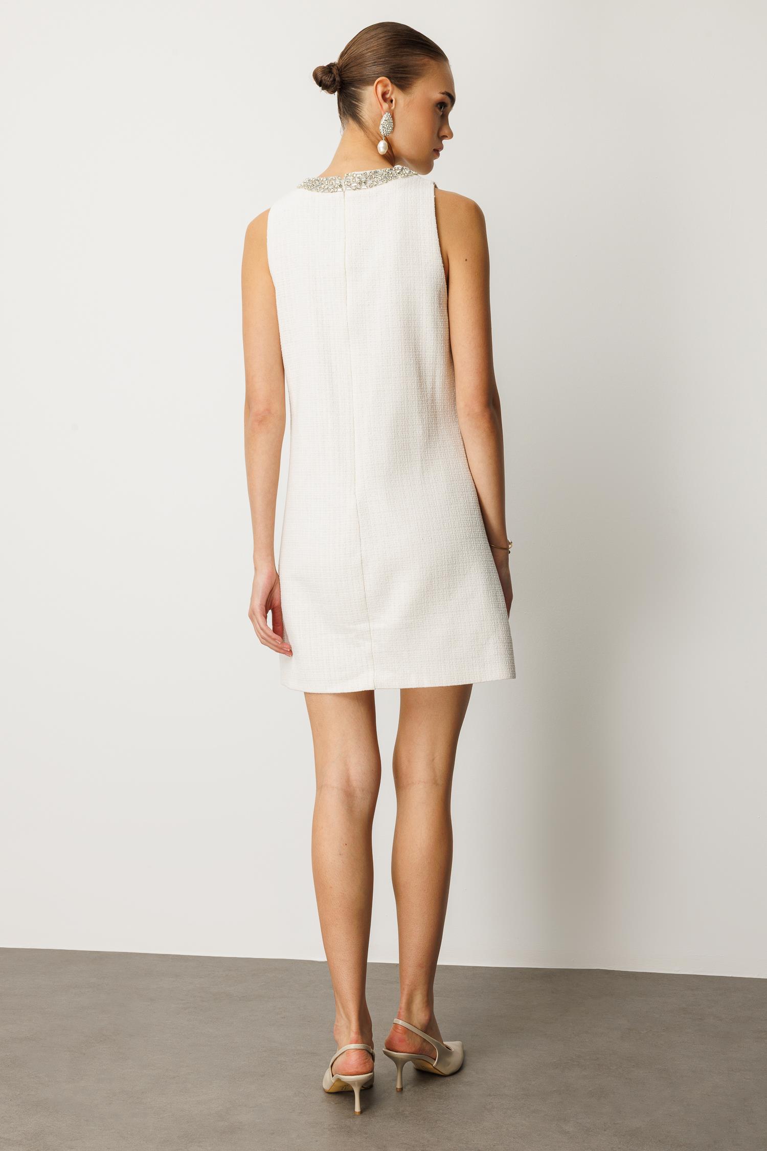 Tasarım: Yuvarlak yaka çevresini saran ışıltılı taş işleme detayı, abartıdan uzak bir lüks sunar.