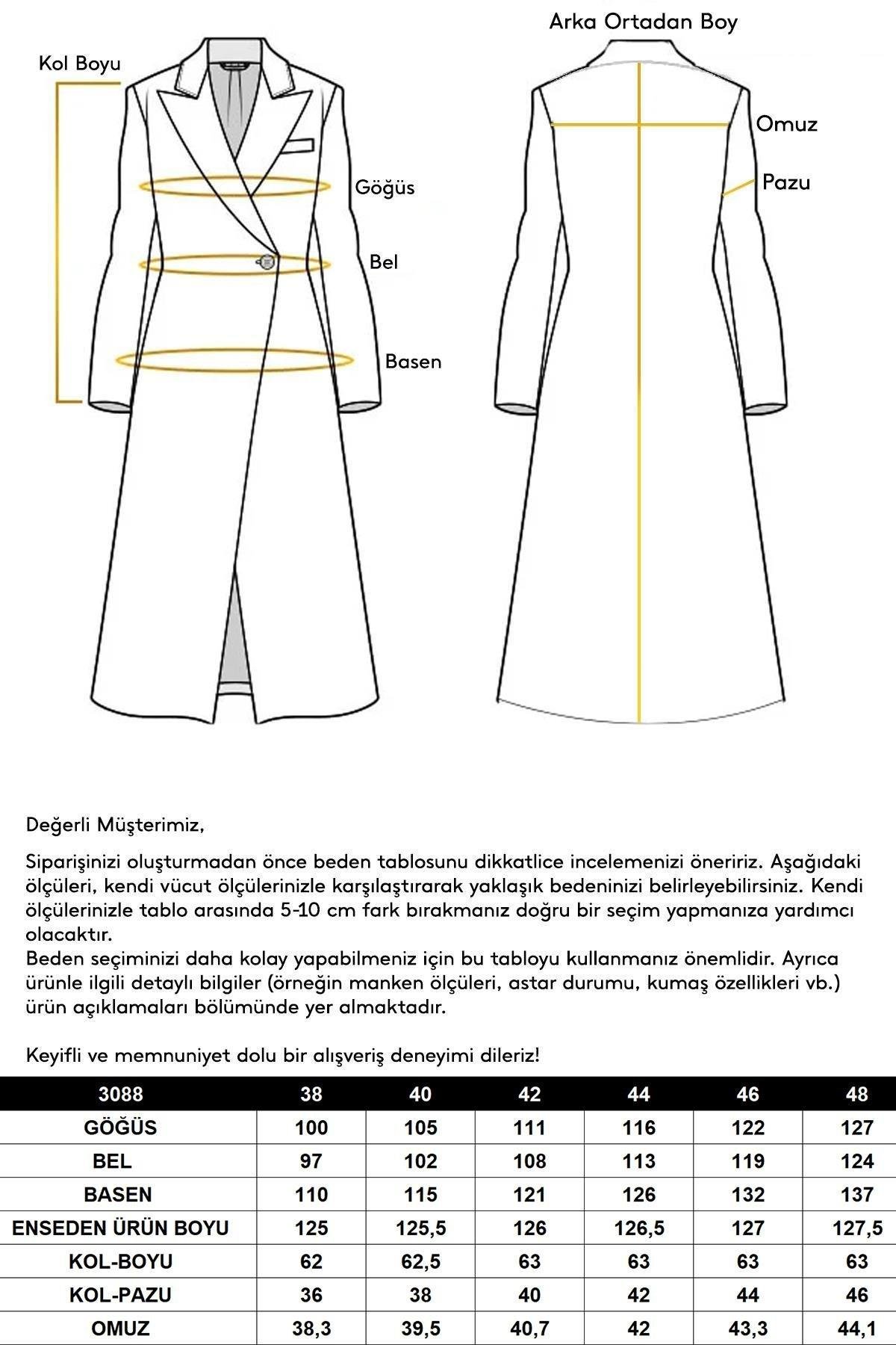 Ürün Bilgisi: Astarlıdır. Tam kalıptır. Bedenler arasındaki fark 5 cm’ dir.