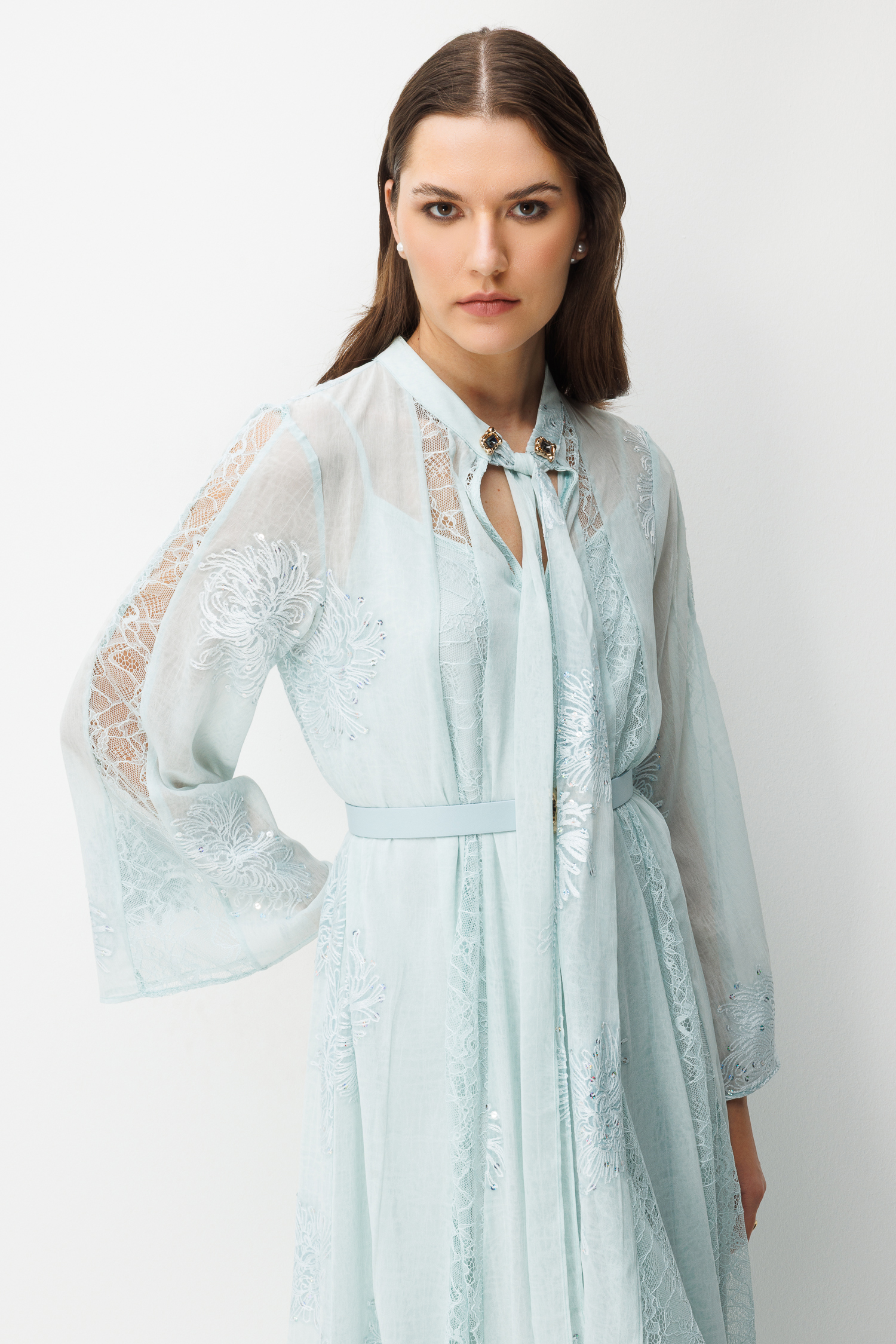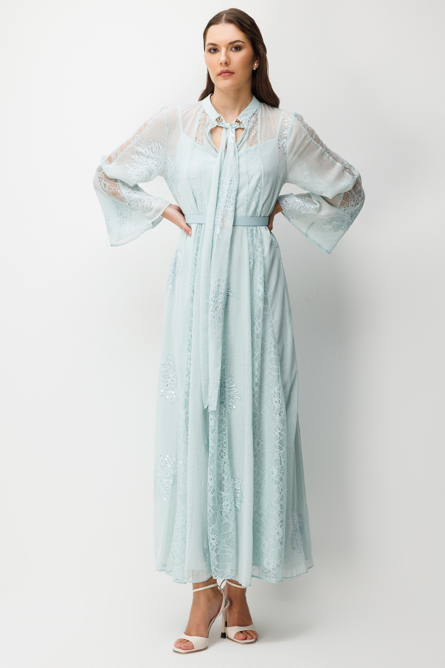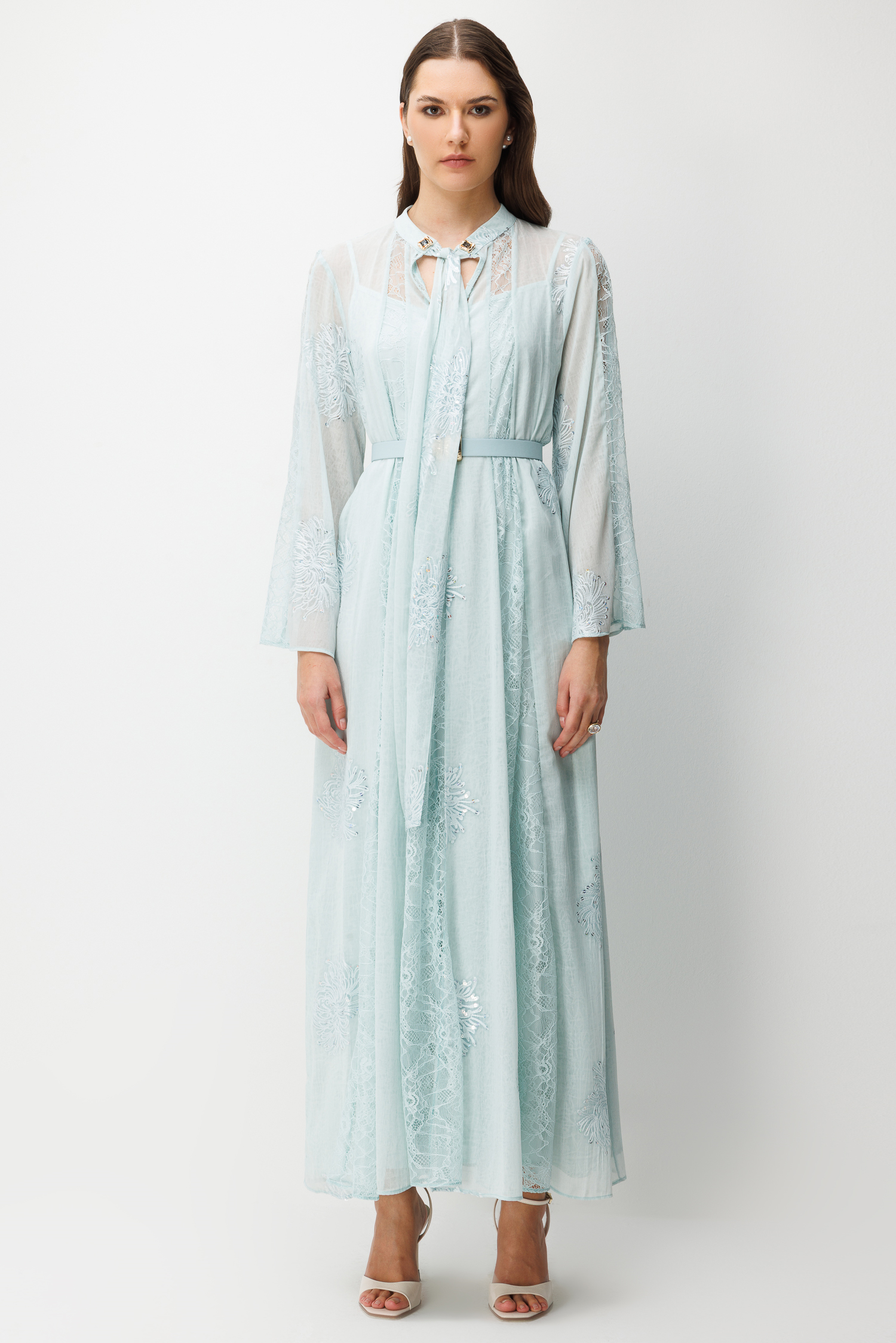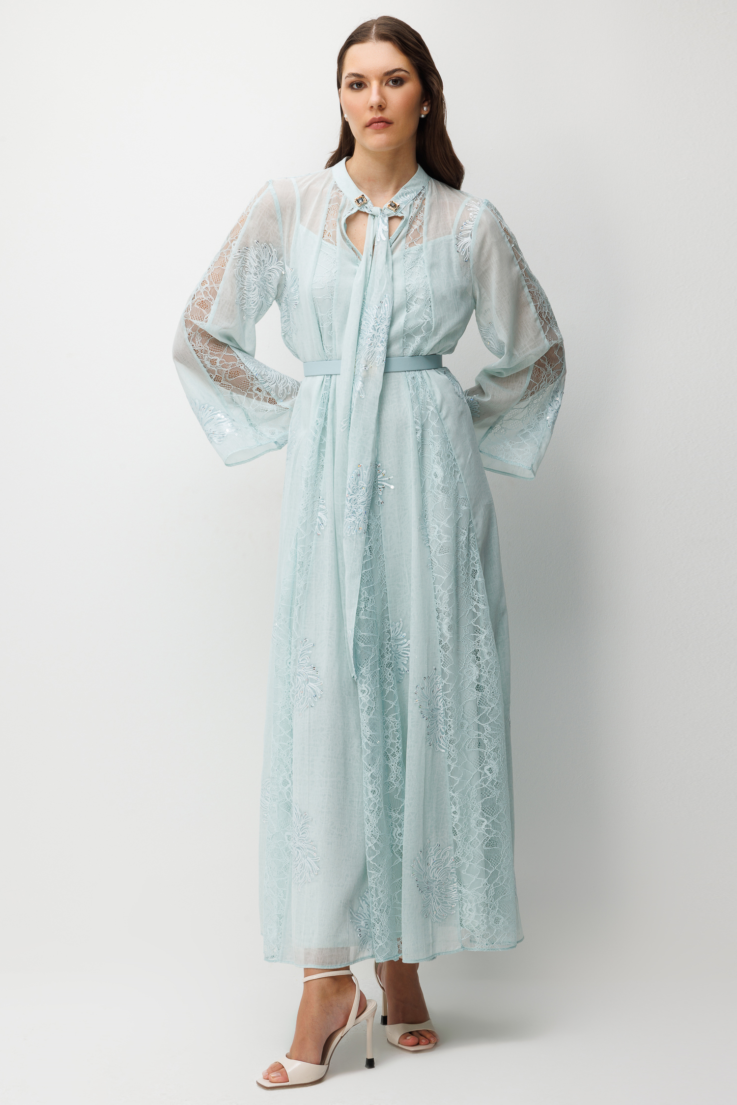 Yaka Şal Bağlama Detay Dantel Şeritli Maxi Boy Elbise MAVİ (216PLN04142-006)