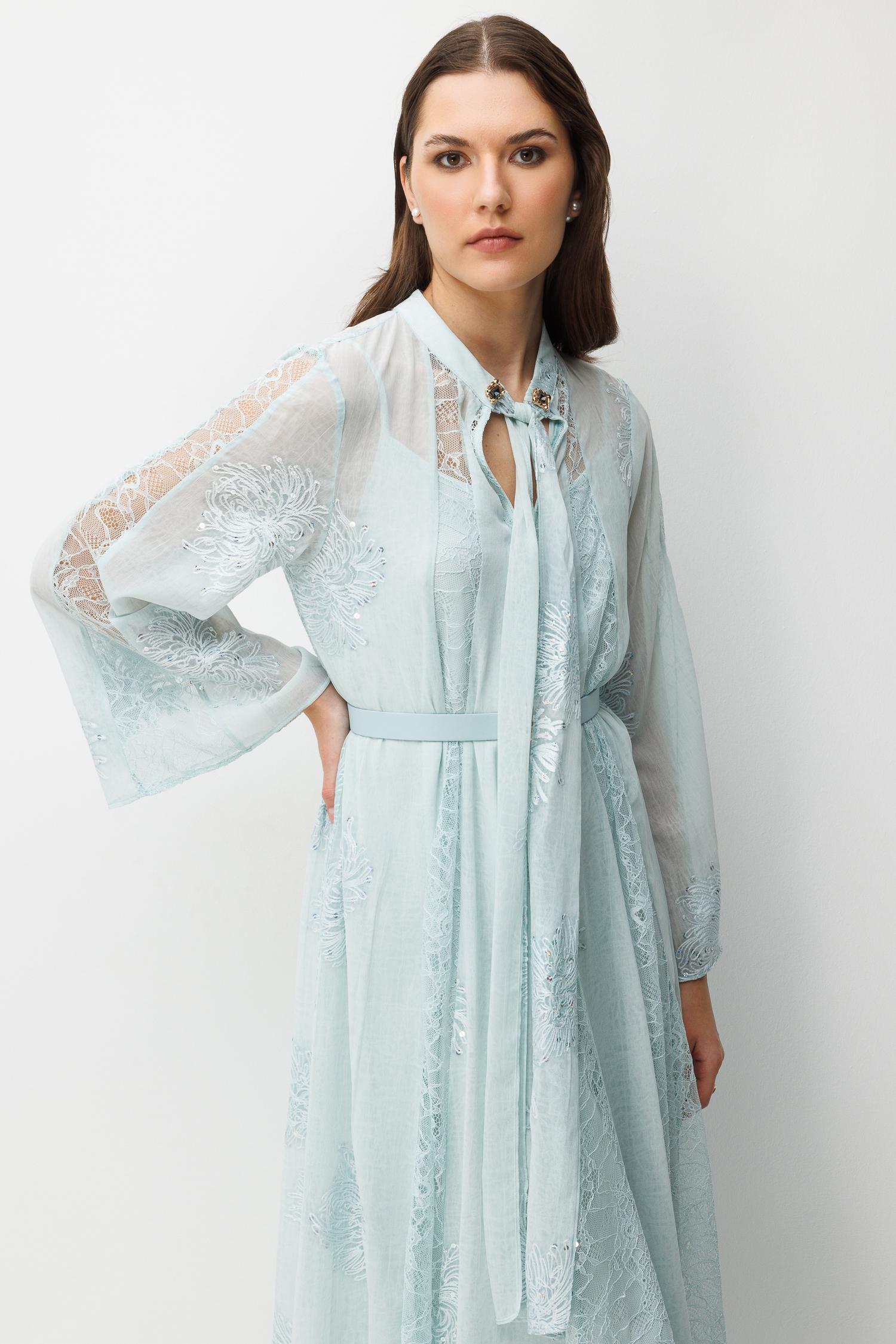 • Kumaş: Hafif ve dökümlü şifon zemin üzerine, floral desenli mikro dantel ve kabartma nakış işlemeleri.