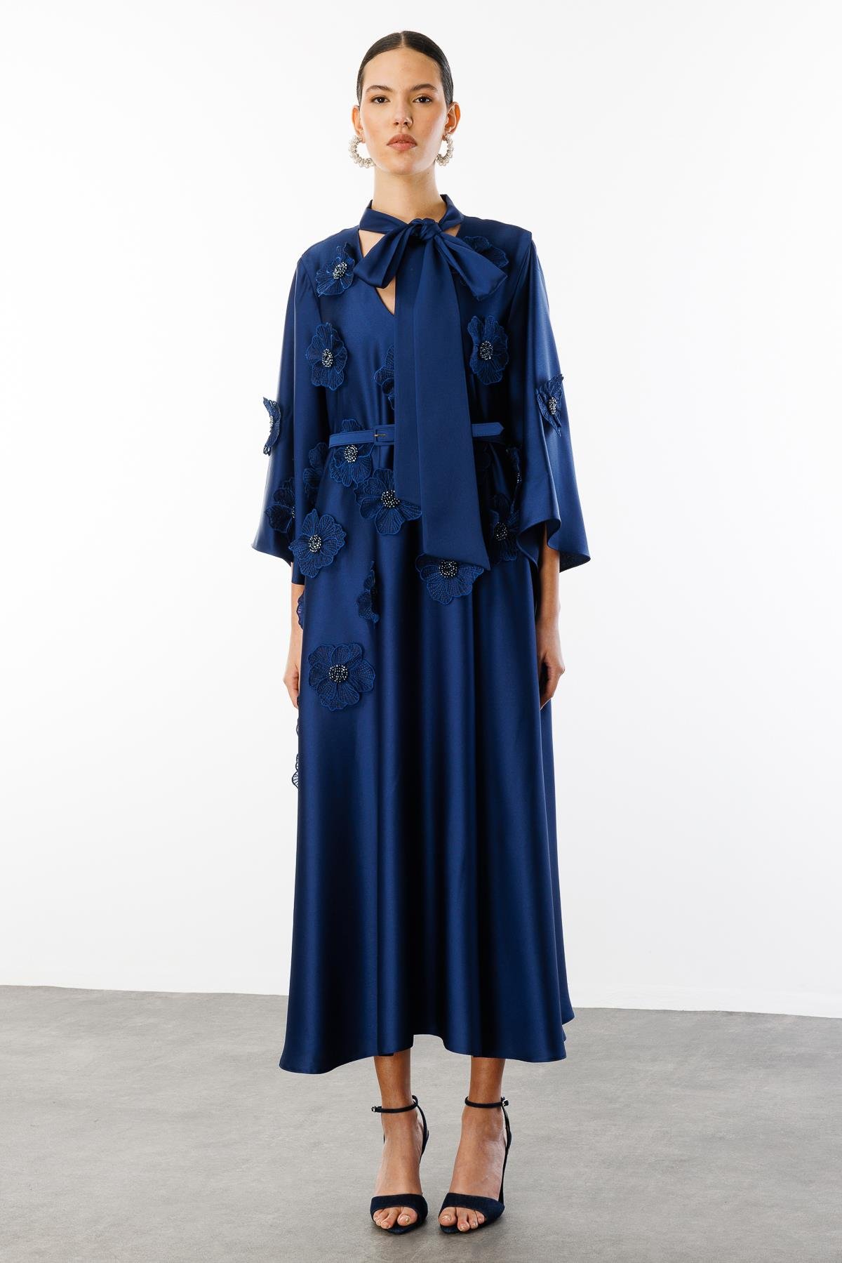 Yaka Şal Bağlamalı Çiçek Detaylı Kemerli Elbise LACİVERT (25Y3135-028)