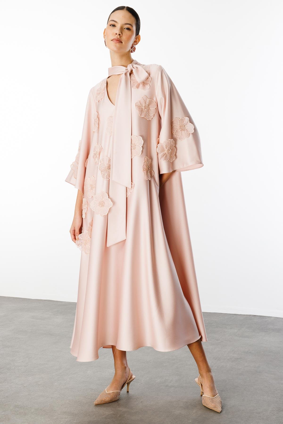 • Özgün Tasarım: Yaka şal bağlaması ve büyük çiçek aplikleri, elbiseye benzersiz ve romantik bir hava katıyor.
